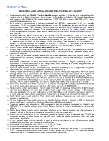 REGULAMIN AKCJI REGULAMIN AKCJI „BON W BONUSIE ZABAWKI NOCĄ 50% TANIEJ” 1. Organizatorem Akcji jest TESCO (Polska) Spółka z o.o. z siedzibą w Krakowie przy ul. Kapelanka 56, zarejestrowaną w Sądzie Rejonowym dla Krakowa – Śródmieścia w Krakowie, XI Wydział Gospodarczy pod numerem KRS 0000016108, kapitał zakładowy 3 503 718 000 zł, numer NIP:526-10-37, zwana dalej TESCO lub Organizatorem. 2. Akcja zostanie przeprowadzona w wybranych sklepach sieci TESCO – hipermarkety (HM) oraz compakt hipermarkety (CHM) na terenie Polski, określonych w pkt. 29 regulaminu. W Akcji nie bierze udziału platforma internetowa TESCO Ezakupy, funkcjonująca pod adresem: http://ezakupy.tesco.pl/, służąca do dokonywania zamówień towarów. Bony będą wydawane w sklepach HM i CHM za zakup zabawek w niżej wymienionych terminach. Bony można zrealizować we wszystkich sklepach TESCO zgodnie z ich datą ważności. 3. Sprzedaż związana z Akcją odbędzie się w nocy z dnia 22 na 23 listopada 2012 roku, w nocy z dnia 23 na 24 listopada 2012 roku oraz w nocy z dnia 24 na 25 listopada 2012 roku w godzinach między 21:00 a 06:00 lub do zamknięcia sklepów. Wyjątek stanowią sklepy HM: Wrocław, ul. Czekoladowa 11, Kielce, ul. Świętokrzyska 20, Łódź, ul. Piłsudskiego 15/23 oraz sklepy CHM: Ropczyce, ul. Grunwaldzka 41, Sieradz, ul. Wojska Polskiego 11, Końskie, ul. Staszica 1, Kluczbork, ul. Byczyńska 101, gdzie Akcja trwać będzie w wyżej wymienionych terminach od godziny 19:00 do zamknięcia sklepów. 4. Termin odbioru bonów upływa w dniu 31 grudnia 2012 r. 5. W Akcji mogą wziąć udział wyłącznie osoby posiadające kartę CLUBCARD oraz posiadające paragon, potwierdzający dokonanie w terminie określonym w pkt. 3 zakupu produktów z kategorii objętej Akcją, zwane dalej Klientami. 6. Akcją objęte są wszystkie artykuły pochodzące ze stoiska ZABAWKI. Akcja nie dotyczy konsoli, gier komputerowych i na konsole, zestawów edukacyjnych, książek, zabawek dla niemowląt i asortymentu sportowego. 7. Warunkiem uczestnictwa w Akcji jest zakup dowolnych towarów z kategorii określonej w pkt. 6 regulaminu, w terminie określonym w pkt. 3 regulaminu za co najmniej 10 zł brutto, zarejestrowany na jednym paragonie z użyciem karty CLUBCARD. 8. Za każde pełne wydane 10 zł na dowolne towary z kategorii określonej w pkt. 6 regulaminu z użyciem karty CLUBCARD klientowi przysługuje bon towarowy o wartości 5 zł. 9. Każdy paragon dokumentujący sprzedaż spełniającą warunki niniejszego regulaminu zawierał będzie pozycję informującą o uprawnieniu do odbioru bonu towarowego. Za każde pełne 10 zł wydane na dowolne towary z kategorii określonej w pkt. 6 regulaminu na paragonie pojawi się pozycja „0,01A” – jest to informacja o uprawnieniu do odbioru 1 bonu towarowego o wartości 5 zł. Przykład: Klient zrobił zakupy z asortymentu określonego w pkt. 6 na kwotę 34,93 zł, co oznacza, że na paragonie pojawi się pozycja „-0,03A”. Jest to informacja, że klientowi przysługują 3 bony po 5 zł, czyli 15 zł w bonach. 10. Klient może otrzymać bony tylko i wyłącznie w momencie użycia przy transakcji karty CLUBCARD. Klient nie otrzyma bonów, jeśli paragon nie zawiera informacji o użyciu karty CLUBCARD. 11. Wprowadzone zostało ograniczenie – Klient może otrzymać bony za zakup maksymalnie 3 identycznych zabawek, posiadających ten sam kod kreskowy EAN. Jeżeli Klient dokona zakupu 4 identycznych zabawek, posiadających ten sam kod kreskowy EAN zidentyfikowanych na jednym paragonie fiskalnym, to może otrzymać jedynie bony przyznane do maksymalnie 3 zakupionych identycznych zabawek. 12. Każdy Klient może wziąć udział w Akcji wielokrotnie, jednakże każdorazowo musi spełnić warunki zawarte w regulaminie. 13. W celu otrzymania bonu należy udać się do Punktu Obsługi Klienta w sklepie, w którym dokonano zakupu zgodnego z regulaminem Akcji oraz okazać dowód dokonania zakupu. 14. Pracownik wydając bon odnotuje ten fakt na paragonie poprzez wpisanie na paragonie: „Wydano bon ZABAWKI”. W przypadku odbioru przez Klienta faktury, adnotacja zostanie zamieszczona na odwrocie faktury. 15. Odbiór bonu Klient kwituje swoim podpisem. Złożenie przez Klienta podpisu jest równoznaczne z wzięciem udziału w Akcji oraz z akceptacją warunków niniejszego regulaminu. 16. Bony mogą być realizowane w celu dokonania zapłaty za zakupy jedynie w sklepach sieci TESCO. W przypadku zakupu za niższą kwotę niż wartość bonu reszta nie będzie wydawana. Bony nie będą wymieniane na gotówkę. 17. W celu realizacji bonu, podczas płatności w kasie w terminie określonym w pkt. 18 regulaminu, należy przekazać pracownikowi kasy otrzymany wcześniej bon. 18. Bony ważne będą w okresie od 01.12.2012 do 31.12.2012 roku. 19. Bony można realizować we wszystkich sklepach TESCO. 20. W przypadku chwilowego wyczerpania bonów, w terminie, o którym mowa w pkt. 3 i 4 regulaminu, TESCO zobowiązuje się wyznaczyć nowy termin odbioru bonów, nie później niż 5 dni roboczych od daty zakończenia Akcji. Po upływie tego terminu, bony nie będą wydawane. 21. Zwrot towaru objętego Akcją (zgodnie z polityką TESCO o możliwości zwrotu towaru pełnowartościowego), na podstawie paragonu, do którego wydano bon, powoduje pomniejszenie wartości zwracanego towaru o wartość wydanych bonów TESCO. 22. Postanowienia niniejszego Regulaminu nie wyłączają ani nie ograniczają uprawnień przysługujących Klientowi na podstawie obowiązującego prawa, w tym dotyczących niezgodności towaru z umową sprzedaży konsumenckiej. 23. Treść niniejszego regulaminu będzie udostępniona w okresie trwania Akcji na stronie www.tesco.pl 24. Regulamin Akcji jest jedynym dokumentem określającym zasady jej przeprowadzania. 25. Organizator Akcji ponosi pełną odpowiedzialność za treść regulaminu, przebieg Akcji, wydanie bonów oraz rozpatrzenie ewentualnych reklam