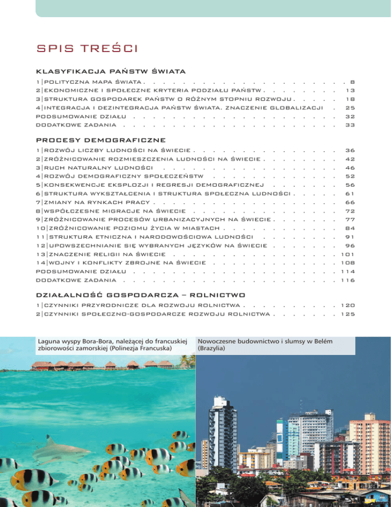 SPIS TREŚCI KLASYFIKACJA PAŃSTW ŚWIATA 1|POLITYCZNA MAPA ŚWIATA . . . . . . . . . . . . . . . . . . 2|EKONOMICZNE I SPOŁECZNE KRYTERIA PODZIAŁU PAŃSTW . . . . . . 3|STRUKTURA GOSPODAREK PAŃSTW O RÓŻNYM STOPNIU ROZWOJU . . . 4|INTEGRACJA I DEZINTEGRACJA PAŃSTW ŚWIATA. ZNACZENIE GLOBALIZACJI PODSUMOWANIE DZIAŁU . . . . . . . . . . . . . . . . . . . . DODATKOWE ZADANIA . . . . . . . . . . . . . . . . . . . . . . . . . . 8 . 13 . 18 . 25 . 32 . 33 PROCESY DEMOGRAFICZNE 1|ROZWÓJ LICZBY LUDNOŚCI NA ŚWIECIE . . . . . . . . . . 2|ZRÓŻNICOWANIE ROZMIESZCZENIA LUDNOŚCI NA ŚWIECIE . . . 3|RUCH NATURALNY LUDNOŚCI . . . . . . . . . . . . . . 4|ROZWÓJ DEMOGRAFICZNY SPOŁECZEŃSTW . . . . . . . . . 5|KONSEKWENCJE EKSPLOZJI I REGRESJI DEMOGRAFICZNEJ . . . 6|STRUKTURA WYKSZTAŁCENIA I STRUKTURA SPOŁECZNA LUDNOŚCI 7|ZMIANY NA RYNKACH PRACY . . . . . . . . . . . . . . 8|WSPÓŁCZESNE MIGRACJE NA ŚWIECIE . . . . . . . . . . 9|ZRÓŻNICOWANIE PROCESÓW URBANIZACYJNYCH NA ŚWIECIE . . 10|ZRÓŻNICOWANIE POZIOMU ŻYCIA W MIASTACH . . . . . . . 11|STRUKTURA ETNICZNA I NARODOWOŚCIOWA LUDNOŚCI . . . . 12|UPOWSZECHNIANIE SIĘ WYBRANYCH JĘZYKÓW NA ŚWIECIE . . 13|ZNACZENIE RELIGII NA ŚWIECIE . . . . . . . . . . . . 14|WOJNY I KONFLIKTY ZBROJNE NA ŚWIECIE . . . . . . . . PODSUMOWANIE DZIAŁU . . . . . . . . . . . . . . . . DODATKOWE ZADANIA . . . . . . . . . . . . . . . . . . . . . . . . . . . . . . . . . . . . . . . . . . . . . . . . . . . . . . . . . . . . . . . . . . . . . . . . . . . . . . . . . . . . . . . . 36 42 46 52 56 61 66 . 72 . 77 . 84 . 91 . 96 . 101 . 108 . 114 . 116 DZIAŁALNOŚĆ GOSPODARCZA – ROLNICTWO 1|CZYNNIKI PRZYRODNICZE DLA ROZWOJU ROLNICTWA . . . . 2|CZYNNIKI SPOŁECZNO-GOSPODARCZE ROZWOJU ROLNICTWA . Laguna wyspy Bora-Bora, należącej do francuskiej zbiorowości zamorskiej (Polinezja Francuska) . . . . . . . . . . Nowoczesne budownictwo i slumsy w Belém (Brazylia) 120 125 SPIS TREŚCI 3|PRODUKCJA ROŚLINNA NA ŚWIECIE . . 4|CHÓW ZWIERZĄT NA ŚWIECIE . . . . . 5|ŻYWNOŚĆ GENETYCZNIE MODYFIKOWANA 6|WYŻYWIENIE LUDNOŚCI ŚWIATA . . . . 7|LASY DOBRODZIEJSTWEM ZIEMI . . . . 8|WYKORZYSTANIE OCEANÓW I MÓRZ . . . PODSUMOWANIE DZIAŁU . . . . . . . DODATKOWE ZADANIA . . . . . . . . . . . . 131 139 . . . . . . . . . . . . . . 146 . . . . . . . . . . . . . 151 . . . . . . . . . . . . . 157 . . . . . . . . . . . . . 163 . . . . . . . . . . . . . . 169 . . . . . . . . . . . . . . 170 . . . . . . . . . . . . . . . . . . . . . . . DZIAŁALNOŚĆ GOSPODARCZA – PRZEMYSŁ 1|ZASOBY NATURALNE ZIEMI . . . . . . . . . . . . . . . . 2|ZMIANY W PRODUKCJI I ŚWIATOWYM ZUŻYCIU ENERGII ELEKTRYCZNEJ 3|ROZWÓJ WYBRANYCH BRANŻ PRZEMYSŁU NA ŚWIECIE . . . . . . 4|OKRĘGI PRZEMYSŁOWE NA ŚWIECIE . . . . . . . . . . . . . 5|ROZWÓJ PRZEMYSŁU ZAAWANSOWANEJ TECHNOLOGII . . . . . . PODSUMOWANIE DZIAŁU . . . . . . . . . . . . . . . . . . DODATKOWE ZADANIA . . . . . . . . . . . . . . . . . . . . . . . . . . . . 174 180 188 . . . 194 . . . 199 . . . 207 . . . 208 DZIAŁALNOŚĆ GOSPODARCZA – USŁUGI 1|ROZWÓJ USŁUG NA ŚWIECIE . . . . . . 2|TRANSPORT LĄDOWY . . . . . . . . . 3|TRANSPORT MORSKI I ŚRÓDLĄDOWY . . . 4|TRANSPORT LOTNICZY I PRZESYŁOWY . . . 5|ŁĄCZNOŚĆ I USŁUGI TELEKOMUNIKACYJNE . 6|HANDEL I USŁUGI FINANSOWE . . . . . 7|ROZWÓJ TURYSTYKI NA ŚWIECIE . . . . . PODSUMOWANIE DZIAŁU . . . . . . . . DODATKOWE ZADANIA . . . . . . . . . . . . . . . . . . . . . . . . . . . . . . . . . . . . . . . . . . . . . . . . . . . . . . . . . . . . . . . . . . . . . . . . . . . . . . . . . . . . . . . . . . . . . . . . . . . . . . . . . . . . . 212 219 . 224 . 231 . 237 . . 243 . 249 . . 255 . . 256 . PROJEKT: OCENA ATRAKCYJNOŚCI TURYSTYCZNEJ NAJBLIŻSZEJ OKOLICY ORAZ JEJ WPŁYWU NA ŻYCIE MIESZKAŃCÓW . . . . . . . . . . . . . INDEKS . . . . . . . . . . . . . . . . . . . . . . . . . . . Giełda kwiatowa (Holandia) 258 262 Odkrywkowa eksploatacja węgla kamiennego w Fushun (Chiny) 5