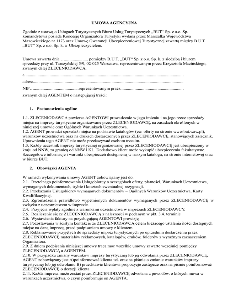 UMOWA AGENCYJNA Zgodnie z ustawą o Usługach Turystycznych Biuro Usług Turystycznych „BUT“ Sp. z o.o. Sp. komandytowa posiada Koncesję Organizatora Turystyki wydaną przez Marszałka Województwa Mazowieckiego nr 1173 oraz Umowę Gwarancji Ubezpieczeniowej Turystycznej zawartą między B.U.T. „BUT“ Sp. z o.o. Sp. k. a Ubezpieczycielem. Umowa zawarta dnia …..................... pomiędzy B.U.T. „BUT“ Sp. z o.o. Sp. k. z siedzibą i biurem sprzedaży przy ul. Tarczyńskiej 5/9, 02-025 Warszawa, reprezentowanym przez Krzysztofa Mazińskiego, zwanym dalej ZLECENIODAWCĄ, a ................................................................................................................................................. adres:.......................................................................................................................................... NIP….........................................reprezentowanym przez.......................................................... zwanym dalej AGENTEM o następującej treści: 1. Postanowienia ogólne 1.1. ZLECENIODAWCA powierza AGENTOWI prowadzenie w jego imieniu i na jego rzecz sprzedaży miejsc na imprezy turystyczne organizowane przez ZLECENIODAWCĘ, na zasadach określonych w niniejszej umowie oraz Ogólnych Warunkach Uczestnictwa. 1.2. AGENT prowadzi sprzedaż miejsc na podstawie katalogów (ew. oferty na stronie www.but.waw.pl), warunków uczestnictwa oraz na drukach dostarczonych przez ZLECENIODAWCĘ, stanowiących załącznik. Uprawnienia tego AGENT nie może przekazywać osobom trzecim. 1.3. Każdy uczestnik imprezy turystycznej organizowanej przez ZLECENIODAWCĘ jest ubezpieczony w kraju od NNW, za granicą od NNW i KL. Dodatkowo klient może wykupić ubezpieczenia fakultatywne. Szczegółowe informacje i warunki ubezpieczeń dostępne są w naszym katalogu, na stronie internetowej oraz w biurze BUT. 2. Obowiązki AGENTA W ramach wykonywania umowy AGENT zobowiązany jest do: 2.1. Rzetelnego poinformowania Usługobiorcy o szczegółach oferty, płatności, Warunkach Uczestnictwa, wymaganych dokumentach, trybie i kosztach ewentualnej rezygnacji. 2.2. Przekazania Usługobiorcy wymaganych dokumentów – Ogólnych Warunków Uczestnictwa, Karty Kwalifikacyjnej. 2.3. Zgromadzenia prawidłowo wypełnionych dokumentów wymaganych przez ZLECENIODAWCĘ w związku z uczestnictwem w imprezie. 2.4. Przyjęcia wpłaty zgodnie z warunkami uczestnictwa w imprezach ZLECENIODAWCY. 2.5. Rozliczenie się ze ZLECENIODAWCĄ z należności w podanym w pkt. 3.4. terminie 2.6. Wystawienia faktury na przysługującą AGENTOWI prowizję. 2.7. Pozostawania w ścisłym kontakcie ze ZLECENIODAWCĄ celem bieżącego ustalenia ilości dostępnych miejsc na daną imprezę, przed podpisaniem umowy z klientem. 2.8. Reklamowanie przyjętych do sprzedaży imprez turystycznych po uprzednim dostarczeniu przez ZLECENIODAWCĘ materiałów reklamowych, katalogów, druków, folderów z wyraźnym zaznaczeniem Organizatora. 2.9. Z dniem podpisania niniejszej umowy tracą moc wszelkie umowy zawarte wcześniej pomiędzy ZLECENIODAWCĄ a AGENTEM. 2.10. W przypadku zmiany warunków imprezy turystycznej lub jej odwołania przez ZLECENIODAWCĘ, AGENT zobowiązany jest A)poinformować klienta tel. oraz na piśmie o zmianie warunków imprezy turystycznej lub jej odwołaniu B) przedstawić klientowi propozycje zastępcze oraz na piśmie poinformować ZLECENIODAWCĘ o decyzji klienta 2.11. Każda impreza może zostać przez ZLECENIODAWCĘ odwołana z powodów, o których mowa w warunkach uczestnictwa, o czym poinformuje on AGENTA. 2.12. Agent oświadcza, że …........................................................ posiada własną kasę fiskalną …................................................................... nie posiada własnej kasy fiskalnej 2.13. W przypadku posiadania kasy fiskalnej AGENT pośredniczący w sprzedaży danej Imprezy zobowiązuje się do dokonywania ewidencji wpłaconych przez Klientów pieniędzy za pomocą własnej kasy fiskalnej działającej zgodnie z art. 111 ust. 6A ustawy z dnia 11 marca 2004r. O podatku od towarów i usług (Dz. U. Z 2011 r. Nr 177, poz. 1054 z późn. zm.) i zapewniającej prawidłowe zaewidencjonowanie podstawowych danych dotyczących zawieranych transakcji. 2.14. a) Kasa fiskalna winna być skonfigurowana w sposób umożliwiający ewidencjonowanaie i identyfikację wpłat dokonanych na poczet Imprez sprzedanych za pośrednictwem Agenta, a realizowanych przez ORGANIZATORA. b) Na żądanie ORGANIZATORA AGENT ma obowiązek przedstawić zestawienie zafiskalizowanych paragonów. c) AGENT ma obowiązek przechowywać kopie paragonów przez okres wymagany ustawą z dnia 29.08.1997 r. - Ordynacja podatkowa (Dz. U. Z 2012 poz. 749 z późn. zm.) 2.15. W przypadku nie posiadania przez AGENTA kasy fiskalnej, a) AGENT nie jest uprawniony do pobierania płatności gotówkowych od Klienta za Imprezę Biura Usług Turystycznych BUT. b) AGENT ma prawo do przyjmowania zapłaty od klienta za Imprezy Biura Usług Turystycznych BUT wyłącznie w formie bezgotówkowej tj. za pośrednictwem poczty, banku lub spółdzielczej kasy oszczędnościowo-kredytowej, której jest członkiem). AGENT ponosi pełną odpowiedzialność wobec klienta i ZLECENIODAWCY za niewłaściwe wykonanie czynności wymienionych w punktach 2 i 3. 3. Zasady sprzedaży i rozliczeń 3.1. Rozpoczęcie sprzedaży miejsc przez AGENTA następuje z chwilą podpisania Umowy 3.2. Wynagrodzenie AGENTA stanowi prowizja określona w Komunikacie Prowizyjnym. 3.3. Rezerwacji miejsc AGENT dokonuje telefonicznie lub za pośrednictwem strony internetowej (konieczny login i hasło). Rezerwacja telefoniczna ważna jest max 3 dni, w tym czasie AGENT zobowiązuje się do przesłania faxem pisemnego zamówienia z pełnymi danymi klienta oraz nazwę i datę imprezy (druk umowy – zgłoszenia). W przypadku braku pisemnego zamówienia w umówionym terminie rezerwacja zostaje anulowan