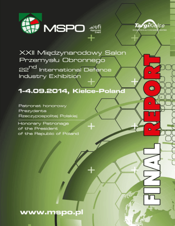 1 Instytucje wspierające Międzynarodowy Salon Przemysłu Obronnego MSPO: MSPO is supported by Ministerstwo Obrony Narodowej Ministry of National Defence Ministerstwo Gospodarki Ministry of Economy Ministerstwo Skarbu Państwa Ministry of Treasury Ministerstwo Spraw Zagranicznych Ministry of Foreign Affairs Ministerstwo Nauki i Szkolnictwa Wyższego Ministry of Science and Higher Education Biuro Bezpieczeństwa Narodowego National Security Bureau Agencja Bezpieczeństwa Wewnętrznego The Internal Security Agency Sztab Generalny WP General Staff of the Polish Armed Forces Dowódca Generalny Rodzajów Sił Zbrojnych General Commander of the General Command of Branches of Armed Forces Dowódca Operacyjny Rodzajów Sił Zbrojnych Head of the Operations Command of the Branches of Armed Forces Komendant Główny Żandarmerii Wojskowej Military Police Commander in Chief Inspektorat Wsparcia Sił Zbrojnych RP Inspectorate for Armed Forces Support Komenda Główna Straży Granicznej Border Guard Headquarters Komenda Główna Policji Police Headquarters Komenda Główna Państwowej Straży Pożarnej National Fire Brigade Headquarters Polska Izba Producentów na Rzecz Obronności Kraju Polish Chamber of National Defence Manufacturers Sejmowa i Senacka Komisja Obrony Narodowej Parliamentary Committies of National Defence Sejmowa Komisja Spraw Wewnętrznych Parliamentary Committee of Internal Affairs MSPO - Współpraca medialna (między innymi): Media coverage (e.g.) RAPORT Wojsko Technika Obronność Polska Zbrojna Nowa Technika Wojskowa IHS Jane’s Military Technology Armia Przegląd Obrony Cywilnej Army Recognition Special Ops Small Arms Defense Journal Defense Express MSPO 2014 Szanowni Państwo, XXII Międzynarodowy Salon Przemysłu Obronnego pod Honorowym Patronatem Prezydenta RP, który odbył się w Targach Kielce, od 1 do 4 września był ważnym miejscem dla przedstawicieli sektora zbrojeniowego, przemysłu, a także biznesu. Na powierzchni blisko 25 000 metrów kwadratowych swoje produkty zaprezentowało prawie 500 firm z 27 krajów. Gospodarzem Wystawy Narodowej była Francja. Po raz kolejny przekonaliśmy się, że jest to wystawa o globalnym zasięgu, odwiedzana przez gości z całego świata. Wystawę odwiedziło przeszło 13 000 osób, w tym delegacje zagraniczne z 49 krajów. Salon był rekordowy również ze względu na liczbę merytorycznych spotkań. Odbyło się 40 seminariów, kongresów i konferencji będących idealną okazją do wymiany doświadczeń, pogłębienia wiedzy na temat najnowocześniejszych rozwiązań z dziedziny techniki wojskowej, nawiązania kontaktów oraz prowadzenia rozmów przez przedstawicieli przemysłu obronnego, sił zbrojnych i administracji rządowej. Tradycyjnie też podczas Salonu miało miejsce wiele kontraktacji. Jak co roku, ostatniego dnia imprezy najlepsze oferty zaprezentowane podczas targów zostały nagrodzone Nagrodą Prezydenta RP, prestiżowymi statuetkami Defender oraz Wyróżnieniami Specjalnymi. Kolejna okazja do spotkań w gronie profesjonalistów światowego sektora obronnego już za rok podczas XXIII Międzynarodowego Salonu Przemysłu Obronnego oraz XX Targów Logistyka, na które już dziś serdecznie Państwa zapraszam. Agnieszka Białek Dyrektor Projektu MSPO Ladies and Gentlemen, The 22nd International Defence Industry Exhibition was held under the auspices of the Republic of Poland President Bronislaw Komorowski. The trade show was staged in Targi Kielce from 1 to 4 September. The Expo was an important event for representatives of the defense sector, industry as well as business milieus. Almost 25,000 square metres of exhibition space was the display for almost 500 companies from 27 countries. MSPO has again proved to be a global scale expo as it brings together guests from all corners of the world. Almost 13,000 people visited the exhibition including foreign delegations from 49 countries. The Expo has also been a record-breaking event with regards to the problem-focussed meetings. The Expo programme encompassed almost 40 seminars and congresses; they provide an ideal opportunity to exchange experiences, to expand knowledge about the latest military technology solutions, to establish contacts and relations as well as to hold talks between the defense industry, the armed forces and government administration. Purchase orders and contracts also have become an indispensable part of MSPO tradition. Following the previous years’ tradition, the last Expo day’s highlight was the awarding ceremony; the best offers showcased at MSPO were awarded the Republic of Poland President’s Award, the prestigious Defender statuettes and Special Honours. Please accept our wholehearted invitation to join the 23rd International Defence Industry Exhibition and 21st International Logistic Fair, the events where representatives of the world’s defence industry and business meet in one place and at the same time. Agnieszka Białek MSPO Project Director 3 Podsumowanie Wystawcy ogółem / Total number of exhibitors: 496 Z Polski / Polish companies: 281 Z zagranicy: 215 z 27 krajów 215 companies from 27 countries Liczba wystawców / number of exhibitors Austria, Belgium/Belgia, Brasil/Brazylia, Canada/Kanada, Czech Republic/Czechy, Denmark/Dania, Estonia, Finland/Finlandia, France/Francja, Germany/Niemcy, Great Britain/Wielka Brytania, Hungary/Węgry, India/Indie, Israel/Izrael, Italy/Włochy, Japan/Japonia, Lithuania/Litwa, Luxembourg/Luksemburg, Norway/Norwegia, Poland/Polska, South Korea/Korea Płd., Spain/Hiszpania, Sweden/Szwecja, Switzerland/Szwajcaria, the Netherlands/Holandia, Turkey/Turcja, Ukraine/Ukraina, USA Powierzchnia wystawowa / space rented Powierzchnia wystawowa netto ogółem Total net exhibition space: 24 627 m² Wewnątrz hal / Covered space: 16.130 m² Teren zewnętrzny / Outdoor area: 8.497 m² Zwiedzający / Visitors Zarejestrowani zwiedzający / registered visitors Liczba zarejestrowanych zwiedzających / Registered vis