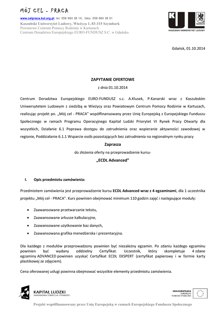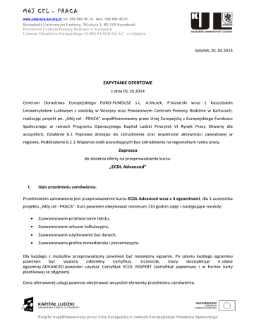 MÓJ CEL - PRACA www.celpraca.kul.org.pl; tel. 058 684 38 14; faks. 058 684 38 01 Kaszubski Uniwersytet Ludowy, Wieżyca 1, 83-315 Szymbark Powiatowe Centrum Pomocy Rodzinie w Kartuzach Centrum Doradztwa Europejskiego EURO-FUNDUSZ S.C. w Gdańsku Gdańsk, 01.10.2014 ZAPYTANIE OFERTOWE z dnia 01.10.2014 Centrum Doradztwa Europejskiego EURO-FUNDUSZ s.c. A.Klusek, P.Kanarski wraz z Kaszubskim Uniwersytetem Ludowym z siedzibą w Wieżycy oraz Powiatowym Centrum Pomocy Rodzinie w Kartuzach, realizując projekt pn. „Mój cel - PRACA” współfinansowany przez Unię Europejską z Europejskiego Funduszu Społecznego w ramach Programu Operacyjnego Kapitał Ludzki Priorytet VI Rynek Pracy Otwarty dla wszystkich, Działanie 6.1 Poprawa dostępu do zatrudnienia oraz wspieranie aktywności zawodowej w regionie, Poddziałanie 6.1.1 Wsparcie osób pozostających bez zatrudnienia na regionalnym rynku pracy Zaprasza do złożenia oferty na przeprowadzenie kursu- „ECDL Advanced” I. Opis przedmiotu zamówienia: Przedmiotem zamówienia jest przeprowadzenie kursu ECDL Advanced wraz z 4 egzaminami, dla 1 uczestnika projektu „Mój cel - PRACA”. Kurs powinien obejmować minimum 110 godzin zajęć i następujące moduły: Zaawansowane przetwarzanie tekstu, Zaawansowane arkusze kalkulacyjne, Zaawansowane użytkowanie baz danych, Zaawansowana grafika menedżerska i prezentacyjna. Dla każdego z modułów przeprowadzony powinien być niezależny egzamin. Po zdaniu każdego egzaminu powinien być wydany oddzielny Certyfikat. Uczestnik, który skompletuje 4 zdane egzaminy ADVANCED powinien uzyskać Certyfikat ECDL EKSPERT (certyfikat papierowy i w formie karty plastikowej ze zdjęciem). Cena oferowanej usługi powinna obejmować wszystkie elementy przedmiotu zamówienia. Projekt współfinansowany przez Unię Europejską w ramach Europejskiego Funduszu Społecznego MÓJ CEL - PRACA www.celpraca.kul.org.pl; tel. 058 684 38 14; faks. 058 684 38 01 Kaszubski Uniwersytet Ludowy, Wieżyca 1, 83-315 Szymbark Powiatowe Centrum Pomocy Rodzinie w Kartuzach Centrum Doradztwa Europejskiego EURO-FUNDUSZ S.C. w Gdańsku II. Miejsce i termin realizacji zamówienia: Lokalizacja: Trójmiasto/powiat lęborski/powiat kartuski Przewidywany termin realizacji zamówienia (uzależniony od daty rozpoczęcia kursu): 03.11.2014 - 31.12.2014 III. Kryteria jakościowe zamówienia: 1. Wykonawca musi legitymować się statusem instytucji szkoleniowej w rozumieniu ustawy z dnia 20 kwietnia 2004 r. o promocji zatrudnienia i instytucjach rynku pracy (tekst jednolity- Dz. U. z 2008 r. Nr 69, poz. 415 ze zm.), wpisanej do rejestru instytucji szkoleniowych. 2. Wykonawca musi posiadać status Certyfikowanego Centrum Egzaminacyjnego ECDL i posiadać uprawnienia do organizowania egzaminów na Europejski Certyfikat Umiejętności Komputerowych ECDL Advanced. 3. W celu intensyfikacji kursu oraz przeciwdziałaniu wydłużenia się kursu w czasie, zajęcia powinny obejmować nie mniej niż 30 godzin zegarowych w tygodniu (godzina zegarowa kursu to 60 minut z podziałem na 45 minut zajęć edukacyjnych i średnio 15 minut przerwy; długość przerw może być ustalana w sposób dowolny, jednakże sumowane przerwy nie mogą skracać czasu trwania kursu). Zajęcia powinny odbywać się w dni powszednie, z wyłączeniem niedziel i dni świątecznych i powinny odbywać się w godzinach między 9.00 a 15.00. 4. Zamawiający nie dopuszcza składania ofert częściowych lub wariantowych. 5. Wykonawca zobowiązuje się w ramach oferowanej usługi zapewnić uczestnikowi materiały szkoleniowe i dydaktyczne niezbędne do odbycia kursu (w tym notatnik, długopis oraz podręczniki związane z tematyką przedmiotowego kursu). 6. Wykonawca, w ramach oferowanej usługi, zapewni uczestnikowi kursu ubezpieczenie NNW na okres realizacji kursu. 7. Wykonawca musi zapewnić zaplecze dostosowane do prowadzenia kursów zawodowych tj. sala szkoleniowa ze stołami i krzesłami nieutrudniającymi bezpośredniego kontaktu z wykładowcą; oświetlenie sali powinno być dostosowane do pracy przy komputerze a sala powinna być wietrzona lub klimatyzowana. Miejsce odbywania zajęć powinno być wyposażone w rzutnik multimedialny, ekran, tablicę flipchart oraz sprzęt komputerowy wraz z niezbędnym oprogramowaniem do przeprowadzenia przedmiotowego kursu (stanowiska jednoosobowe). 8. Wykonawca zobowiązuje się do prowadzenia kursu zgodnie z przepisami bezpieczeństwa i higieny pracy oraz zapoznania uczestnika z obowiązującymi przepisami BHP. Projekt współfinansowany przez Unię Europejską w ramach Europejskiego Funduszu Społecznego MÓJ CEL - PRACA www.celpraca.kul.org.pl; tel. 058 684 38 14; faks. 058 684 38 01 Kaszubski Uniwersytet Ludowy, Wieżyca 1, 83-315 Szymbark Powiatowe Centrum Pomocy Rodzinie w Kartuzach Centrum Doradztwa Europejskiego EURO-FUNDUSZ S.C. w Gdańsku 9. Zajęcia teoretyczne i praktyczne muszą być prowadzone przez uprawnionych instruktorów/wykładowców posiadających kierunkowe wykształcenie/kwalifikacje niezbędne do prowadzenia szkoleń z zakresie przedmiotu zamówienia. 10. Wykonawca zobowiązuje się prowadzić dziennik zajęć, sprawdzać listę obecności a także dbać o formalności związane z imiennymi potwierdzeniami odbioru materiałów szkoleniowych, zaświadczeń/certyfikatów. 11. Wykonawca zobowiązany jest do zamieszczenia logotypów Unii Europejskiej i Programu Operacyjnego Kapitał Ludzki oraz informacji o współfinansowaniu na wszystkich dokumentach związanych z kursem (materiały szkoleniowe, listy obecności, zaświadczenia o ukończeniu kursu) a także oznaczenia miejsca odbywania zajęć, zgodnie z wytycznymi przekazanymi przez Zamawiającego. 12. Szczegółowy harmonogram kursu zostanie ustalony z Zamawiającym po dokonaniu wyboru Wykonawcy. 13. Wykonawca zobowiązuje się do przeprowadzenia egzaminu potwierdzonego zaświadczeniem. Jednostki uprawnione do stosownym wydania zaświadczenia wg Rozporządzenia Ministra Ed