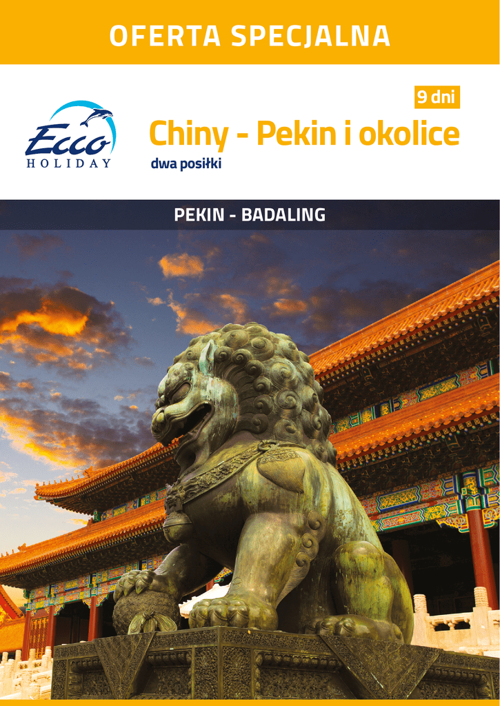 OFERTA SPECJALNA 9 dni Chiny - Pekin i okolice dwa posiłki PEKIN - BADALING Ramowy program wycieczki: Dzień 1. Warszawa - Pekin. Wylot z Warszawy. Dzień 2. Pekin. Przylot do Pekinu i rozpoczęcie zwiedzania. Zobaczymy Świątynię Nieba - kompleks sakralnych budowli taoistycznych w południowo-wschodniej części centralnego Pekinu, w Chinach. Kompleks był odwiedzany przez cesarzy Chin z dynastii Ming i Qing w czasie corocznych ceremonii, w czasie których modlono się do Nieba o obfite plony rolne. Uważana jest za świątynię taoistyczną, ale chińska wiara w Niebo, popularna szczególnie wśród panujących dynastii, występowała przed powstaniem taoizmu. Cały kompleks został wpisany w 1998 roku na listę światowego dziedzictwa UNESCO. Czas wolny na odpoczynek po trudach podróży. Wieczorem powitalna kolacja. Dzień 3. Pekin. Po śniadaniu zobaczymy tzw. Zakazane Miasto, będące od XV wieku siedzibą kolejnych władców „Państwa Środka”. Pałac był rezydencją 24 cesarzy z dynastii Ming i Qing. Zakazane Miasto jest największym zespołem pałacowym na świecie i znajduje się na liście światowego dziedzictwa kultury UNESCO. Jingshan - spacer w parku ze słynnym „Wzgórzem Węglowym”. Następnie zobaczymy Placu Niebiańskiego Spokoju (Tiananmen). Monumentalna budowla wzniesiona w latach 1976-1977 stanowi miejsce pochówku przywódcy Chińskiej Republiki Ludowej. Rzut oka na nowoczesny Pekin - budynek Opery Narodowej, a następnie najstarsza ulica miasta - Liulichang - pełna antycznych sklepów z przedmiotami chińskiego rzemiosła ludowego oraz niedawno odrestaurowana uliczka Qianmen. Wieczorem obiadokolacja. Dla chętnych możliwość uczestniczenia w wycieczce fakultatywnej - show akrobatów. Dzień 4. Pekin. Śniadanie. Następnie wizyta w zoo - pawilon pandy wielkiej. Wizyta w zakładzie rzemieślniczym wytwarzającym biżuterię z pereł - możliwość poznania procesu hodowli pereł słodkowodnych oraz dokonania zakupów. Później jedziemy do Letniego Pałacu, założonego przez cesarza Qianlong w 1750 roku. Położony pod Pekinem kompleks pałacowy, zwany inaczej „Ogrodami Naturalnej Harmonii” urzeka rozmachem i przepychem. Od 1998 znajduje się na Liście UNESCO jako unikatowy przykład chińskiej sztuki projektowania ogrodów. Na prawie 3 km kwadratowych znajduje się sztuczne jezioro Kunming oraz Wzgórze Długowieczności, nad którym górują zabudowania pałacu. Wzdłuż brzegu jeziora znajduje się jedyna w swoim rodzaju galeria-deptak, gdzie na sklepieniu zadaszenia znajdują się setki tradycyjnych dzieł sztuki malarskiej. Na końcu panoramy zobaczymy Marmurową Łódź, którą wielkim kosztem kazała zbudować okrutna Cesarzowa Cixi. Zobaczymy też Świątynię Lazurowych Obłoków z pawilonem pięciuset Arhatów i Pagodą Diamentowego Tronu. Wieczorem obiadokolacja. Dzień 5. Pekin - Badaling. Po śniadaniu zobaczymy grobowce stanowiące miejsce spoczynku 13 spośród 16 cesarzy dynastii Ming. Przejazd od Wielkiej Czerwonej Bramy aż do grobowców siedmiokilometrową rytualna drogą, zwaną w chińskiej tradycji drogą duchów (shendao). Jej kilkusetmetrowy odcinek za Pawilonem Steli ozdobiony jest po bokach ustawionymi w 12 par posągami zwierząt, zarówno realnych (słonie, wielbłądy, konie), jak i mitycznych (qilin, xiezhi). Za nimi znajduje się 12 posągów mandarynów. Koniec drogi duchów wieńczy wykuta w marmurze ozdobna Brama Smoka i Feniksa i wejście na teren jednego z 13 grobowców. Później w Badaling spacer po jednym z najlepiej zachowanych odcinków Chińskiego Muru. Tradycyjnie przyjmuje się, że Wielki Mur rozciągał się od Shanhaiguan (nad zatoką Liaodong) do Jiayuguan w górach Nan Shan na długości ok. 2400 km. Wieczorem obiadokolacja, a dla chętnych wycieczka fakultatywna kungfu show. Dzień 6. Pagoda i Ekran Dziewięciu Smoków. Przejażdżka łodzią po znajdującym się w parku jeziorze, a następnie ulica Wangfujing - jedna z głównych alei handlowych miasta. Wieczorem obiadokolacja, a następnie wizyta na wieczornym targu z żywnością. Pekin. Spacer po Parku Ritan, gdzie mieszkańcy stolicy uprawiają poranne ćwiczenia Tai Chi. Powrót do hotelu na śniadanie. Następnie Park Morza Północnego (Beihai), w którym oprócz urzekającego jeziora znajduje się Biała Dzień 7. Pekin. Po śniadaniu zwiedzanie miejsc związanych z religijnością Chińczyków. Będą to Świątynia Lamy - jedna z najbardziej znanych w Pekinie świątyń lamaistycznych ze wspaniałym posągiem Buddy Maitrei o wysokości 26 metrów oraz Świątynia Konfucjusza poświęcona filozofowi, który tysiące lat temu stworzył podstawy moralności chińskiej. Zobaczymy także Taoistyczną Świątynię Białego Obłoku, a następnie odwiedzimy galerie sztuki chińskiej. Obiadokolacja. Dzień 8. Pekin. Śniadanie. Przejażdżka rikszami po najstarszych uliczkach miasta (dzialnica tzw. hutongów) i wizyta w lokalnym domostwie. Chwila na relaks na tzw. „uliczce barów” przy niewielkim jeziorze. Odwiedzimy również tradycyjna chińska herbaciarnię. Wizyta na terenie obiektów olimpijskich (jeśli w danym dniu będą organizowane zawody sportowe ten punkt programu może się nie odbyć), a następnie rzut oka z autokaru na nowoczesny gmach telewizji CCTV. Krótki czas wolny w tzw. „wiosce Sanlinton” - nowoczesnym centrum handlowym zaprojektowanym przez międzynarodowy zespół 6 młodych architektów. Odwiedzimy też tradycyjny chiński bazar Yaxiou. Wieczorem pożegnalna kolacja ze słynną „kaczką po pekińsku”. Dzień 9. Pekin - Warszawa. Śniadanie. Czas wolny uzależniony od godziny wylotu. Zakończenie programu i wylot do Polski z międzylądowaniem w porcie europejskim. Wieczorny przylot do Warszawy.