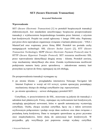 SET (Secure Electronic Transaction) Krzysztof Maćkowiak Wprowadzenie SET (Secure Electronic Transaction) [1] to protokół bezpiecznych transakcji elektronicznych. Jest standardem umożliwiający bezpieczne przeprowadzanie transakcji z wykluczeniem bezpośredniego kontaktu przez Internet, z użyciem kart kredytowych. Projekt ten został ogłoszony 1 lutego 1996 roku. Popierany jest przez dwie największe organizacje związane z kartami płatniczymi – VISA i MasterCard oraz wspierany przez firmę IBM. Protokół ten posiada cechy następujących technologii: SSL (Secure Socket Layer) [2], STT (Secure Transaction Technology), SEPP (Secure Electronic Payment Protocol) oraz SHTTP (Secure Hypertext Transfer Protocol). SET rozszerza możliwości SSL przez wprowadzenie identyfikacji drugiej strony - klienta. Protokół zawiera, więc mechanizmy identyfikacji obu stron. Została wyeliminowana możliwość podejrzenia numeru karty przez sprzedawcę – zakodowane numery kart przesyłane są wprost do firmy zajmującej się ich obsługą. Do przeprowadzenia transakcji wymagane są: • po stronie klienta – przeglądarka internetowa Netscape Navigator lub Internet Explorer w wersji od 4.0 wzwyż, system operacyjny posiadający mechanizmy służące do obsługi certyfikatów (np. repozytorium). • po stronie sprzedawcy – serwer obsługujący protokół SET. Certyfikaty, w przeciwieństwie do SSL, stosowane są jedynie do transakcji z udziałem kart płatniczych. Firmy, zajmujące się rozliczaniem kart kredytowych, zarządzają specjalnymi serwerami, które w sposób automatyczny wystawiają certyfikaty. Osoba, chcąca uzyskać certyfikat, łączy się z takim serwerem szyfrowanym połączeniem i podaje swoje dane osobowe oraz dane związane z posiadaną kartą kredytową. Dane te następnie sprawdzane są przez prywatne sieci międzybankowe, które służą do autoryzacji kart kredytowych. W przypadku, gdy weryfikacja jest poprawna zostaje wydany certyfikat. © Krzysztof Maćkowiak 1 Zapewnienie dwóch stron o wiarygodności partnera podczas przeprowadzania każdej transakcji, jest uzyskiwane poprzez sprawdzanie certyfikatów po obu stronach. Strony wyróżniane w protokole SET: • kupujący (klient) zamawiający towary u sprzedawcy i dokonujący zapłaty, • sprzedawca oferujący towary, usługi oraz zapewniający przeprowadzenie transakcji, • bank będący instytucją finansową, która założyła konto klientowi i wydała mu kartę kredytową, • centrum autoryzacji dokonujące autoryzacji kart płatniczych oraz płatności, • brama autoryzacji przetwarzająca komunikaty sprzedawcy w czasie realizacji płatności elektronicznych, • system płatniczy np. VISA, MasterCard ustalający mechanizmy obsługi i akceptacji kart płatniczych. Zanim klient i sprzedawca będą mogli korzystać z protokołu SET muszą się zarejestrować. Rejestracja klienta i sprzedawcy polega na wystawieniu certyfikatu przez centrum autoryzacyjne (CA). Przebieg transakcji elektronicznej: • przeglądanie i zakupy, • wybór sprzedawcy i towaru, • negocjacje i zamówienie, • wybór sposobu płatności, • żądanie przeprowadzenia transakcji (SET), • uwierzytelnianie płatności (SET), • dostarczenie towaru, • przeprowadzenie płatności (SET). Tylko trzy zaznaczone procesy są wykonywane z wykorzystaniem protokołu SET. © Krzysztof Maćkowiak 2 Protokół SET jest wykorzystywany, gdy klient jako sposób płatności wybierze kartę kredytową. Transakcja SET: KLIENT SPRZEDAWCA BRAMA PŁATNICZA PInitReq PInitRes PReq AuthReq AuthRes PRes CapReq CapRes Rys.1. Komunikaty podstawowej transakcji. Komunikaty transakcji SET opisane są poniżej. PInitReq – żądanie rozpoczęcia transakcji, zawiera informację o systemie płatniczym. PInitRes – identyfikator transakcji podpisany kluczem prywatnym sprzedawcy oraz zawierający certyfikaty: sprzedawcy i bramy płatniczej. PReq – złożenie zamówienia. © Krzysztof Maćkowiak 3 AuthReq – żądanie uwierzytelnienia płatności. AuthRes – odpowiedź potwierdzająca weryfikację klienta, sprzedawcy i transakcji w banku. PRes – w przypadku poprawnej weryfikacji, sklep potwierdza przeprowadzenie transakcji. CapReq, CapRes – realizacja płatności. Wszystkie te komunikaty są obowiązkowe i występują w każdym procesie transakcji. Dodatkowo mogą występować jeszcze opcjonalne komunikaty m.in. AuthRevReq, AuthRevRes – stosowane do zmiany lub anulowania procesu uwierzytelniania. Etap uwierzytelnienia (AuthReq/AuthRes) Ze względu na bezpieczeństwo transakcji najważniejszym etapem jest etap uwierzytelnienia. Uwierzytelnienie służy zapewnieniu, że otrzymane dane zostały wysłane przez określoną osobę. Na podstawie otrzymanych danych odbiorca może zidentyfikować nadawcę tych danych. Proces ten jest dokonywany z użyciem podpisu cyfrowego oraz certyfikatów wystawianych przez CA. W protokole SET uwierzytelnieniu podlegają: kupujący, sprzedawca oraz brama płatnicza. Proces uwierzytelniania składa się z dwóch wiadomości: prośby uwierzytelnienia (AuthReq) generowanej przez sprzedawcę i wysyłanej do bramy płatniczej oraz odpowiedzi generowanej przez bramę płatniczą i przesyłanej do sprzedawcy. Wiadomości te używane są zarówno w transakcjach uwierzytelniania jak i w transakcjach sprzedaży. Para komunikatów dostarcza sprzedawcy mechanizm do dokonania uwierzytelnienia związanego z realizacją zakupów. Sprzedawca generując prośbę o uwierzytelnienie wysyła dane związane z realizacją zakupów, które są podpisane i zaszyfrowane oraz dodatkowe informacje (PI) otrzymane od osoby dokonującej zakupu. Przesłane informacje zawarte są w komunikacie AuthReq i służą do dokonania uwierzytelnienia, które wykonuje brama płatnicza z wykorzystaniem sieci międzybankowych. © Krzysztof Maćkowiak 4 Brama płatnicza korzystając z sieci międzybankowych przeprowadza proces uwierzytelnienia, w wyniku czego generowany jest