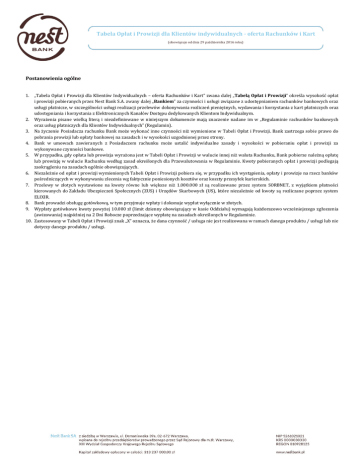 Tabela Opłat i Prowizji dla Klientów indywidualnych - oferta Rachunków i Kart (obowiązuje od dnia 29 października 2016 roku) Postanowienia ogólne 1. „Tabela Opłat i Prowizji dla Klientów Indywidualnych – oferta Rachunków i Kart” zwana dalej „Tabelą Opłat i Prowizji” określa wysokość opłat i prowizji pobieranych przez Nest Bank S.A. zwany dalej „Bankiem” za czynności i usługi związane z udostępnianiem rachunków bankowych oraz usługi płatnicze, w szczególności usługi realizacji przelewów dokonywania rozliczeń pieniężnych, wydawania i korzystania z kart płatniczych oraz udostępniania i korzystania z Elektronicznych Kanałów Dostępu dedykowanych Klientom Indywidualnym. 2. Wyrażenia pisane wielką literą i niezdefiniowane w niniejszym dokumencie mają znaczenie nadane im w „Regulaminie rachunków bankowych oraz usług płatniczych dla Klientów Indywidualnych” (Regulamin). 3. Na życzenie Posiadacza rachunku Bank może wykonać inne czynności niż wymienione w Tabeli Opłat i Prowizji. Bank zastrzega sobie prawo do pobrania prowizji lub opłaty bankowej na zasadach i w wysokości uzgodnionej przez strony. 4. Bank w umowach zawieranych z Posiadaczem rachunku może ustalić indywidualne zasady i wysokości w pobieraniu opłat i prowizji za wykonywane czynności bankowe. 5. W przypadku, gdy opłata lub prowizja wyrażona jest w Tabeli Opłat i Prowizji w walucie innej niż waluta Rachunku, Bank pobierze należną opłatę lub prowizję w walucie Rachunku według zasad określonych dla Przewalutowania w Regulaminie. Kwoty pobieranych opłat i prowizji podlegają zaokrągleniu na zasadach ogólnie obowiązujących. 6. Niezależnie od opłat i prowizji wymienionych Tabeli Opłat i Prowizji pobiera się, w przypadku ich wystąpienia, opłaty i prowizje na rzecz banków pośredniczących w wykonywaniu zlecenia wg faktycznie poniesionych kosztów oraz koszty przesyłek kurierskich. 7. Przelewy w złotych wystawione na kwoty równe lub większe niż 1.000.000 zł są realizowane przez system SORBNET, z wyjątkiem płatności kierowanych do Zakładu Ubezpieczeń Społecznych (ZUS) i Urzędów Skarbowych (US), które niezależnie od kwoty są rozliczane poprzez system ELIXIR. 8. Bank prowadzi obsługę gotówkową, w tym przyjmuje wpłaty i dokonuje wypłat wyłącznie w złotych. 9. Wypłaty gotówkowe kwoty powyżej 10.000 zł (limit dzienny obowiązujący w kasie Oddziału) wymagają każdorazowo wcześniejszego zgłoszenia (awizowania) najpóźniej na 2 Dni Robocze poprzedzające wypłatę na zasadach określonych w Regulaminie. 10. Zastosowany w Tabeli Opłat i Prowizji znak „X” oznacza, że dana czynność / usługa nie jest realizowana w ramach danego produktu / usługi lub nie dotyczy danego produktu / usługi. Rozdział 1 Rachunki oszczędnościowo-rozliczeniowe Lp. Rodzaj czynności / usługi 1. 2. 3. Otwarcie rachunku Prowadzenie rachunku Elektroniczne Kanały Dostępu 1) abonament za użytkowanie 2) wygenerowanie Kodu SMS bez opłat bez opłat Nest Konto Waluta EUR bez opłat bez opłat Nest Konto Waluta USD/GBP bez opłat bez opłat bez opłat bez opłat bez opłat bez opłat bez opłat bez opłat Tryb pobierania Nest Konto jednorazowo miesięcznie miesięcznie każdorazowo Rozdział 2 Zlecenia płatnicze i inne usługi z rachunków oszczędnościowo-rozliczeniowych Lp. Rodzaj czynności / usługi 1. Wpłaty gotówkowe w złotych polskich 1) na rachunki prowadzone przez Bank 2) na rachunki prowadzone w innych bankach Wypłaty gotówkowe w złotych polskich 1) awizowane i niewymagające awizowania 2) nieawizowane (w przypadku możliwości jej wykonania) 3) niepodjęcie gotówki w uzgodnionym terminie Realizacja przelewu 1) na rachunek w Banku (bez względu na kanał realizacji) 2) na rachunek w innym banku zleconego w Oddziale lub poprzez Serwis Telefoniczny a) natychmiastowy1 w złotych polskich b) do ZUS i US w złotych polskich c) krajowy (ELIXIR) w złotych polskich d) przelew europejski (SEPA) w EUR 2. 3. e) przelew zagraniczny (SWIFT) w walucie 4. 5. 6. 7. 3) na rachunek w innym banku zleconego przez Bankowość Internetową lub Mobilną a) natychmiastowy1 w złotych polskich b) do ZUS i US w złotych polskich c) przelew e-mail / SMS w złotych polskich d) krajowy (ELIXIR) w złotych polskich e) przelew europejski (SEPA) w EUR f) przelew zagraniczny (SWIFT) w walucie 4) na rachunek w innym banku zleconego poprzez system SORBNET (bez względu na kanał realizacji) Zlecenie stałe 1) Zdefiniowanie / modyfikacja / odwołanie zlecenia a) w Oddziale oraz poprzez Serwis Telefoniczny b) poprzez Bankowość Internetową i Mobilną 2) Realizacja Polecenie zapłaty 1) Zdefiniowanie 2) Realizacja 3) Modyfikacja / odwołanie Wyciąg 1) miesięczny w formie elektronicznej 2) miesięczny wysyłany pocztą listem zwykłym2 3) na żądanie – bieżący, historyczny (wysyłany pocztą listem zwykłym lub wysyłany pocztą elektroniczną) Usługa korzystnych przewalutowań3 1) Aktywacja usługi 2) Opłata za korzystanie z usługi 3) Odwołanie usługi Tryb pobierania Nest Konto Nest Konto Waluta EUR Nest Konto Waluta USD/GBP od kwoty wpłaty od kwoty wpłaty bez opłat 0,5% min 5 zł bez opłat X bez opłat X od kwoty wypłaty od kwoty wypłaty od kwoty wypłaty bez opłat bez opłat 10 zł bez opłat bez opłat 2 EUR bez opłat bez opłat 2,5 USD/1,5 GBP od każdego przelewu bez opłat bez opłat bez opłat od każdego przelewu od każdego przelewu od każdego przelewu od każdego przelewu 5 zł 5 zł 5 zł 5 zł od każdego przelewu 0,2% min 20 zł max 200 zł X 1 EUR 1 EUR 1 EUR 0,2% min 4 EUR max 40 EUR X X X X 0,2% min 5 USD / 3 GBP max 50 USD / 30 GBP od każdego przelewu od każdego przelewu od każdego przelewu od każdego przelewu od każdego przelewu od każdego przelewu 1 zł bez opłat bez opłat bez opłat bez opłat 15 zł X bez opłat bez opłat bez opłat bez opłat 3 EUR X X X X X 4 USD / 2,5 GBP od każdego przelewu 15 zł 3 EUR