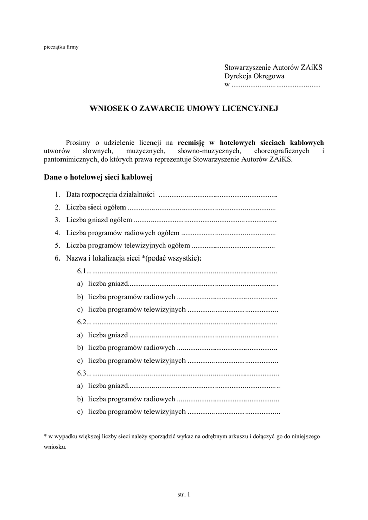 pieczątka firmy Stowarzyszenie Autorów ZAiKS Dyrekcja Okręgowa w ................................................ WNIOSEK O ZAWARCIE UMOWY LICENCYJNEJ Prosimy o udzielenie licencji na reemisję w hotelowych sieciach kablowych utworów słownych, muzycznych, słowno-muzycznych, choreograficznych i pantomimicznych, do których prawa reprezentuje Stowarzyszenie Autorów ZAiKS. Dane o hotelowej sieci kablowej 1. Data rozpoczęcia działalności ................................................................ 2. Liczba sieci ogółem ................................................................................ 3. Liczba gniazd ogółem ............................................................................. 4. Liczba programów radiowych ogółem ................................................... 5. Liczba programów telewizyjnych ogółem ............................................. 6. Nazwa i lokalizacja sieci *(podać wszystkie): 6.1....................................................................................................... a) liczba gniazd................................................................................. b) liczba programów radiowych ...................................................... c) liczba programów telewizyjnych ................................................. 6.2....................................................................................................... a) liczba gniazd ................................................................................ b) liczba programów radiowych ...................................................... c) liczba programów telewizyjnych ................................................. 6.3........................................................................................................ a) liczba gniazd.................................................................................. b) liczba programów radiowych ....................................................... c) liczba programów telewizyjnych .................................................. * w wypadku większej liczby sieci należy sporządzić wykaz na odrębnym arkuszu i dołączyć go do niniejszego wniosku. str. 1 Dane dotyczące naszej firmy 1. Pełna nazwa firmy: .......................................................................................................... 2. Status prawny osoba fizyczna osoba prawna jednostka organizacyjna nie mająca osobowości prawnej 3. a) Siedziba firmy: miejscowość, kod pocztowy ............................................................................................. ulica, nr domu, nr lokalu .................................................................................................. b) Adres zamieszkania właściciela firmy: miejscowość, kod pocztowy ............................................................................................. ulica, nr domu, nr lokalu .................................................................................................. 4. Adres do korespondencji: miejscowość, kod pocztowy ............................................................................................. ulica, nr lokalu, nr domu .................................................................................................. 5. Telefony ........................................................................................................................... 6. Fax .................................................................................................................................... 7. e-mail ............................................................................................................................... 8. PESEL (osoby fizycznej/członków zarządu) ................................................................... 9. Regon ............................................................................................................................... 10. NIP ................................................................................................................................... 11. Numery kont bankowych ................................................................................................. 12. Osoba(y) uprawniona do reprezentacji firmy: nazwisko i imię, funkcja ................................................................................................ ........................................................................................................................................ Do wniosku załączamy: Kserokopię * zaświadczenia o wpisie do ewidencji działalności gospodarczej odpisu z Krajowego Rejestru Sądowego * niepotrzebne skreślić str. 2 Po zawarciu umowy licencyjnej zobowiązujemy się niezwłocznie informować ZAiKS o wszelkich zmianach powyższych danych. ..................................dnia ...................................... ................................. pieczęć i podpis osoby reprezentującej firmę str. 3