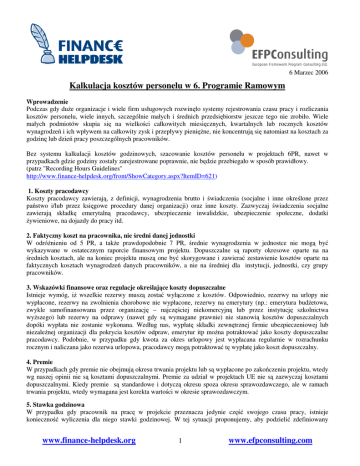 6 Marzec 2006 Kalkulacja kosztów personelu w 6. Programie Ramowym Wprowadzenie Podczas gdy du e organizacje i wiele firm usługowych rozwin ło systemy rejestrowania czasu pracy i rozliczania kosztów personelu, wiele innych, szczególnie małych i rednich przedsi biorstw jeszcze tego nie zrobiło. Wiele małych podmiotów skupia si na wielko ci całkowitych miesi cznych, kwartalnych lub rocznych kosztów wynagrodze i ich wpływem na całkowity zysk i przepływy pieni ne, nie koncentruj si natomiast na kosztach za godzin lub dzie pracy poszczególnych pracowników. Bez systemu kalkulacji kosztów godzinowych, szacowanie kosztów personelu w projektach 6PR, nawet w przypadkach gdzie godziny zostały zarejestrowane poprawnie, nie b dzie przebiegało w sposób prawidłowy. (patrz "Recording Hours Guidelines" http://www.finance-helpdesk.org/front/ShowCategory.aspx?ItemID=621) 1. Koszty pracodawcy Koszty pracodawcy zawieraj , z definicji, wynagrodzenia brutto i wiadczenia (socjalne i inne okre lone przez pa stwo i/lub przez ksi gowe procedury danej organizacji) oraz inne koszty. Zazwyczaj wiadczenia socjalne zawieraj składk emerytaln pracodawcy, ubezpieczenie inwalidzkie, ubezpieczenie społeczne, dodatki ywieniowe, na dojazdy do pracy itd. 2. Faktyczny koszt na pracownika, nie redni danej jednostki W odró nieniu od 5 PR, a tak e prawdopodobnie 7 PR, rednie wynagrodzenia w jednostce nie mog by wykazywane w ostatecznym raporcie finansowym projektu. Dopuszczalne s raporty okresowe oparte na na rednich kosztach, ale na koniec projektu musz one by skorygowane i zawiera zestawienie kosztów oparte na faktycznych kosztach wynagrodze danych pracowników, a nie na redniej dla instytucji, jednostki, czy grupy pracowników. 3. Wskazówki finansowe oraz regulacje okre laj ce koszty dopuszczalne Istnieje wymóg, i wszelkie rezerwy musz zosta wył czone z kosztów. Odpowiednio, rezerwy na urlopy nie wypłacone, rezerwy na zwolnienia chorobowe nie wypłacone, rezerwy na emerytury (np.: emerytura bud etowa, zwykle samofinansowana przez organizacj – najcz ciej niekomercyjn lub przez instytucj szkolnictwa wy szego) lub rezerwy na odprawy (nawet gdy s wymagane prawnie) nie stanowi kosztów dopuszczalnych dopóki wypłata nie zostanie wykonana. Według nas, wypłat składki zewn trznej firmie ubezpieczeniowej lub niezale nej organizacji dla pokrycia kosztów odpraw, emerytur itp mo na potraktowa jako koszty dopuszczalne pracodawcy. Podobnie, w przypadku gdy kwota za okres urlopowy jest wypłacana regularnie w rozrachunku rocznym i naliczana jako rezerwa urlopowa, pracodawcy mog potraktowa t wypłat jako koszt dopuszczalny. 4. Premie W przypadkach gdy premie nie obejmuj okresu trwania projektu lub s wypłacone po zako czeniu projektu, wtedy wg naszej opinii nie s kosztami dopuszczalnymi. Premie za udział w projektach UE nie s zazwyczaj kosztami dopuszczalnymi. Kiedy premie s standardowe i dotycz okresu spoza okresu sprawozdawczego, ale w ramach trwania projektu, wtedy wymagana jest korekta warto ci w okresie sprawozdawczym. 5. Stawka godzinowa W przypadku gdy pracownik na prac w projekcie przeznacza jedynie cz swojego czasu pracy, istnieje konieczno wyliczenia dla niego stawki godzinowej. W tej sytuacji proponujemy, aby podzieli zdefiniowany www.finance-helpdesk.org 1 www.efpconsulting.com powy ej koszt roczny pracodawcy przez liczb godzin produktywnych (projekty UE i inne, wył czaj c wakacje, choroby, urlopy macierzy skie, słu b wojskow itd.). Otrzymamy w ten sposób redni roczn stawk godzinow . Godziny przepracowane w danym projekcie (według kart czasu pracy) patrz: „Recording Hours Guidelines” http://www.finance-helpdesk.org/front/ShowCategory.aspx?ItemID=621, zostan wycenione według powy szych stawek godzinowych, w celu wyliczenia kosztów personelu. 6. Nadgodziny Kwestia nadgodzin wymaga specjalnego potraktowania. Zasadniczo powinno si unika nadgodzin w projektach 6.PR, ale w pewnych okoliczno ciach, szczególnie w przypadku wysoko zaawansowanych technologicznie M P, nadgodziny s raczej zwyczajn praktyk , a nie wyj tkiem. Dla personelu, który cały swój czas pracy po wi ca na prac w projekcie, koszt nadgodzin b dzie automatycznie wliczany. Je li jednak pracownik po wi ca jedynie cz swojego czasu pracy na projekt, pracodawca nie mo e utrzymywa , e nadgodziny odnosz si tylko do tego projektu. W najlepszym wypadku, nadgodziny mog by rozdzielone mi dzy projektem 6 PR a innymi obowi zkami. Wytyczne Finansowe (The Financial Guidelines) sugeruj , e w przypadku kadry pracuj cej cz ciowo nad projektem nie powinno si stosowa wy szych stawek dla nadgodzin. Cz sto stawka w przypadku nadgodzin jest wy sza od standardowych kosztów pracodawcy. Je li opisany wy ej sposób kalkulacji u yty b dzie do obliczenia redniej stawki godzinowej, wtedy rednia stawka za nadgodziny uwzgl dniona b dzie w kosztach. Istnieje tak e opinia (patrz powy ej) zgodnie z któr wy sza stawka za nadgodziny nie mo e by stosowana do kalkulacji i wtedy nadgodziny b d kalkulowane po stawkach podstawowych, a dodatkowa cz stawki za nadgodziny nie b dzie brana pod uwag . W naszej opinii takie podej cie nie jest słuszne i je li i wg normalnych zasad ksi gowych stosowanych przez jednostk stawki za nadgodziny s rozdzielane mi dzy ró nymi projektami na pracownika, to te wy sze stawki b d mogły by uwzgl dniane przy kalkulacji. W ramach 5PR maksymalna liczba godzin produktywnych w przypadku pracownika pracuj cego 40 godzin/tydzie była szacowana na poziomie 1680 godzin/rok. Co prawda ograniczenie to obecnie nie wyst puj , jednak znaczne odst pstwa od tej warto ci mog wzbudzi zdziwienie oficerów projektowych i zarówno oni, jak i audytorzy mog zwróci si o wyja nienia w tej kwestii. Zastrze enie Celem i przeznaczeniem tego opracowania jest zwrócenie uwagi na pewne kwestie finansowe zwi zane z programem ramowym, nie za dawanie wi cej prawnie porady. Zamierzeniem jest dostarczenie stosownych informacji pomocnych do wyja nienia mo liwych w tpl