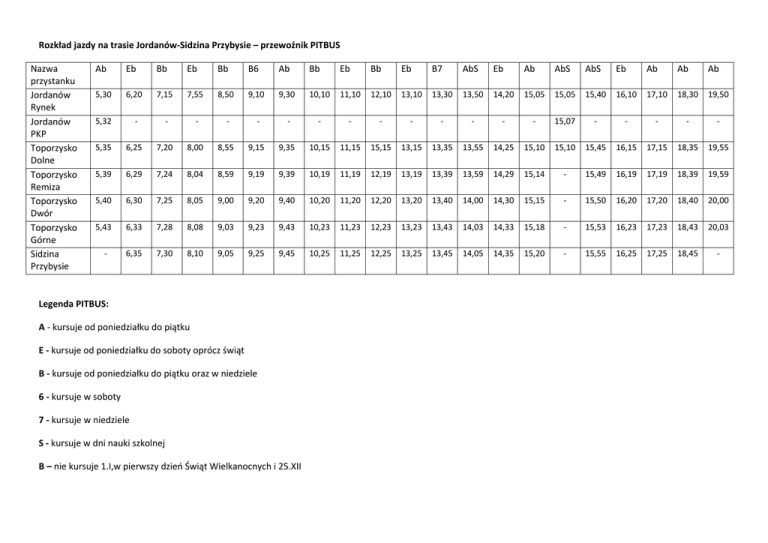 Rozkład jazdy na trasie Jordanów-Sidzina Przybysie – przewoźnik PITBUS Nazwa przystanku Jordanów Rynek Jordanów PKP Toporzysko Dolne Toporzysko Remiza Toporzysko Dwór Toporzysko Górne Sidzina Przybysie Ab Eb Bb Eb Bb B6 Ab Bb Eb Bb Eb B7 AbS Eb Ab AbS AbS Eb Ab Ab Ab 5,30 6,20 7,15 7,55 8,50 9,10 9,30 10,10 11,10 12,10 13,10 13,30 13,50 14,20 15,05 15,05 15,40 16,10 17,10 18,30 19,50 5,32 - - - - - - - - - - - - - - 15,07 - - - - - 5,35 6,25 7,20 8,00 8,55 9,15 9,35 10,15 11,15 15,15 13,15 13,35 13,55 14,25 15,10 15,10 15,45 16,15 17,15 18,35 19,55 5,39 6,29 7,24 8,04 8,59 9,19 9,39 10,19 11,19 12,19 13,19 13,39 13,59 14,29 15,14 - 15,49 16,19 17,19 18,39 19,59 5,40 6,30 7,25 8,05 9,00 9,20 9,40 10,20 11,20 12,20 13,20 13,40 14,00 14,30 15,15 - 15,50 16,20 17,20 18,40 20,00 5,43 6,33 7,28 8,08 9,03 9,23 9,43 10,23 11,23 12,23 13,23 13,43 14,03 14,33 15,18 - 15,53 16,23 17,23 18,43 20,03 - 6,35 7,30 8,10 9,05 9,25 9,45 10,25 11,25 12,25 13,25 13,45 14,05 14,35 15,20 - 15,55 16,25 17,25 18,45 - Legenda PITBUS: A - kursuje od poniedziałku do piątku E - kursuje od poniedziałku do soboty oprócz świąt B - kursuje od poniedziałku do piątku oraz w niedziele 6 - kursuje w soboty 7 - kursuje w niedziele S - kursuje w dni nauki szkolnej B – nie kursuje 1.I,w pierwszy dzień Świąt Wielkanocnych i 25.XII Rozkład jazdy na trasie Sidzina Przybysie-Jordanów – przewoźnik PITBUS Nazwa przystank u Sidzina Przybysie Toporzys ko Górne Toporzys ko Dwór Toporzys ko Dolne Jordanów PKP Jordanów Rynek Jordanów Chrobacz e Ab Eb Bb AbS Eb Ab b7 b6 Ab b7 Ab Eb Bb b6 Ab b7 AbS Eb Ab AbS Eb Ab Ab Ab 6,35 7,30 - 8,10 9,10 - 9,30 9,50 - 10,4 0 11,3 0 12,3 0 13,1 5 13,3 0 13,5 0 14,0 5 14,3 5 15,2 0 15,5 5 16,2 5 17,2 5 18,5 0 - 5,45 6,37 7,32 - 8,12 9,12 9,20 9,32 9,52 10,3 0 10,4 2 11,3 2 12,3 2 13,1 7 13,3 2 13,5 2 14,0 7 14,3 7 15,2 2 15,5 7 16,2 7 7,27 18,5 2 20,0 5 5,47 6,39 7,34 - 8,14 9,14 9,22 9,34 9,54 10,3 2 10,4 4 11,3 4 12,3 4 13,1 9 13,3 4 13,5 4 14,0 9 14,3 9 15,2 4 15,5 9 16,2 9 17,2 9 18,5 4 20,0 7 5,53 6,45 7,40 7,32 8,20 9,20 9,28 9,40 10,0 0 10,3 8 10,5 0 11,4 0 12,4 0 13,2 5 13,4 0 14,0 0 14,1 5 14,4 5 15,3 0 16,0 5 16,3 5 17,3 5 19,0 0 20,1 3 5,56 6,48 - - - - - - - - - - - 13,4 3 - - - - - - - - - 5,58 6,50 7,45 7,37 8,25 9,25 9,33 9,45 10,0 5 10,4 3 10,5 5 11,4 5 12,4 5 13,3 0 13,4 5 14,0 5 14,2 0 14,5 0 15,3 5 16,1 0 16,4 0 17,4 0 19,0 5 20,1 8 - - 7,48 - - - - - - - - - - - - - - - - - - - - - Legenda PITBUS: A - kursuje od poniedziałku do piątku E - kursuje od poniedziałku do soboty oprócz świąt B - kursuje od poniedziałku do piątku oraz w niedziele 6 - kursuje w soboty 7 - kursuje w niedziele S - kursuje w dni nauki szkolnej B – nie kursuje 1.I,w pierwszy dzień Świąt Wielkanocnych i 25.XII