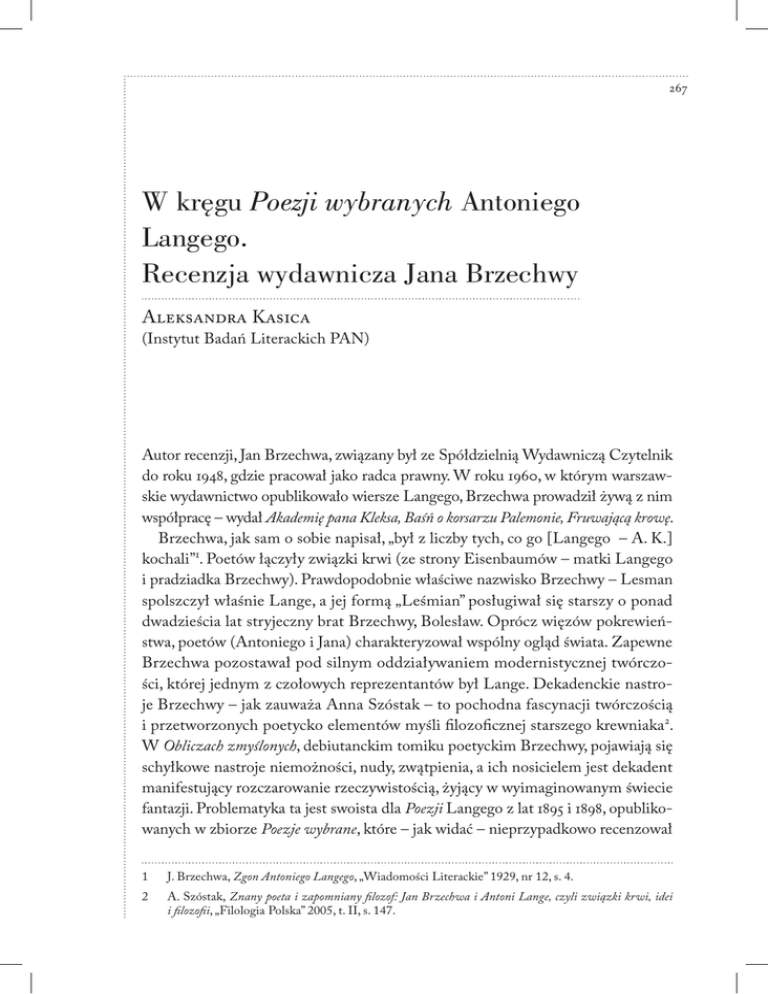 267 W kręgu Poezji wybranych Antoniego Langego. Recenzja wydawnicza Jana Brzechwy Aleksandra Kasica (Instytut Badań Literackich PAN) Autor recenzji, Jan Brzechwa, związany był ze Spółdzielnią Wydawniczą Czytelnik do roku 1948, gdzie pracował jako radca prawny. W roku 1960, w którym warszawskie wydawnictwo opublikowało wiersze Langego, Brzechwa prowadził żywą z nim współpracę – wydał Akademię pana Kleksa, Baśń o korsarzu Palemonie, Fruwającą krowę. Brzechwa, jak sam o sobie napisał, „był z liczby tych, co go [Langego – A. K.] kochali”1. Poetów łączyły związki krwi (ze strony Eisenbaumów – matki Langego i pradziadka Brzechwy). Prawdopodobnie właściwe nazwisko Brzechwy – Lesman spolszczył właśnie Lange, a jej formą „Leśmian” posługiwał się starszy o ponad dwadzieścia lat stryjeczny brat Brzechwy, Bolesław. Oprócz więzów pokrewieństwa, poetów (Antoniego i Jana) charakteryzował wspólny ogląd świata. Zapewne Brzechwa pozostawał pod silnym oddziaływaniem modernistycznej twórczości, której jednym z czołowych reprezentantów był Lange. Dekadenckie nastroje Brzechwy – jak zauważa Anna Szóstak – to pochodna fascynacji twórczością i przetworzonych poetycko elementów myśli filozoficznej starszego krewniaka2. W Obliczach zmyślonych, debiutanckim tomiku poetyckim Brzechwy, pojawiają się schyłkowe nastroje niemożności, nudy, zwątpienia, a ich nosicielem jest dekadent manifestujący rozczarowanie rzeczywistością, żyjący w wyimaginowanym świecie fantazji. Problematyka ta jest swoista dla Poezji Langego z lat 1895 i 1898, opublikowanych w zbiorze Poezje wybrane, które – jak widać – nieprzypadkowo recenzował 1 2 J. Brzechwa, Zgon Antoniego Langego, „Wiadomości Literackie” 1929, nr 12, s. 4. A. Szóstak, Znany poeta i zapomniany filozof: Jan Brzechwa i Antoni Lange, czyli związki krwi, idei i filozofii, „Filologia Polska” 2005, t. II, s. 147. II • Pasje i potyczki edytorskie i tekstologiczne 268 Brzechwa. W wydanym przez Brzechwę tomiku Talizmany (1929) także pojawiają się echa wpływów modernistycznych (m.in. koncepcje przyswojone przez Langego: poety równego Bogu, wiary w twórczą moc Słowa). Niniejsza recenzja dowodzi, że Brzechwa podzielał zakres zainteresowań Langego twórczością obcą, egzotyczną. Ślady fascynacji przekładanymi przez starszego kuzyna Upaniszadami – o które Brzechwa wnosił w recenzji, by zamieścić je w Poezjach wybranych – można również odnaleźć w twórczości młodszego poety (Oblicza zmyślone). Warto dodać, że gust poetycki bajkopisarza w sposób zasadniczy ukształtowały młodopolskie idee. Brzechwa nie akceptował awangardowej poezji, czego wyrazem był felieton Cyrk pcheł opublikowany w 1959 roku na łamach tygodnika „Świat”. Zarzucał jej wtórność, ogołocenie wierszy z rytmu i rymu, odrzucenie zasad ortografii i interpunkcji, pozbawienie sensu. W tym kontekście wznowione modernistyczne wiersze Langego stawały się dowodem na to, że „poezja żyje i będzie żyła […]. Ale nie w cyrku fałszywych pcheł”3. Maszynopis recenzji w 1980 roku został przekazany przez wdowę po poecie, Janinę Brzechwę Muzeum Literatury im. Adama Mickiewicza w Warszawie (sygn. 705, k. 41-42, dwie karty zapisane jednostronnie format 125 x 290 mm, papier kremowy). Wszystkie przypisy do recenzji zostały sporządzone przez autorkę opracowania. Pozwalają na wyciągnięcie wniosków, dotyczących wpływu opinii Brzechwy na ostateczną zawartość zbioru i czynią tę wewnętrzną, nigdy niepublikowaną recenzję tym bardziej interesującą. Bibliografia: Brzechwa J., Cyrk pcheł, „Świat” 1959, nr 1, s. 3; Brzechwa J., Zgon Antoniego Langego, „Wiadomości Literackie” 1929, nr 12, s. 4; Epos. Zbiór arcydzieł poezji epickiej wszystkich czasów i narodów w streszczeniach i wyciągach, ułożył A. Lange, t. I-V [epos babilońskie, egipskie, indyjskie, greckie], Brody 1900-1912; Lange A., Poezje wybrane, przygot. i wstępem poprzedził J.Z. Jakubowski, Warszawa 1960; Lange A., Przekłady z poetów obcych, cz. II, Warszawa 1899; Napierski [A. Lange], Pogrobowcom. Poemat, Kraków 1901; Sintaisi-Sho, Poeci nowojapońscy. Z dodaniem zarysu dziejów literatury japońskiej w XIX wieku, spolszczył A. Lange, Warszawa 1908; Szóstak A., Znany poeta i zapomniany filozof: Jan Brzechwa i Antoni Lange, czyli związki krwi, idei i filozofii, „Filologia Polska” 2005, t. II, s. 147. 3 J. Brzechwa, Cyrk pcheł, „Świat” 1959, nr 1, s. 3. Aleksandra Kasica W kręgu Poezji wybranych Antoniego Langego… 269 Słowa kluczowe: Antoni Lange, Jan Brzechwa, poezje wybrane , recenzja wydawnicza Aleksandra Kasica In the Circle of Collected Poetry of Antoni Lange [Poezje zebrane]. On Publishing Review by Jan Brzechwa The article presents a publishing review of Antoni Lange’s collected poetry written by Jan Brzechwa. Lange’s poems were published in 1950 by the “Czytelnik” Publishing House, which at that time Brzechwa cooperated with. The manuscript of the review from 1980 was given over by the poet’s widow, Janina Brzechwa, to Adam Mickiewicz Museum of Literature in Warsaw (pressmark: 705, k. 41-42). Key words: Antoni Lange, Jan Brzechwa, collected poetry, publishing review