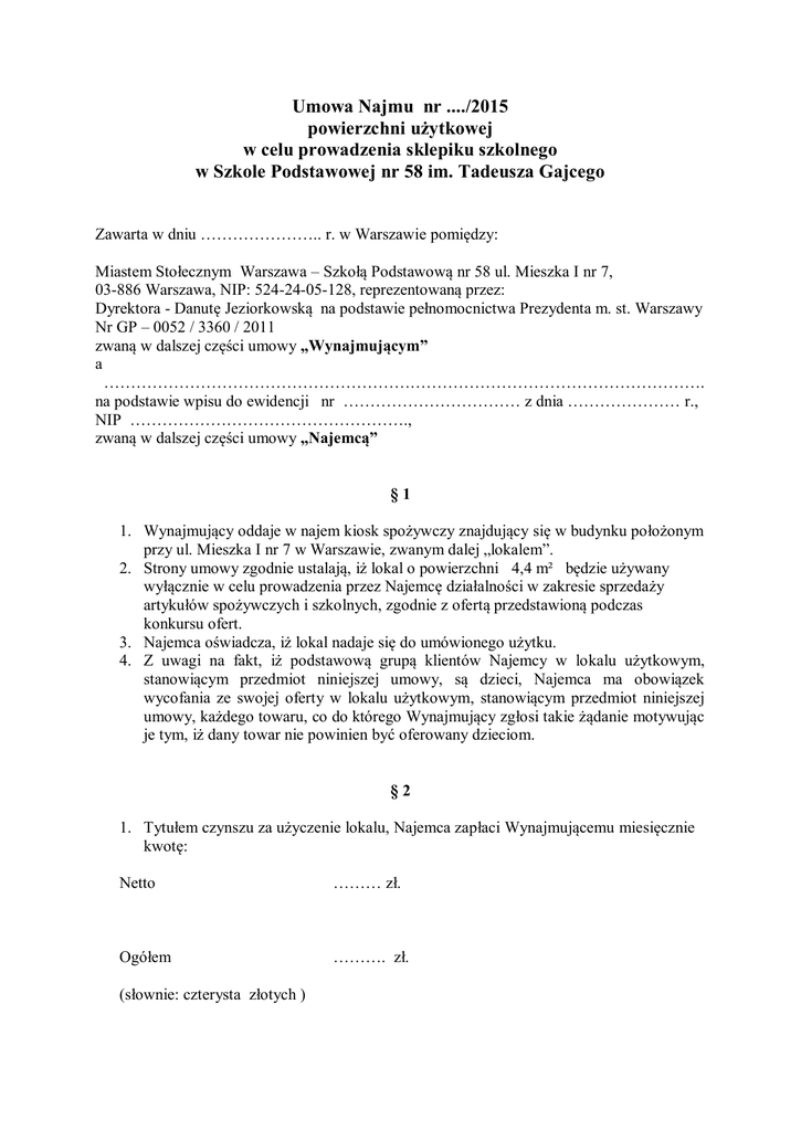 Umowa Najmu nr ..../2015 powierzchni użytkowej w celu prowadzenia sklepiku szkolnego w Szkole Podstawowej nr 58 im. Tadeusza Gajcego Zawarta w dniu ………………….. r. w Warszawie pomiędzy: Miastem Stołecznym Warszawa – Szkołą Podstawową nr 58 ul. Mieszka I nr 7, 03-886 Warszawa, NIP: 524-24-05-128, reprezentowaną przez: Dyrektora - Danutę Jeziorkowską na podstawie pełnomocnictwa Prezydenta m. st. Warszawy Nr GP – 0052 / 3360 / 2011 zwaną w dalszej części umowy „Wynajmującym” a …………………………………………………………………………………………………. na podstawie wpisu do ewidencji nr …………………………… z dnia ………………… r., NIP ……………………………………………., zwaną w dalszej części umowy „Najemcą” §1 1. Wynajmujący oddaje w najem kiosk spożywczy znajdujący się w budynku położonym przy ul. Mieszka I nr 7 w Warszawie, zwanym dalej „lokalem”. 2. Strony umowy zgodnie ustalają, iż lokal o powierzchni 4,4 m² będzie używany wyłącznie w celu prowadzenia przez Najemcę działalności w zakresie sprzedaży artykułów spożywczych i szkolnych, zgodnie z ofertą przedstawioną podczas konkursu ofert. 3. Najemca oświadcza, iż lokal nadaje się do umówionego użytku. 4. Z uwagi na fakt, iż podstawową grupą klientów Najemcy w lokalu użytkowym, stanowiącym przedmiot niniejszej umowy, są dzieci, Najemca ma obowiązek wycofania ze swojej oferty w lokalu użytkowym, stanowiącym przedmiot niniejszej umowy, każdego towaru, co do którego Wynajmujący zgłosi takie żądanie motywując je tym, iż dany towar nie powinien być oferowany dzieciom. §2 1. Tytułem czynszu za użyczenie lokalu, Najemca zapłaci Wynajmującemu miesięcznie kwotę: Netto ……… zł. Ogółem ………. zł. (słownie: czterysta złotych ) 2. Czynsz określony w ust. 1 płatny będzie przez Najemcę w rozliczeniu miesięcznym po otrzymaniu rachunku w ciągu 7 dni na konto Dzielnicowego Biura Finansów Oświaty Targówek m. st. Warszawy – na rachunek 3. Czynsz określony w ust. 1 płatny będzie przez Najemcę w rozliczeniu miesięcznym po otrzymaniu rachunku do 10 dnia każdego miesiąca na wydzielony rachunek dochodów własnych Szkoły Podstawowej nr 58 im. Tadeusza Gajcego w Warszawie, ul. Mieszka I nr 7 Nr 55 1030 1508 0000 0005 5081 4064 §3 Oddanie lokalu w całości lub w części w podnajem lub do bezpłatnego używania wymaga zgody Wynajmującego w formie pisemnej pod rygorem nieważności. §4 1.Umowa jest zawarta na okres od 1.09.2015 r. do 30.06.2016 r. 2.Jeżeli na koniec roku szkolnego do dnia 22 czerwca 2016 r. Rada Rodziców oceni pozytywnie współpracę z Dzierżawcą, Wydzierżawiający przewiduje możliwość przedłużenia umowy na kolejny rok z Dzierżawcą bez przeprowadzenia konkursu, lub też przyznanie pierwszeństwa wyboru oferty Dzierżawcy w przypadku realizacji konkursu. 3. Strony umowy zgodnie ustalają, iż Wynajmujący może wypowiedzieć umowę najmu z zachowaniem 14 dniowego okresu wypowiedzenia, w przypadku: 1) potrzeby przeprowadzenia remontu lub napraw budynku, w którym lokal się znajduje, 2) używania lokalu przez Najemcę niezgodnie z przeznaczeniem określonym w umowie, 3) zamierzonej przez Najemcę zmiany przeznaczenia lokalu, 4) jeżeli Najemca opóźni się w uiszczeniu chociażby w części miesięcznego czynszu. 4. Wynajmującemu przysługuje prawo rozwiązania umowy bez zachowania terminów wypowiedzenia w przypadku: 1) zalegania z zapłatą czynszu przez okres 2 miesięcy, 2) w przypadku niewycofania przez Najemcę towaru w terminie 24 godzin od chwili złożenia odpowiedniego żądania przez Wynajmującego, §5 Najemca jest zobowiązany do utrzymania w należytym stanie technicznym i sanitarnym wynajętego lokalu, a to zgodnie z obowiązującymi w tej mierze przepisami sanitarno – epidemiologicznymi, bhp i ppoż. §6 Najemca jest zobowiązany do przekazania lokalu Wynajmującemu niezwłocznie po jego użyciu w stanie niepogorszonym. §7 Wszelkie zmiany niniejszej umowy wymagają formy pisemnej pod rygorem nieważności. §8 1. Najemca oświadcza, że znany jest mu fakt, iż treść niniejszej umowy, a w szczególności przedmiot umowy, stanowią informację publiczną w rozumieniu art. 1 ust. 1 ustawy z dnia 6 września 2001 r. o dostępie do informacji publicznej (Dz. U. z 2001 r. nr 112 poz. 1198 z późn. zm.), która podlega udostępnieniu w trybie przedmiotowej ustawy . 2. Najemca wyraża zgodę na udostępnienie w trybie ustawy, o której mowa w ust. 1, zawartych w niniejszej umowie danych osobowych dotyczących go w zakresie obejmującym imię i nazwisko, a w razie prowadzenia działalności gospodarczej, również w zakresie firmy. 3. Najemca oświadcza, iż z umową nie wiąże się tajemnica przedsiębiorcy w rozumieniu ustawy z dnia 16.04.1993 r. o zwalczaniu nieuczciwej konkurencji (Dz. U. z 2003 r. Nr 153, poz. 1503 z póz. zm. ) 4. Wykonanie niniejszej umowy nie wiąże się z przetwarzaniem danych osobowych w rozumieniu ustawy o ochronie danych osobowych, dla których Administratorem Danych jest Prezydent m. st. Warszawy lub Dyrektor Wydzierżawiającego, a co za tym idzie nie wiąże się z dostępem do zasobów systemów informatycznych Urzędu m. st. Warszawy lub Wynajmującego. §9 1. W sprawach nieuregulowanych znajdują zastosowanie przepisy Kodeksu Cywilnego. 2. Spory mogące wynikać z umowy rozpatrywać będzie Sąd właściwy miejscowo dla Najemcy. 3. Umowa niniejsza została sporządzona w trzech jednobrzmiących egzemplarzach. WYNAJMUJĄCY NAJEMCA