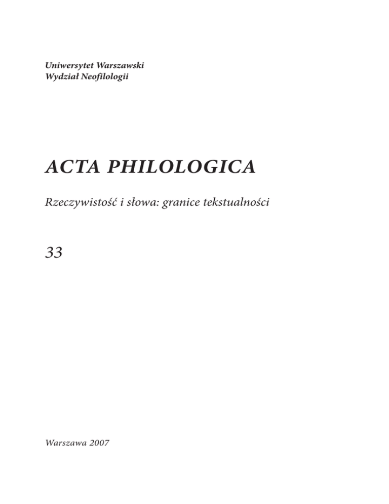 Uniwersytet Warszawski Wydział Neofilologii ACTA PHILOLOGICA Rzeczywistość i słowa: granice tekstualności 33 Warszawa 2007 Komisja Wydawnicza Wydziału Neofilologii Uniwersytetu Warszawskiego: prof. dr hab. Agata Preis-Smith (przewodnicząca) dr Marta Czyżewska dr Jolanta Dygul dr Agnieszka Flisek dr Joanna Żurowska dr Marek Paryż Redaktorzy tomu: prof. dr hab. Agata Preis-Smith dr Marek Paryż ISSN 0065-1525 © Wydział Neofilologii Uniwersytetu Warszawskiego Wydanie I, nakład: egz. 200 Skład, łamanie Mariusz Sadowski, Studio M4 Druk i oprawa Sowa – Druk na życzenie www.sowadruk.pl tel. (22) 431 81 40 Spis treści Zuzanna Ładyga Winnicott, Levinas and the Ethics of Referential Play in Postmodern Literature ................................. 5 Anna Kalewska Entre o texto e a palavra em cena: nos confins do discurso dramatúrgico lusófono .......................... 12 Tomasz G. Pszczółkowski O potrzebie nowego określenia pojęcia komparatystyki ......................................................................... 21 Monika Turemka Strategie diarystyczne w osobistym opisywaniu rzeczywistości ............................................................ 28 Joanna Godlewicz-Adamiec Średniowieczna rzeczywistość i specyfika jej opisu ................................................................................. 35 Karolina Kumor El teatro de Bances Candamo y la realidad política de la España de Carlos II .................................... 42 Joanna Moczyńska Importing Oblivion: “An adjunct to remember” in King Lear ............................................................... 49 Bartłomiej Błaszkiewicz The Spatial Imagery of Milton’s Paradise ................................................................................................... 58 Hanna Boguta-Marchel Reconciliation of the Individual and the Social as an Instance of the Puritan-American Ideology of Consensus ........................................................... 64 Monika Kulesza Eléonor d’Yvrée de Catherine Bernard –un roman dans le sillage des moralistes ................................ 71 Izabella Zatorska Konteksty dawne i nowe w komediach Marivaux .................................................................................... 79 Paweł Piszczatowski Między prawdą a fikcją tekstu – retoryka niedopowiedzenia we wstępie do Wychowania rodzaju ludzkiego Lessinga .......................................................................... 84 Lech Kolago „Die Form will so gut verdauet sein als der Stoff; ja sie verdaut sich viel schwerer“. Goethes Concerto dramatico ....................................................................................................................... 91 Grażyna Bystydzieńska Polska recepcja Podróży sentymentalnej Sterne’a w XIX wieku ............................................................ 101 Anna Gutowska Ucieczka przed zbrodniczym baronetem: wątki sensacyjne w powieściach George Eliot ............... 106 Małgorzata Łuczyńska-Hołdys Ambiguity of femme fatale Figures in Algernon Charles Swinburne’s Laus Veneris and Dolores ........................................................................................................................... 113 Paweł Załęski Tocqueville i społeczeństwo cywilne: w stronę romantycznego postrzegania rzeczywistości społecznej ....................................................... 120 Maria Błaszkiewicz The Great Chain of Writing: Tolkien’s Story of Beren and Lúthien and the Epic Tradition ............. 128 Barbara Kowalik Arthurian Motifs in the Poetry of Edwin Muir: Enchantment and Madness .................................... 136 Krzysztof Tkaczyk Dyletanci w poszukiwaniu cudu. O Bebuquinie Carla Einsteina ......................................................... 146 Katarzyna Grzywka „… diese einsame schwarze Insel mit den erleuchteten Küsten aus Silber und Gold“. Über den Kölner Dom im Roman Die geheimen Stunden der Nacht von Hanns-Josef Ortheil ............................................................................................................................ 153 Agnieszka Flisek La Buenos Aires de Borges: construcción ideológica de un espacio urbano ...................................... 160 Judyta Zbierska-Mościcka À propos de La fille démantelée d’une écrivaine belge Jacqueline Harpman ...................................... 168 Agnieszka Jezierska Anatomia słowa, anatomia tekstu: język w Pożądaniu Elfriede Jelinek .............................................. 174 Dominika Oramus How to Describe Japan? Angela Carter Looks at the Far East in her Fiction and Non-Fiction ...... 179 Magdalena Popiel Masculinity versus Femininity: Constructions of Gender in Ian McEwan’s Fiction ......................... 188 Olga Hołownia In Code? – Reading Edwin Morgan’s ‘Message Clear’ ........................................................................... 195 Renata Senktas How the Map Becomes the Body. A Reading of Moniza Alvi .............................................................. 203 Tadeusz Pióro Desire, Disorder and Dying: Frank O’Hara’s Autobiographies ............................................................ 209 Hanna Serkowska La letteratura e la neotelevisione negli anni ’90 in Italia. Il mondo scritto e il mondo non scritto .................................................................................................. 214 Izabela Napiórkowska Il ponte ambiguo dagli spazi vuoti: il non detto nella comunicazione letteraria ............................... 220 Luiza Bieńkowska Le città invisibili di Italo Calvino. Esplorazione dei confini della testualità. ...................................... 228 Ewa Nicewicz Nurkując w odmętach nieskończoności – narratorzy w Oceanie morzu Alessandra Baricca .......... 236 Marek Paryż Technology, Wilderness, and the Demise of the Frontiersman in Sam Peckinpah’s We