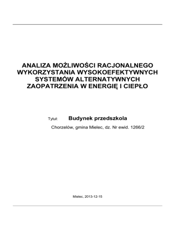 ANALIZA MOŻLIWOŚCI RACJONALNEGO WYKORZYSTANIA WYSOKOEFEKTYWNYCH SYSTEMÓW ALTERNATYWNYCH ZAOPATRZENIA W ENERGIĘ I CIEPŁO Tytuł: Budynek przedszkola Chorzelów, gmina Mielec, dz. Nr ewid. 1266/2 Mielec, 2013-12-15 Spis treści: 1. Dane budynku 2. Zestawienie rocznego zapotrzebowania na energię użytkową 3. Dostępne nośniki energii 4. Warunki przyłączenia do sieci zewnętrznych 5. Opis systemów zapotrzebowania w energię do analizy porównawczej 6. Charakterystyka źródeł energii systemu ogrzewania i wentylacji 7. Charakterystyka źródeł energii systemu przygotowania ciepłej wody 8. Charakterystyka źródeł energii systemu oświetlenia wbudowanego 9. Wykresy porównawcze zużycia nośników energii 10. Wskaźniki emisji zanieczyszczeń poszczególnych systemów i nośników energii 11. Emisja zanieczyszczeń poszczególnych systemów w budynku 12. Obliczenia optymalizacyjno-porównawcze emisji zanieczyszczeń (aspekt środowiskowy) 13. Wyniki analizy porównawczej i wybór systemu zapotrzebowania na energię 1. Dane budynku Przeznaczenie budynku: Szkolno-oświatowe - Przedszkole Strefa klimatyczna: III Stacja meteorologiczna: Tarnów 2 Powierzchnia zabudowy Az=311,70 m Powierzchnia o regulowanej temperaturze Af=469,61 m Powierzchnia użytkowa A=541,77 m 3 Kubatura budynku V=3399,44 m Liczba kondygnacji: 3 2 2 2. Zestawienie rocznego zapotrzebowania na energię użytkową 2.1. Zestawienie rocznego zapotrzebowania na energię użytkową dla systemu ogrzewania i wentylacji 2.1.1. System projektowany Lp. Rodzaj paliwa Udział % QH,nd [kWh/rok] 1 Paliwo - olej opałowy 100,0 42398,8 Zapotrzebowanie na energię elektryczną - produkcji mieszanej od urządzeń pomocniczych systemu ogrzewania i wentylacji: 340,47 kWh/rok 2.1.2. System alternatywny Lp. Rodzaj paliwa Udział % QH,nd [kWh/rok] 1 Paliwo - gaz ziemny 100,0 42398,8 Zapotrzebowanie na energię elektryczną - produkcji mieszanej od urządzeń pomocniczych systemu ogrzewania i wentylacji: 340,47 kWh/rok 2.2. Zestawienie rocznego zapotrzebowania na energię użytkową dla systemu przygotowania ciepłej wody 2.2.1. System projektowany Lp. Rodzaj paliwa Udział % QW,nd [kWh/rok] 1 Paliwo - olej opałowy 100,0 15691,1 Zapotrzebowanie na energię elektryczną - produkcji mieszanej od urządzeń pomocniczych systemu przygotowania ciepłej wody: 191,13 kWh/rok 2.2.2. System alternatywny Lp. Rodzaj paliwa Udział % QW,nd [kWh/rok] 1 Paliwo - Kolektory słoneczne termiczne 40,0 6276,5 2 Paliwo - gaz ziemny 60,0 9414,7 Zapotrzebowanie na energię elektryczną - produkcji mieszanej od urządzeń pomocniczych systemu przygotowania ciepłej wody: 492,62 kWh/rok 2.3. Zestawienie rocznego zapotrzebowania na energię użytkową dla systemu oświetlenia wbudowanego 2.3.1. System projektowany Lp. Rodzaj paliwa Udział % QL,nd [kWh/rok] 1 Energia elektryczna - produkcja mieszana 100,0 10484,9 Zapotrzebowanie na energię elektryczną - produkcji mieszanej od urządzeń pomocniczych systemu oświetlenia wbudowanego: 5,00 kWh/rok 3. Dostępne nośniki energii W budynku znajduje się kocioł olejowy, współpracujący z zasobnikiem ciepłej wody użytkowej. 4. Warunki przyłączenia do sieci zewnętrznych Budynek posiada istniejące przyłącza. 5. Opis systemów zapotrzebowania w energię do analizy porównawczej Lp. Nazwa systemu Wariant projektowany 1 System ogrzewania TAK, Źródło 'Kocioł olejowy' o udziale procentowym 100,00 % na paliwo Paliwo - olej opałowy o wH=1,10, typu Kotły niskotemperaturowe gazowe lub olejowe z zamkniętą komorą spalania i palnikiem modulowanym do 50-120kW o sprawności wytwarzania ηH,g=0,94, Ogrzewanie wodne z grzejnikami członowymi lub płytowymi z regulacją centralną adaptacyjną i miejscową o sprawności regulacji ηH,e=0,98, C.o. wodne z źródłem w budynku, z zaizolowanymi przewodami, armaturą i urządzeniami w pom. ogrzewanych o sprawności przesyłu ηH,d=0,97, Brak zasobnika buforowego o sprawności akumulacji ηH,s=1,00. 2 System wentylacji TAK, z przewagą wentylacji typu 'Wentylacja grawitacyjna' o strumieniu powietrza Vo=1003,50 m3/h. System ciepłej wody TAK, Źródło 'Kocioł olejowy' o udziale procentowym 100,00 % na paliwo Paliwo - olej opałowy o wW=1,10, typu Kotły niskotemperaturowe o mocy ponad 50 kW o sprawności wytwarzania ηW,g=0,90, Centralne przygotowanie c.w.u., instalacja z cyrkulacją z ograniczonym czasem pracy i pełną izolacją przewodów o sprawności przesyłu ηW,d=0,80, Zasobnik w systemie wg standardu budynku niskoenergetycznego o sprawności akumulacji ηW,s=0,84. System oświetlenia wbudowanego TAK, Źródło 'Nowe źródło światła' o regulacji Ręczna wpływu światła dziennego o współczynniku FD=1,00, i regulacji Ręczna, wpływu nieobecności pracowników w miejscu pracy FO=1,00, i współczynniku obciążenia natężenia oświetlenia FC=0,90, o średniej ważonej mocy opraw oświetleniowych PN=12,40 W/m2. 3 4 6. Charakterystyka źródeł energii systemu ogrzewania i wentylacji 6.1. Budynek projektowany Rodzaj paliwa Udział % ηH,tot Hu Jedn. QK,H [kWh/rok] Zużycie paliwa Jedn. B Paliwo - olej opałowy 100,0 0,89 10,08 kWh/l 47449,1 4707,2 l/rok Zapotrzebowanie na energię elektryczną - produkcji mieszanej od urządzeń pomocniczych systemu ogrzewania i wentylacji: 340,47 kWh/rok 6.2. Budynek z alternatywnymi źródłami Rodzaj paliwa Udział % ηH,tot Hu Jedn. Paliwo - gaz ziemny 100,0 0,89 9,97 kWh/m 3 QK,H [kWh/rok] Zużycie paliwa Jedn. B 47449,1 4759,2 3 m /rok Zapotrzebowanie na energię elektryczną - produkcji mieszanej od urządzeń pomocniczych systemu ogrzewania i wentylacji: 340,47 kWh/rok 6.3. Porównanie zużycia nośników energii dla budynku projektowanego i źródła alternatywnego Wykres porównawczy zużycia nośników energii dla systemu ogrzewania i wentylacji 7. Charakterystyka źródeł energii systemu przygotowania ciepłej wody 7.1. Budynek projektowany Rodzaj paliwa Udział % ηW,tot Hu Jedn. QK,W [kWh/rok] Zużycie paliw