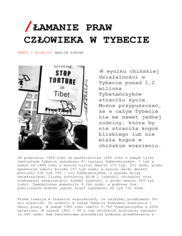 /ŁAMANIE PRAW CZŁOWIEKA W TYBECIE TEKST I ZDJĘCIA: MARCIN PINIAK W wyniku chińskiej działalności w Tybecie ponad 1,2 miliona Tybetańczyków straciło życie. Można przypuszczać, że w całym Tybecie nie ma nawet jednej rodziny, która by nie straciła kogoś bliskiego lub nie miała kogoś w chińskim więzieniu. Od powstania 1959 roku do października 1960 roku w samym tylko centralnym Tybecie zgładzono 87 tysięcy Tybetańczyków. I tak w sumie od 1949 roku w wyniku tortur umarło 173 tyś. 221 osób, przez egzekucje zabito blisko 157 tyś osób, w wyniku walki śmierć poniosło 432 tyś 705 - ciu Tybetańczyków. Z powodu wciąż zwiększającej liczby żołnierzy AL-W i ludności chińskiej oraz niebywałej eksploatacji źródeł żywności z głodu zmarło 343 tyś ludzi. Samobójstwo popełniło 9 tyś osób, a podczas tzw. publicznych wieców „walki klas” zgładzono 92 tyś 731 osób. Przed inwazją w Lhaskich więzieniach, co najwyżej przebywało 30stu więźniów. Po aneksji w całym Tybecie budowano więzienia i obozy pracy. W samym 1950 roku zabito 5.700 Tybetańczyków a 2000 uwięziono. W latach 1952 - 58 z rąk chińskich żołnierzy zginęło 10.000 osób. Sam Panczenlama powiedział podczas przemówienia w Pekinie w 1987 roku: “Gdyby powstał film o zbrodniach w prowincji Qinghai, zaszokowałby każdego widza. W Goloku ciała zabitych spychano ze wzgórza do głębokiego rowu. Żołnierze mówili krewnym zabitych, że powinni się cieszyć ze zdławienia rebelii. Zmuszano ich do tańczenia na ciałach pomordowanych, a potem wystrzelano ich z karabinów maszynowych. [...] W Amdo i Khamie dopuszczano się niesłychanych okrucieństw. Ludzi dzielono na dziesięcio, dwudziestoosobowe grupy i zabijano. [...] Zbrodnie te zostawiły głębokie urazy”. Od powstania 1959 roku do października 1960 roku w samym tylko centralnym Tybecie zgładzono 87 tysięcy Tybetańczyków. I tak w sumie od 1949 roku w wyniku tortur umarło 173 tyś. 221 osób, przez egzekucje zabito blisko 157 tyś osób, w wyniku walki śmierć poniosło 432 tyś 705 - ciu Tybetańczyków. Z powodu wciąż zwiększającej liczby żołnierzy AL-W i ludności chińskiej oraz niebywałej eksploatacji źródeł żywności z głodu zmarło 343 tyś ludzi. Samobójstwo popełniło 9 tyś osób, a podczas tzw. publicznych wieców „walki klas” zgładzono 92 tyś 731 osób. W samych więzieniach umierało 70 % zatrzymanych, podobnie było w obozach pracy, gdzie codziennie pozbywano się zwłok Tybetańczyków. Iluzję zmian miano w Tybecie po śmierci Mao Zedonga, kiedy to zliberalizowało gospodarkę, nawet zaczęto lepiej traktować więźniów politycznych. Jednak tak naprawdę polityka chińskich władz nie zmieniała się miała tylko chwile zastoju w niszczeniu narodu tybetańskiego. Palden Gajco tak opisywał tortury w chińskim więzieniu: „Wyjął z gniazdka pałkę i zaczął mnie stukać swoją nową zabawką. Każde uderzenie wywoływało paroksyzm bólu. Kiedy się tym znudził, wcisnął mi pałkę w usta, wykrzykując przy tym obelżywe słowa. I jeszcze raz.[...] Czułem się jakby moje ciało rozpadało się na kawałki.” Chińscy żołnierze podczas manifestacji strzelali bez ostrzeżeń do tłumu. Tak było w Lhasie podczas prawie każdej większej manifestacji. Holenderska turystka w grudniu 1988 roku była świadkiem jak podczas demonstracji w świątyni Dżokhangu chińscy żołnierze bez powodu zaczęli strzelać do tłumu. Tak relacjonowała to wydarzenie: “[...] policja otworzyła ogień bez żadnego ostrzeżenia, strzelano na oślep do tłumu. Miałam wrażenie, że nie obchodzi ich, kogo trafią. [...] Kiedy zaczęłam uciekać, postrzelono mnie w ramię”. Międzynarodowe organizacje humanitarne takie jak Amnesty International i Human Rights Watch donoszą, że pomimo faktu, że Chiny ratyfikowały Konwencję ONZ przeciwko torturom oraz okrutnemu, poniżającego traktowania człowieka zupełnie nie przestrzegają praw człowieka. I tak - dopuszczają się; przetrzymywania więźniów sumienia (np. głośna sprawa Tenzina Delka, skazanego na śmierć), bezprawnego przetrzymywania więźniów politycznych, torturowanie i brutalne metody przesłuchań i zatrzymań, stosowanie kary śmierci oraz wykonywanie wyroków śmierci poza sądem, czy bez jakiegokolwiek procesu. Prawo w Tybecie jest tak skonstruowane, że nie uwzględniają poszanowania wolności, nie obejmują praw człowieka zgodnych z standardem międzynarodowym. Przy czym podstawy do zatrzymania może stanowić byle powód (posiadanie tekstów religijnych, ubieranie tradycyjnych strojów, rozmowa z cudzoziemcem etc). Jeżeli dochodzi do zatrzymania to rodzina ma ogromny problem, aby ustalić podstawowe fakty, Chińczycy nie mają zwyczaju informować o fakcie uwięzienia. Przesłuchania głównie składają się z tortur, często jest to wręcz wymuszanie zeznań, przy czym metody tortur są najbardziej wymyślne, jakie mogą być. Jest to na przykład bicie (pięściami, kolbami karabinów, pałkami, żelaznymi prętami), przypalanie papierosami czy elektrycznymi pałkami, łamanie kończyn, w taki sam sposób przesłuchuje się kobiety. Tybetańczyk zatrudniony w Biurze Bezpieczeństwa Wewnętrznego wyliczył 33 sposoby torturowania więźniów. Jak wiadomo Chiny mają kilkudziesięcioletnią tradycję łamania praw człowieka w własnym kraju, szczególnie podczas panowania ustroju totalitarnego. Pod tym względem z perspektywy jednej ze starszych w dziejach istniejącej po dziś cywilizacji i ojczyzny konfucjanizmu Chiny wręcz cofają się w rozwoju pod względem poszanowania praw jednostki czy zasad moralnych. Wystarczy wymienić kilka „epizodów” z XX wiecznych Chin by to zrozumieć. Ot, choćby kampanię „trzech” i „pięciu anty” (1949 - 1952), Kampanię „antyprawicową” z 1957 roku (zabito 100 tyś „kontrrewolucjonistów”, rozpoczęto prześladowania 1,7 mln ludzi i miliony pod