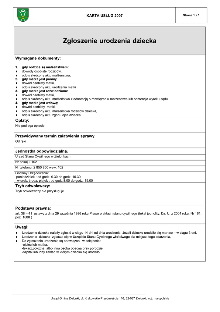 KARTA USŁUG 2007 Strona 1 z 1 Zgłoszenie urodzenia dziecka Wymagane dokumenty: 1. ♦ ♦ 2. ♦ ♦ 3. ♦ ♦ 4. ♦ ♦ ♦ gdy rodzice są małżeństwem: dowody osobiste rodziców, odpis skrócony aktu małżeństwa, gdy matka jest panną: dowód osobisty matki, odpis skrócony aktu urodzenia matki gdy matka jest rozwiedziona: dowód osobisty matki, odpis skrócony aktu małżeństwa z adnotacją o rozwiązaniu małżeństwa lub sentencja wyroku sądu gdy matka jest wdową: dowód osobisty matki, odpis skrócony aktu małżeństwa rodziców dziecka, odpis skrócony aktu zgonu ojca dziecka. Opłaty: Nie podlega opłacie Przewidywany termin załatwienia sprawy: Od ręki Jednostka odpowiedzialna: Urząd Stanu Cywilnego w Zielonkach Nr pokoju: 102 Nr telefonu: 2 850 850 wew. 102 Godziny Urzędowania: poniedziałek : od godz. 9.30 do godz. 16.30 wtorek, środa, piątek : od godz.8.00 do godz. 15.00 Tryb odwoławczy: Tryb odwoławczy nie przysługuje Podstawa prawna: art. 38 – 41 ustawy z dnia 29 września 1986 roku Prawo o aktach stanu cywilnego (tekst jednolity: Dz. U. z 2004 roku, Nr 161, poz. 1688 ) Uwagi: ♦ ♦ ♦ Urodzenie dziecka należy zgłosić w ciągu 14 dni od dnia urodzenia. Jeżeli dziecko urodziło się martwe – w ciągu 3 dni. Urodzenie dziecka zgłasza się w Urzędzie Stanu Cywilnego właściwego dla miejsca tego zdarzenia. Do zgłoszenia urodzenia są obowiązani w kolejności: -ojciec lub matka, -lekarz,położna, albo inna osoba obecna przy porodzie, -szpital lub inny zakład w którym dziecko się urodziło Urząd Gminy Zielonki, ul. Krakowskie Przedmieście 116, 32-087 Zielonki, woj. małopolskie
