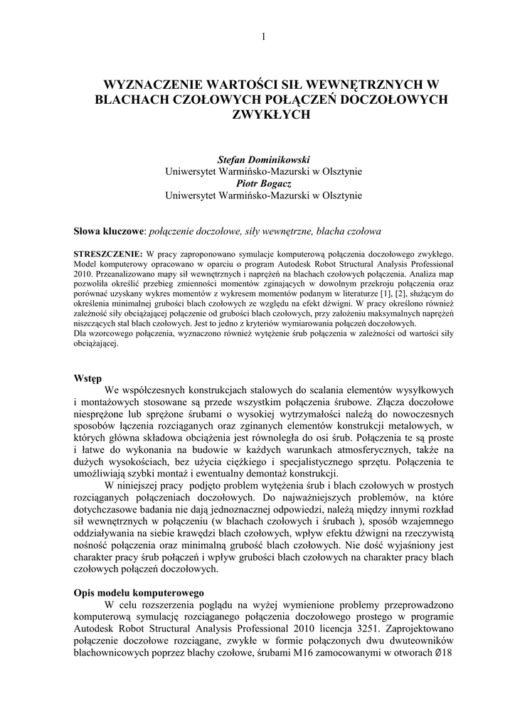 1 WYZNACZENIE WARTO CI SI WEWN TRZNYCH W BLACHACH CZO OWYCH PO CZE DOCZO OWYCH ZWYK YCH Stefan Dominikowski Uniwersytet Warmi sko-Mazurski w Olsztynie Piotr Bogacz Uniwersytet Warmi sko-Mazurski w Olsztynie S owa kluczowe: po czenie doczo owe, si y wewn trzne, blacha czo owa STRESZCZENIE: W pracy zaproponowano symulacje komputerow po czenia doczo owego zwyk ego. Model komputerowy opracowano w oparciu o program Autodesk Robot Structural Analysis Professional 2010. Przeanalizowano mapy si wewn)trznych i napr)+e na blachach czo owych po czenia. Analiza map pozwoli a okre,li- przebieg zmienno,ci momentów zginaj cych w dowolnym przekroju po czenia oraz porówna- uzyskany wykres momentów z wykresem momentów podanym w literaturze [1], [2], s u+ cym do okre,lenia minimalnej grubo,ci blach czo owych ze wzgl)du na efekt d2wigni. W pracy okre,lono równie+ zale+no,- si y obci +aj cej po czenie od grubo,ci blach czo owych, przy za o+eniu maksymalnych napr)+e niszcz cych stal blach czo owych. Jest to jedno z kryteriów wymiarowania po cze doczo owych. Dla wzorcowego po czenia, wyznaczono równie+ wyt)+enie ,rub po czenia w zale+no,ci od warto,ci si y obci +aj cej. Wst&p We wspó czesnych konstrukcjach stalowych do scalania elementów wysy kowych i monta+owych stosowane s przede wszystkim po czenia ,rubowe. Z cza doczo owe niespr)+one lub spr)+one ,rubami o wysokiej wytrzyma o,ci nale+ do nowoczesnych sposobów czenia rozci ganych oraz zginanych elementów konstrukcji metalowych, w których g ówna sk adowa obci +enia jest równoleg a do osi ,rub. Po czenia te s proste i atwe do wykonania na budowie w ka+dych warunkach atmosferycznych, tak+e na du+ych wysoko,ciach, bez u+ycia ci)+kiego i specjalistycznego sprz)tu. Po czenia te umo+liwiaj szybki monta+ i ewentualny demonta+ konstrukcji. W niniejszej pracy podj)to problem wyt)+enia ,rub i blach czo owych w prostych rozci ganych po czeniach doczo owych. Do najwa+niejszych problemów, na które dotychczasowe badania nie daj jednoznacznej odpowiedzi, nale+ mi)dzy innymi rozk ad si wewn)trznych w po czeniu (w blachach czo owych i ,rubach ), sposób wzajemnego oddzia ywania na siebie kraw)dzi blach czo owych, wp yw efektu d2wigni na rzeczywist no,no,- po czenia oraz minimaln grubo,- blach czo owych. Nie do,- wyja,niony jest charakter pracy ,rub po cze i wp yw grubo,ci blach czo owych na charakter pracy blach czo owych po cze doczo owych. Opis modelu komputerowego W celu rozszerzenia pogl du na wy+ej wymienione problemy przeprowadzono komputerow symulacj) rozci ganego po czenia doczo owego prostego w programie Autodesk Robot Structural Analysis Professional 2010 licencja 3251. Zaprojektowano po czenie doczo owe rozci gane, zwyk e w formie po czonych dwu dwuteowników blachownicowych poprzez blachy czo owe, ,rubami M16 zamocowanymi w otworach Ø18 2 Rys. 1. Model blachy czo owej po czenia. Grubo,- blach czo owych po czenia doczo owego gb = 16mm . Grubo,- blach pr)tów czonych g p = 10mm . Po czenie blach czo owych zamodelowano jako po czenie utwierdzone blach w miejscach zamocowania ,rub cz cych blachy. Po czenie blach czo owych zrealizowano po czeniem sztywnym poprzez pr)t Ø16 symuluj cy w asno,ci ,ruby M16 kl. 8.8 z zablokowanymi wszystkimi stopniami swobody (Rys. 11). Stal blach czo owych i pr)tów czonych przyj)to S235. >ruby zamodelowano ze stali o w asno,ciach mechanicznych zbli+onych do stali ,rub klasy 8.8. Doln cz),- po czenia podparto podporami liniowymi przegubowymi. Do górnego, czonego pr)ta blachownicowego przy o+ono obci +enie w)z owe skupione. Obci +enie przy o+ono do ,rodkowego w)z a siatki MES na górnej kraw)dzi ,rodnika blachownicy. Za o+ono siatkowanie Metody Elementów Sko czonych metod Coonsa z mo+liwo,ci automatycznego dopasowania siatek MES. W otoczeniu po cze widoczne kody zablokowanych stopni swobody. W nast)pnym etapie symulacji, zmieniano grubo,ci blach czo owych, ustalaj c zale+no,ci si y wywo uj cej niszcz ce napr)+enia normalne od grubo,ci blach czo owych. Wyznaczono równie+ warto,- si y obci +aj cej po czenie, przy której wyt)+enia stali ,rub s bliskie jedno,ci. Analiza wyników Utworzono map) napr)+e normalnych na górnych powierzchniach blach czo owych (Rys. 4), map) momentów zginaj cych My (Rys. 5) oraz map) przemieszcze ,rodków siatki MES (Rys. 6). Jednocze,nie, w otoczeniu oddzia ywania ,rub, utworzono wykres zmienno,ci momentów zginaj cych weryfikuj cy przyj)te w literaturze wykresy momentów zginaj cych [1]; [2] (przekrój A-A) (Rys. 7). Dó towski [1] podaje wykres momentów zginaj cych na powierzchni styku blach czo owych zak adaj c zerow warto,momentów na kraw)dziach pod u+nych blach czo owych (Rys. 2). Rys. 2 Efekt d"wigni i wykres momentów na powierzchni blachy czo owej po czenia doczo owego [1]; [2]; [3] Korzystaj c z takiego wykresu momentów, wyprowadza znan zale+no,- normow na minimaln grubo,- blach czo owych. Zak ada si), +e moment Mz =~0,66 Z·c1 (Rys. 2). Wydzielaj c my,lowo pasek blachy czo owej o szeroko,ci bs mo+na okre,li- warto,momentu Mz [3]. M = 0,66 c Z = W f d M W 1 bz t 2 6 0,66c Z = 0,167 b z t 2 f d W= t= fd (1) (2) (3) c S Rt 0,66 c S Rt =2 bz f d 0,167 bz f d Ze wzgl)du na ograniczenie wzrostu warto,ci si y w ,rubie wywo anego efektem d2wigni, przyjmuje si) minimaln grubo,- blachy w po czeniu t min = 0,6t . 3 Rys. 3 Model komputerowy analizowanego po czenia Wówczas minimalna grubo,- blachy wynosi: t min = 0,6t = 1,2 c S Rt bz f d (4) Zale+no,- powy+sza jest wa+na przy za o+eniu zerowej warto,ci momentu zginaj cego na kraw)dziach blach czo owych [5]. W rzeczywisto,ci na kraw)dziach wyst)puj niezerowe, rezydualne warto,ci momentów zginaj cych oraz napr)+e normalnych (Rys. 3; Rys. 4). Za o+enie o zerowych momentach na kraw)dziach blachy jest w ,wietle analizy map napr)+e (Rys. 3; Rys. 4) do,- dobrym przybli+eniem. Wykres momentów (Rys. 2) jest zbli+ony do wykresu momentów (Rys. 7), ale przyjmowane warto,ci M2 (Rys. 2) s wi)ksze ni+ rzeczywi,cie wyst)puj ce (Rys. 7). Sp aszczenie wykr