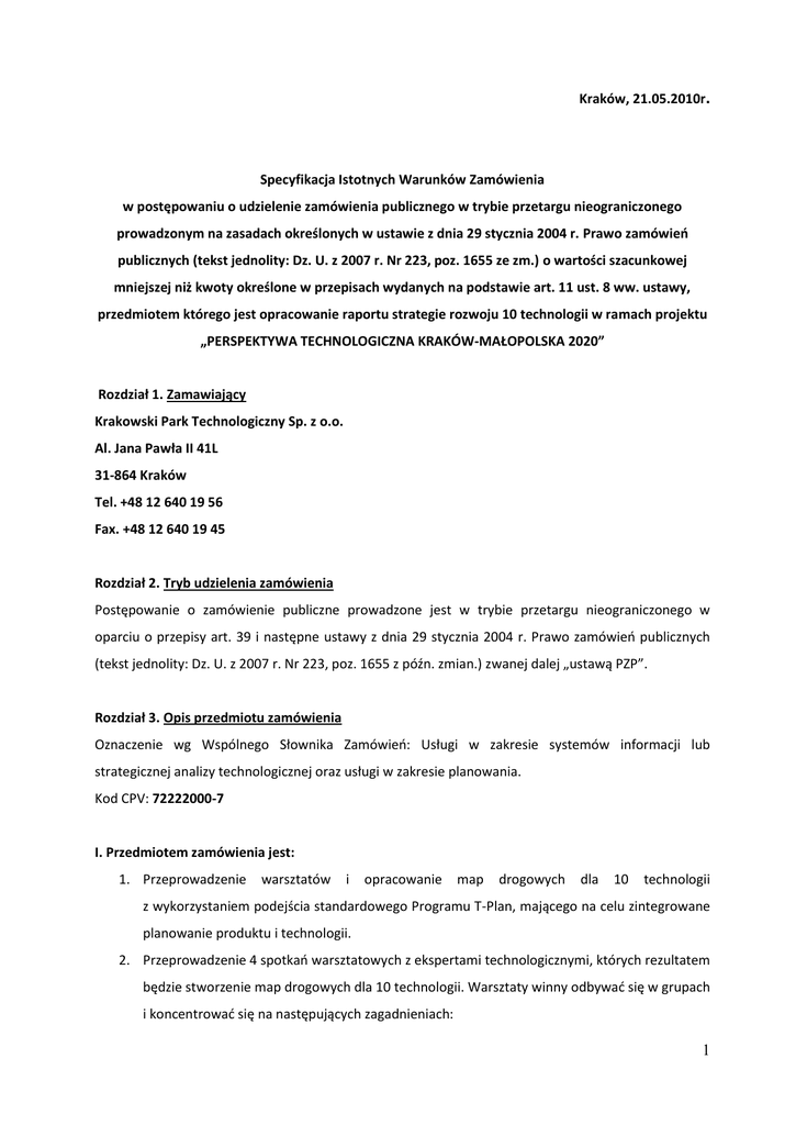Kraków, 21.05.2010r. Specyfikacja Istotnych Warunków Zamówienia w postępowaniu o udzielenie zamówienia publicznego w trybie przetargu nieograniczonego prowadzonym na zasadach określonych w ustawie z dnia 29 stycznia 2004 r. Prawo zamówieo publicznych (tekst jednolity: Dz. U. z 2007 r. Nr 223, poz. 1655 ze zm.) o wartości szacunkowej mniejszej niż kwoty określone w przepisach wydanych na podstawie art. 11 ust. 8 ww. ustawy, przedmiotem którego jest opracowanie raportu strategie rozwoju 10 technologii w ramach projektu „PERSPEKTYWA TECHNOLOGICZNA KRAKÓW-MAŁOPOLSKA 2020” Rozdział 1. Zamawiający Krakowski Park Technologiczny Sp. z o.o. Al. Jana Pawła II 41L 31-864 Kraków Tel. +48 12 640 19 56 Fax. +48 12 640 19 45 Rozdział 2. Tryb udzielenia zamówienia Postępowanie o zamówienie publiczne prowadzone jest w trybie przetargu nieograniczonego w oparciu o przepisy art. 39 i następne ustawy z dnia 29 stycznia 2004 r. Prawo zamówieo publicznych (tekst jednolity: Dz. U. z 2007 r. Nr 223, poz. 1655 z późn. zmian.) zwanej dalej „ustawą PZP”. Rozdział 3. Opis przedmiotu zamówienia Oznaczenie wg Wspólnego Słownika Zamówieo: Usługi w zakresie systemów informacji lub strategicznej analizy technologicznej oraz usługi w zakresie planowania. Kod CPV: 72222000-7 I. Przedmiotem zamówienia jest: 1. Przeprowadzenie warsztatów i opracowanie map drogowych dla 10 technologii z wykorzystaniem podejścia standardowego Programu T-Plan, mającego na celu zintegrowane planowanie produktu i technologii. 2. Przeprowadzenie 4 spotkao warsztatowych z ekspertami technologicznymi, których rezultatem będzie stworzenie map drogowych dla 10 technologii. Warsztaty winny odbywad się w grupach i koncentrowad się na następujących zagadnieniach: 1 2.1. warsztat 1, 2 i 3 – trzy kluczowe „warstwy” mapy drogowej: rynek/biznes, produkt/usługa i technologia 2.2. warsztat 4. – utworzenie kompletnej mapy drogowej zawierającej kamienie milowe, ranking produktów, zasoby, lukę rynkową i produktową oraz ramowe plany operacyjne. 3. Opracowanie wyników spotkao warsztatowych w postaci raportu „Strategie rozwoju dla 10 technologii”, będący podsumowaniem wszystkich 10 powstałych na warsztatach map drogowych. 4. Przygotowanie raportu, który zostanie następnie przedstawiony do akceptacji Komitetowi Sterującemu (w sposób umożliwiający jego prezentację zarówno w formie papierowej, jak i elektronicznej). 5. Przygotowanie raportu obejmuje ponadto przygotowanie streszczenia publikacji w języku polskim i angielskim oraz uwzględnienie uwag 3 recenzentów, wskazanych przez zamawiającego. Akceptacje zamawiającego powinny otrzymad ponadto wszystkie projekty okładek, stron tytułowych i redakcyjnych publikacji (pliki formatu .doc lub pdf.). 6. Zapewnienie minimum 5 godzin konsultacji dla pracowników Zamawiającego dla zapewnienia spójności wyników prac z innymi procesami realizowanymi w ramach projektu. II. Harmonogram realizacji zamówienia: 1. Opracowanie założeo metodologicznych warsztatów „Laboratoria Foresight” i raportu oraz zaprezentowanie jej na spotkaniu Grupy Roboczej – do dnia 22 czerwca 2010r. 2. Uzgodnienie treści metodologii, poprzez uzyskanie akceptacji Zamawiającego - do dnia 30 czerwca 2010 r. 3. Przeprowadzenie Laboratoriów Foresight wyników w miejscu i terminie wskazanym przez Zamawiającego do dnia 30 września 2010 r. 4. Analiza wyników Laboratoriów Foresight 5. Opracowanie oraz uzgodnienie raportu (uzyskanie akceptacji merytorycznej Zamawiającego) 6. Przygotowanie wersji ostatecznej raportu nie później niż do dnia 8 października 2010 r. 7. Przygotowanie prezentacji wyników badania 8. Przeprowadzenie prezentacji wyników w miejscu i terminie wskazanym przez Zamawiającego a następnie przekazanie wyników w formie raportu „Strategie rozwoju dla 10 technologii” (wydruk w 5 egzemplarzach + zapis w formie elektronicznej pliki formatu .doc i .pdf na CDRom). 9. Wykonanie całości przedmiotu umowy do dnia 30 października 2010 r. 2 III. Wyjaśnienia dotyczące przedmiotu zamówienia: W ramach II etapu projektu „Perspektywa Technologiczna Kraków Małopolska 2020” – zostanie wyselekcjonowanych 10 kluczowych technologii dla których opracowane zostaną mapy drogowe oraz strategie rozwoju. W celu opracowania map oraz zbudowania strategii rozwoju dla poszczególnych technologii zorganizowane zostaną spotkania warsztatowe z wybraną grupą naukowców i przedstawicieli biznesu tzw. „Laboratoria Foresight”. Rezultatem etapu II będzie raport dla 10 kluczowych technologii zawierający mapy drogowe rozwoju technologii. Raport zostanie przedstawiony Komitetowi Sterującemu do zaakceptowania. Komitet Sterujący wskaże też najbardziej prawdopodobny scenariusz rozwoju technologicznego województwa małopolskiego. W ramach Laboratoriów Foresight powstaną strategie rozwoju dla 10 wiodących zastosowao technologii. Mapy drogowe mają pomóc w ustanowieniu kluczowych powiązao pomiędzy technologiami i biznesem, identyfikacji luk rynkowych i produktowych, wspieraniu strategii i planowania rozwoju technologii w regionie, oraz wspieraniu komunikacji pomiędzy nauką i biznesem. Od strony organizacyjnej, w projekcie zaplanowano 4 jednodniowe warsztaty dla 50 ekspertów wybranych w poprzednim działaniu. Trzy pierwsze warsztaty skoncentrują się na trzech kluczowych „warstwach” mapy drogowej: rynek/biznes, produkt/usługa, i technologia, a wynikiem ostatniego będzie utworzenie mapy drogowej zawierającej kamienie milowe, ranking produktów, zasoby, lukę rynkową i produktową, ramowe plany operacyjne. Jako podsumowanie zostanie opracowany raport ogólny zawierający 10 map drogowych dla wybranych technologii. W ramach drugiego etapu projektu „Perspektywa Technologiczna Kraków – Małopolska 2020” przygotowane zostaną mapy drogowe dla 10 wybranych technologii. „Mapę drogową” należy rozumied jako adaptowaną od pewnego cz