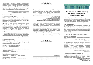 8.Korzystanie w Internecie z katalogów innych bibliotek Biblioteki innych uczelni często oferują dostęp do własnych katalogów online. Istnieje moŜliwość wypoŜyczenia poszukiwanej pozycji z biblioteki innej uczelni (takŜe z zagranicy) w systemie wypoŜyczeń międzybibliotecznych. Koszty sprowadzania dzieł określa cennik usług BUW. Jak korzystać z wypoŜyczeń międzybibliotecznych? „Regulamin korzystania ze zbiorów BUW” 9. Korzystanie z Internetu a) elektroniczne zasoby BUW Biblioteka Uniwersytecka w Warszawie oferuje oprócz zasobów w wersji drukowanej, równieŜ dostęp do zasobów elektronicznych. Są to czasopisma i bazy danych takich wydawców, jak ScienceDirect. Biblioteka Uniwersytecka w Warszawie Pracą dyplomową rządzą prawidła, którym podporządkować musi się kaŜdy. Dobrze napisana praca posiada konkretny układ treści, jest odpowiednio zredagowana itd. Okazuje się, Ŝe wielu osobom sprostanie tym wymaganiom sprawia trudności. Jak napisać pracę? Jak zredagować tekst? Jak prawidłowo stosować przypisy? Polecamy ksiąŜki z symbolem klasyfikacji: LB 2369 (Filozofia. Psychologia. Religia. Oświata, poziom 1) UWAGA! Z tych zasobów elektronicznych moŜna korzystać na komputerach zarejestrowanych w sieci UW. Pracownicy i studenci UW mają moŜliwość korzystania z dostępu do zasobów elektronicznych (wymagane jest logowanie – potrzebne dane uzyskuje się osobiście w WypoŜyczalni Miejscowej BUW) z domowych komputerów. KaŜdy autor pracy licencjackiej, magisterskiej itp., ma obowiązek dołączenia szczegółowej dokumentacji (bibliografii) literatury przedmiotu, wykorzystanej przez niego przy pisaniu pracy. Cytowanie nie jest naganne, a opieranie się na dokonaniach poprzedników stanowi regułę w pracy naukowej pod warunkiem, Ŝe wykorzystane źródła będą opisane w sposób jednolity, umoŜliwiający ich identyfikację. Wejście następuje ze strony BUW: www.buw.uw.edu.pl Wydawnictwa elektroniczne Czasopisma pełnotekstowe i bazy danych (bibliograficzne i inne) odpowiedni link Polecamy ulotkę: „Sporządzanie bibliografii załącznikowej” b) zasoby ogólnodostępne Wiele instytucji na swoich stronach www zamieszcza ciekawe informacje; umoŜliwia dostęp do róŜnego rodzaju baz bez jakichkolwiek ograniczeń, np.: SZUKAJ W NASTĘPUJĄCEJ KOLEJNOŚCI: lub spisy bibliografii specjalnych, bibliografii dziedzin czy zagadnień, np. Sawoniak Henryk: Międzynarodowa bibliografia bibliografii z zakresu informacji naukowej, bibliotekoznawstwa i dziedzin pokrewnych 1945-1978. Wrocław : Zakł. Nar. im. Ossolińskich, 1985. JeŜeli nie znasz bezpośrednich adresów do takich stron warto skorzystać np. z: www.emulti.pl www.google.pl www.yahoo.com Co to jest bibliografia? To uporządkowany spis dokumentów, dobranych wg określonych kryteriów, m.in. ze względu na formę wydawniczą dokumentów, (np. bibliografia zawierająca opisy ksiąŜek) czy opisy artykułów z czasopism lub ze względu na treść dokumentów (np. bibliografia publikacji na temat klonu). Znajdziesz w Czytelni Ogólnej, poziom 2: Z2521 .A1 B64 BAZTECH – http://baztech.icm.edu.pl MEDLINE – www.ncbi.nlm.nih.gov Popularne portale zagraniczne: http://dmoz.org/ Podstawą do przygotowania opracowania na dany temat jest zapoznanie się z publikacjami, które dotyczą określonego przedmiotu badań. Inaczej mówiąc, naleŜy zapoznać się z bibliografią danego tematu, zagadnienia czy problemu. 1. Bibliografie bibliografii Spisy bibliografii ogólnych, np. Bibliografia Bibliografii Polskich Polecamy ulotkę: „Bazy danych w Internecie” Najpopularniejsze portale polskie: www.onet.pl www.wp.pl www.interia.pl Jak szukać w BUW literatury do pracy licencjackiej, magisterskiej itp.? Znajdziesz w Czytelni Ogólnej, poziom 2: Z2521 .A1 B66 Agnieszka Wróbel Biblioteka Uniwersytecka w Warszawie, ul. Dobra 56/66, 00-312 Warszawa, tel.: (+48 22) 55 25 178 i 55 25 179 (Informatorium); (+48 22) 55 25 660 (Sekretariat), fax: (+48 22) 55 25 659,e-mail: [email protected], http://www.buw.uw.edu.pl 2. Bibliografie dziedzin lub zagadnień, np. Chałupczak Henryk: Mniejszości narodowe w Polsce: materiały do bibliografii: 1990-1996. Lublin : Wydaw. Uniwersytetu Marii Curie-Skłodowskiej, 1998. Znajdziesz w szerokiej dziedzinie: Nauki historyczne, poziom 1: DK4120 .C475 1998 3. Bibliografie załącznikowe Załączane do artykułów, do ksiąŜek. 4. Bibliografia Zawartości Czasopism – BZCz Miesięcznik wydawany od 1947 r. Rejestruje artykuły z czasopism i innych wydawnictw ciągłych ukazujących się w Polsce. Występuje w dwóch postaciach: a) drukowanej Ma układ systematyczny, a w obrębie poddziałów alfabetyczny według nazwisk autorów. KaŜdy zeszyt zaopatrzony jest w indeks autorów, recenzentów, tłumaczy, indeks przedmiotowy oraz alfabetyczny wykaz czasopism uwzględnionych w zeszycie. Znajdziesz w Czytelni Ogólnej, poziom 2: Z6956 .P7 B57 b) elektronicznej Od roku 1996; aktualizowana na bieŜąco. Na komputerach z dostępem do sieci UW (ULTRANET) Bibliografia narodowa polska 5. Przewodnik Bibliograficzny Tygodnik rejestrujący ksiąŜki ukazujące się w Polsce. Występuje w dwóch postaciach: a) drukowanej Ukazuje się od 1946 r. pod tytułem „Przewodnik Bibliograficzny: urzędowy wykaz druków wydanych w Rzeczypospolitej Polskiej”. Stanowi kontynuację „Urzędowego Wykazu Druków wydanych w Rzeczypospolitej Polskiej” wydawanego w latach 19281939. Znajdziesz w Czytelni Ogólnej, poziom 2: Z2523 .P78 b) elektronicznej Od roku 1980; aktualizowany na bieŜąco. Na komputerach z dostępem do sieci UW (ULTRANET) Bibliografia narodowa polska Jak korzystać w BUW z BZCz i Przewodnika Bibliograficznego? Polecamy ulotkę: „Polska Bibliografia Narodowa”. Uwaga! Bazy opisane w punktach: 1, 4, 5 dostępne są równieŜ w Internecie na stronie Biblioteki Narodowej: www.bn.org.pl Katalogi i bazy danych Bazy danych 6. Bazy danych a) Biblioteka oferuje wybór baz z róŜnych 
