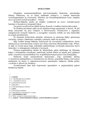 DYKTANDO Niespełna osiemnastoipółletnia pół-Amerykanka Henrietta, mieszkanka Dakoty Północnej, na co dzień studentka college’u, z trudem hamowała wszechogarniające ją wzruszenie. Wkrótce, po dwunastogodzinnym locie, znajdzie się w ojczyźnie swoich przodków – Polsce. Srebrno-błękitny jumbo jet miękko wylądował na nowo wybudowanym lotnisku w Kosakowie nieopodal Gdyni. Na gościa oczekiwał już daleki kuzyn, Kaszub o rzadkim imieniu Borzysław. Po krótkim powitaniu udali się do ekskluzywnego pensjonatu w Rewie. W pół drogi zatrzymali się przy świątyni w Pierwoszynie. Przybyszowi z zagranicy zaimponował rozmach budowli, a szczególne wrażenie zrobiły na nim malowidła na ścianie prezbiterium. Po niemalże królewskim obiedzie, złożonym ze smażonej flądry oprószonej rzeżuchą, z purée z bakłażana i koktajlu z jarmużu, udali się na plażę. Idąc wzdłuż brzegu Bałtyku zachwycali się wyczynami windsurferów chyżo mknących po niewzburzonej wodzie oraz florą rezerwatu Mechelińskie Łąki. Wtem, ni stąd, ni zowąd spoza kępy mikołajka nadmorskiego wychynęła jasnoszara mewa śmieszka i w okamgnieniu zniknęła w trzcinach. Późnym popołudniem dotarli do Mechelinek, gdzie delektując się filiżanką kakao i świeżutkimi wuzetkami, podziwiali zachód słońca na tarasie przy pięknym molo, wizytówce tej kaszubskiej wsi, współfinansowanym przez Unię Europejską. Dżdżysta środa uniemożliwiła plażowanie, więc nastolatka ubrana w żorżetową midispódnicę w różnobarwne esy-floresy, pojechała lśniąco czerwonym autobusem na basen w supernowoczesnym gimnazjum, będącym chlubą gminy i oczkiem w głowie jej włodarzy. Zwieńczeniem dnia było kupowanie upominków w pogórzańskiej galerii handlowej Szperk. ___ 1/ a. koledżu 2/ a. : (dwukropek) po przodków 3/ a. – (myślnik) po kuzyn 4/ a. przecinek po Kaszub 5/ a. Bożysław 6/ a. brak przecinka po obiedzie 7/ a. piure 8/ a. przecinek po Bałtyku 9/ a. przecinek po windsurferów i wodzie 10/ a. „Mechelińskie Łąki” 11/ a. Wtem, ni stąd, ni zowąd, spoza kępy… 12/ a. „Szperk”, Galerii Handlowej Szperk, „Galerii Handlowej Szperk”