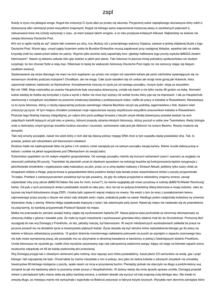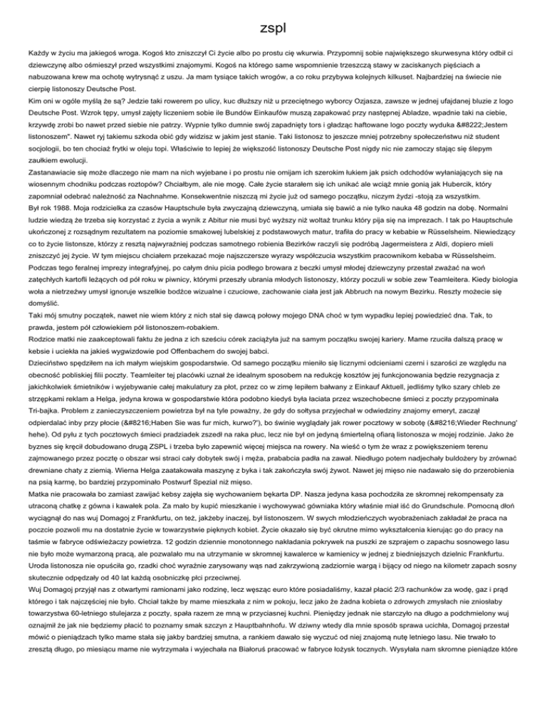 zspl Każdy w życiu ma jakiegoś wroga. Kogoś kto zniszczył Ci życie albo po prostu cię wkurwia. Przypomnij sobie największego skurwesyna który odbił ci dziewczynę albo ośmieszył przed wszystkimi znajomymi. Kogoś na którego same wspomnienie trzeszczą stawy w zaciskanych pięściach a nabuzowana krew ma ochotę wytrysnąć z uszu. Ja mam tysiące takich wrogów, a co roku przybywa kolejnych kilkuset. Najbardziej na świecie nie cierpię listonoszy Deutsche Post. Kim oni w ogóle myślą że są? Jedzie taki rowerem po ulicy, kuc dłuższy niż u przeciętnego wyborcy Ozjasza, zawsze w jednej ufajdanej bluzie z logo Deutsche Post. Wzrok tępy, umysł zajęty liczeniem sobie ile Bundów Einkaufów muszą zapakować przy następnej Abladze, wpadnie taki na ciebie, krzywdę zrobi bo nawet przed siebie nie patrzy. Wypnie tylko dumnie swój zapadnięty tors i gładząc haftowane logo poczty wyduka „Jestem listonoszem". Nawet ryj takiemu szkoda obić gdy widzisz w jakim jest stanie. Taki listonosz to jeszcze mniej potrzebny społeczeństwu niż student socjologii, bo ten chociaż frytki w oleju topi. Właściwie to lepiej że większość listonoszy Deutsche Post nigdy nic nie zamoczy stając się ślepym zaułkiem ewolucji. Zastanawiacie się może dlaczego nie mam na nich wyjebane i po prostu nie omijam ich szerokim łukiem jak psich odchodów wyłaniających się na wiosennym chodniku podczas roztopów? Chciałbym, ale nie mogę. Całe życie starałem się ich unikać ale wciąż mnie gonią jak Hubercik, który zapomniał odebrać należność za Nachnahme. Konsekwentnie niszczą mi życie już od samego początku, niczym żydzi -stoją za wszystkim. Był rok 1988. Moja rodzicielka za czasów Hauptschule była zwyczajną dziewczyną, umiała się bawić a nie tylko nauka 48 godzin na dobę. Normalni ludzie wiedzą że trzeba się korzystać z życia a wynik z Abitur nie musi być wyższy niż woltaż trunku który pija się na imprezach. I tak po Hauptschule ukończonej z rozsądnym rezultatem na poziomie smakowej lubelskiej z podstawowych matur, trafiła do pracy w kebabie w Rüsselsheim. Niewiedzący co to życie listonsze, którzy z resztą najwyraźniej podczas samotnego robienia Bezirków raczyli się podróbą Jagermeistera z Aldi, dopiero mieli zniszczyć jej życie. W tym miejscu chciałem przekazać moje najszczersze wyrazy współczucia wszystkim pracownikom kebaba w Rüsselsheim. Podczas tego feralnej imprezy integrafyjnej, po całym dniu picia podłego browara z beczki umysł młodej dziewczyny przestał zważać na woń zatęchłych kartofli leżących od pół roku w piwnicy, którymi przeszły ubrania młodych listonoszy, którzy poczuli w sobie zew Teamleitera. Kiedy biologia woła a nietrzeźwy umysł ignoruje wszelkie bodźce wizualne i czuciowe, zachowanie ciała jest jak Abbruch na nowym Bezirku. Reszty możecie się domyślić. Taki mój smutny początek, nawet nie wiem który z nich stał się dawcą połowy mojego DNA choć w tym wypadku lepiej powiedzieć dna. Tak, to prawda, jestem pół człowiekiem pół listonoszem-robakiem. Rodzice matki nie zaakceptowali faktu że jedna z ich sześciu córek zaciążyła już na samym początku swojej kariery. Mame rzuciła dalszą pracę w kebsie i uciekła na jakieś wygwizdowie pod Offenbachem do swojej babci. Dzieciństwo spędziłem na ich małym wiejskim gospodarstwie. Od samego początku mieniło się licznymi odcieniami czerni i szarości ze względu na obecność pobliskiej filii poczty. Teamleiter tej placówki uznał że idealnym sposobem na redukcję kosztów jej funkcjonowania będzie rezygnacja z jakichkolwiek śmietników i wyjebywanie całej makulatury za płot, przez co w zimę lepiłem bałwany z Einkauf Aktuell, jedliśmy tylko szary chleb ze strzępkami reklam a Helga, jedyna krowa w gospodarstwie która podobno kiedyś była łaciata przez wszechobecne śmieci z poczty przypominała Tri-bajka. Problem z zanieczyszczeniem powietrza był na tyle poważny, że gdy do sołtysa przyjechał w odwiedziny znajomy emeryt, zaczął odpierdalać inby przy płocie (‘Haben Sie was fur mich, kurwo?'), bo świnie wyglądały jak rower pocztowy w sobotę (‘Wieder Rechnung' hehe). Od pyłu z tych pocztowych śmieci pradziadek zszedł na raka płuc, lecz nie był on jedyną śmiertelną ofiarą listonosza w mojej rodzinie. Jako że byznes się kręcił dobudowano drugą ZSPL i trzeba było zapewnić więcej miejsca na rowery. Na wieść o tym że wraz z powiększeniem terenu zajmowanego przez pocztę o obszar wsi straci cały dobytek swój i męża, prababcia padła na zawał. Niedługo potem nadjechały buldożery by zrównać drewniane chaty z ziemią. Wierna Helga zaatakowała maszynę z byka i tak zakończyła swój żywot. Nawet jej mięso nie nadawało się do przerobienia na psią karmę, bo bardziej przypominało Postwurf Spezial niż mięso. Matka nie pracowała bo zamiast zawijać kebsy zajęła się wychowaniem bękarta DP. Nasza jedyna kasa pochodziła ze skromnej rekompensaty za utraconą chatkę z gówna i kawałek pola. Za mało by kupić mieszkanie i wychowywać gówniaka który właśnie miał iść do Grundschule. Pomocną dłoń wyciągnął do nas wuj Domagoj z Frankfurtu, on też, jakżeby inaczej, był listonoszem. W swych młodzieńczych wyobrażeniach zakładał że praca na poczcie pozwoli mu na dostatnie życie w towarzystwie pięknych kobiet. Życie okazało się być okrutne mimo wykształcenia kierując go do pracy na taśmie w fabryce odświeżaczy powietrza. 12 godzin dziennie monotonnego nakładania pokrywek na puszki ze szprajem o zapachu sosnowego lasu nie było może wymarzoną pracą, ale pozwalało mu na utrzymanie w skromnej kawalerce w kamienicy w jednej z biedniejszych dzielnic Frankfurtu. Uroda listonosza nie opuściła go, rzadki choć wyraźnie zarysowany wąs nad zakrzywioną zadziornie wargą i bijący od niego na kilometr zapach sosny skutecznie odpędzały od