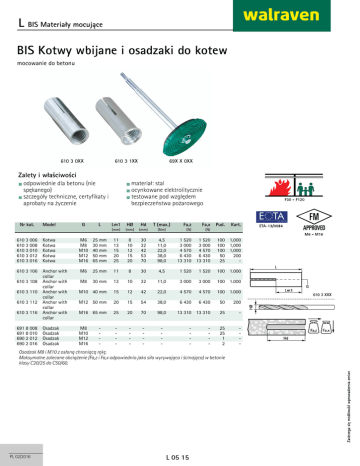 L BIS Materiały mocujące BIS Kotwy wbijane i osadzaki do kotew mocowanie do betonu Zalety i właściwości ■ odpowiednie dla betonu (nie spękanego) ■ szczegóły techniczne, certyfikaty i aprobaty na życzenie Nr kat. 610 3 006 610 3 008 610 3 010 610 3 012 610 3 016 610 3 106 610 3 108 610 3 110 610 3 112 610 3 116 691 8 008 691 8 010 690 2 012 690 2 016 Model G L ■ materiał: stal ■ ocynkowane elektrolitycznie ■ testowane pod względem bezpieczeństwa pożarowego Lm1 HØ Hd T (max.) (mm) (mm) (mm) (Nm) Fa,z Fa,x (N) (N) M6 M8 M10 M12 M16 25 mm 30 mm 40 mm 50 mm 65 mm 11 13 15 20 25 8 10 12 15 20 30 32 42 53 70 4,5 11,0 22,0 38,0 98,0 Anchor with collar Anchor with collar Anchor with collar Anchor with collar Anchor with collar M6 25 mm 11 8 30 4,5 1 520 1 520 100 1.000 M8 30 mm 13 10 32 11,0 3 000 3 000 100 1.000 M10 40 mm 15 12 42 22,0 4 570 4 570 100 1.000 M12 50 mm 20 15 54 38,0 6 430 6 430 50 200 M16 65 mm 25 20 70 98,0 13 310 13 310 25 - M8 M10 M12 M16 - - - - 25 25 1 2 - - - - 100 1,000 100 1,000 100 1,000 50 200 25 - Osadzak M8 i M10 z osłoną chroniącą rękę. Maksymalne zalecane obciążenie (Fa,z i Fa,x odpowiednio jako siła wyrywająca i ścinająca) w betonie klasy C20/25 do C50/60. PL 02/2016 Kart. Kotwa Kotwa Kotwa Kotwa Kotwa Osadzak Osadzak Osadzak Osadzak 1 520 1 520 3 000 3 000 4 570 4 570 6 430 6 430 13 310 13 310 Pud. L 05 15