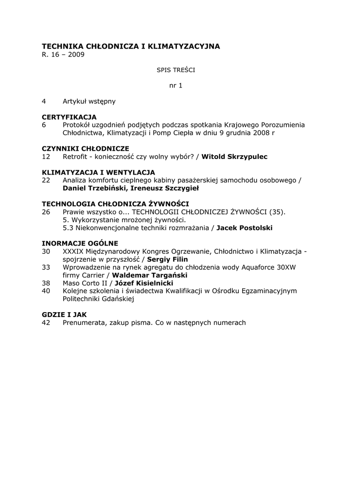 TECHNIKA CHŁODNICZA I KLIMATYZACYJNA R. 16 – 2009 SPIS TREŚCI nr 1 4 Artykuł wstępny CERTYFIKACJA 6 Protokół uzgodnień podjętych podczas spotkania Krajowego Porozumienia Chłodnictwa, Klimatyzacji i Pomp Ciepła w dniu 9 grudnia 2008 r CZYNNIKI CHŁODNICZE 12 Retrofit - konieczność czy wolny wybór? / Witold Skrzypulec KLIMATYZACJA I WENTYLACJA 22 Analiza komfortu cieplnego kabiny pasaŜerskiej samochodu osobowego / Daniel Trzebiński, Ireneusz Szczygieł TECHNOLOGIA CHŁODNICZA śYWNOŚCI 26 Prawie wszystko o... TECHNOLOGII CHŁODNICZEJ śYWNOŚCI (35). 5. Wykorzystanie mroŜonej Ŝywności. 5.3 Niekonwencjonalne techniki rozmraŜania / Jacek Postolski INORMACJE OGÓLNE 30 XXXIX Międzynarodowy Kongres Ogrzewanie, Chłodnictwo i Klimatyzacja spojrzenie w przyszłość / Sergiy Filin 33 Wprowadzenie na rynek agregatu do chłodzenia wody Aquaforce 30XW firmy Carrier / Waldemar Targański 38 Maso Corto II / Józef Kisielnicki 40 Kolejne szkolenia i świadectwa Kwalifikacji w Ośrodku Egzaminacyjnym Politechniki Gdańskiej GDZIE I JAK 42 Prenumerata, zakup pisma. Co w następnych numerach nr 2 45 46 Artykuł wstępny Sylwetka i dorobek inŜ. Jacka Postolskiego TECHNOLOGIA CHŁODNICZA śYWNOŚCI 54 MroŜona Ŝywność wygodna. Część 5. Podstawy produkcji przemysłowej / Jacek Postolski 61 Utrwalanie zamraŜalnicze ryb i innych produktów morza. Część 4. Przechowywanie zamroŜonych produktów / Jacek Postolski 66 Prawie wszystko o... TECHNOLOGII CHŁODNICZEJ śYWNOŚCI (36) 5. Wykorzystanie mroŜonej Ŝywności. 5.4 Odwracalność zmian jakościowych / Jacek Postolski KLIMATYZACJA I WENTYLACJA 71 Generacja i propagacja dźwięku w zaworach regulacyjnych instalacji wodnych / Krzysztof Kaiser INORMACJE OGÓLNE 78 Seminarium firmy Danfoss na Politechnice Gdańskiej / Waldemar Targański 80 Kolejne szkolenia i świadectwa Kwalifikacji w Ośrodku Egzaminacyjnym Politechniki Gdańskiej ARTYKUŁY SPONSOROWANE 85 Sieciowe agregaty skraplające z elektroniczną regulacją wydajności do wieloparownikowych systemów chłodniczych. Część 1 - EMERSON GDZIE I JAK 90 Prenumerata, zakup pisma. Co w następnych numerach nr 3 93 Artykuł wstępny PODSTAWY TEORETYCZNE 94 Budowa, działanie i zastosowanie rurki ciepła. Cz. 1 / Przemysław Jakóbowski MIKROSIŁOWNIE 101 SpręŜarka chłodnicza jako maszyna ekspansyjna w obiegu ORC mikrosiłowni / Jan Wajs, Dariusz Mikielewicz, Jarosław Mikielewicz KLIMATYZACJA I WENTYLACJA 107 Propagacja dźwięku w atmosferze / Krzysztof Kaiser TECHNOLOGIA CHŁODNICZA śYWNOŚCI 114 Prawie wszystko o... TECHNOLOGII CHŁODNICZEJ śYWNOŚCI (37) 5. Wykorzystanie mroŜonej Ŝywności. 5.5 Jakość i trwałość produktów rozmroŜonych / Jacek Postolski INORMACJE OGÓLNE 118 IX Spotkanie Promocyjne Krajowej Sieci Serwisowej "Serwis Polska": Chłodnictwo - Klimatyzacja - Gastronomia 121 Warszawskie spotkanie branŜy wentylacyjnej / Waldemar Targański 125 Kolejne szkolenia i świadectwa Kwalifikacji w Ośrodku Egzaminacyjnym Politechniki Gdańskiej ARTYKUŁY SPONSOROWANE 127 Sieciowe agregaty skraplające z elektroniczną regulacją wydajności do wieloparownikowych systemów chłodniczych. Część 2 - EMERSON GDZIE I JAK 134 Prenumerata, zakup pisma. Co w następnych numerach nr 4/5 137 Artykuł wstępny TECHNIKA CHŁODNICZA W MEDYCYNIE 138 Selektywne chłodzenie mózgu noworodka po niedotlenieniu okołoporodowym. Cześć 1. Medyczne fakty oraz przegląd dostępnych rozwiązań systemów selektywnego chłodzenia mózgu / ElŜbieta śmuda PODSTAWY TEORETYCZNE 150 Budowa, działanie i zastosowanie rurki ciepła. Część 2. Wybrane zastosowania rurek ciepła - Przemysław Jakóbowski TECHNOLOGIA CHŁODNICZA śYWNOŚCI 157 Prawie wszystko o... TECHNOLOGII CHŁODNICZEJ śYWNOŚCI (38) 5. Wykorzystanie mroŜonej Ŝywności. 5.6 Zastosowanie przemysłowe zamroŜonych surowców / Jacek Postolski INORMACJE OGÓLNE 161 Poślizg we wdraŜaniu systemu certyfikacji w zakresie HFC - Krajowe Forum Chłodnictwa 166 Świat, o którym nie moŜna zapomnieć. Część 1 / Jerzy Skibiński, Jerzy Stella 172 XV Wrocławskie Targi KsiąŜki Naukowej / Jerzy Stachowiak 174 ROADSHOW: Czy producenci w Polsce są gotowi na odejście czynnika R 22? 179 Seminarium firmy TERMO SCHIESSL 180 Seminarium firm Honeywell i AVICOLD na Politechnice Gdańskiej / Zenon Bonca 183 Nagroda Prezesa Rady Ministrów dla Profesora Jana Stąsieka 184 KLIMA-THERM organizatorem Dorocznego Spotkania Dystrybutorów FUJITSU GENERAL 186 Kolejne szkolenia i świadectwa Kwalifikacji w Ośrodku Egzaminacyjnym Politechniki Gdańskiej ARTYKUŁY SPONSOROWANE 188 Ocena techniczno-ekonomiczna skutków montaŜu chłodnic i skraplaczy o obniŜonych charakterystykach pracy w porównaniu do urządzeń certyfikowanych / Umberto Merlo 192 Zastosowanie absorpcji w systemach skojarzonych - New Energy Transfer GDZIE I JAK 198 Prenumerata, zakup pisma. Co w następnych numerach nr 6/7 201 Artykuł wstępny TECHNIKA CHŁODNICZA W MEDYCYNIE 202 Selektywne chłodzenie mózgu noworodka po niedotlenieniu okołoporodowym. Cześć 2. Koncepcja hybrydowego systemu selektywnego chłodzenia mózgu noworodka / ElŜbieta śmuda CZYNNIKI CHŁODNICZE 208 Bezpieczne stosowanie amoniaku w urządzeniach chłodniczych / Konrad Kalinowski TECHNOLOGIA CHŁODNICZA śYWNOŚCI 217 Prawie wszystko o... TECHNOLOGII CHŁODNICZEJ śYWNOŚCI (39) 5. Wykorzystanie mroŜonej Ŝywności. 5.7 Przygotowanie zamroŜonych produktów do spoŜycia / Jacek Postolski INORMACJE OGÓLNE 224 Komunikat Ministerstwa Środowiska: Fluorowe gazy cieplarniane 225 4 lipca: Dzień Niepodległości czy Dzień Nicości? / Michał Dobrzyński 228 Walne Zebranie Członków Krajowego Forum Chłodnictwa 2009 / Michał Dobrzyński 232 Eksperci wymieniają doświadczenia w Norymberdze 234 Szczecin – miasto przyjazne reeferom / Sergiy Filin 237 Seminaria firm GEA Grasso i BUDERUS na Politechnice Gdańskiej / Waldemar Targański 239 Konferencja ProClimate 2009 w Poznaniu 241 Targi Ch