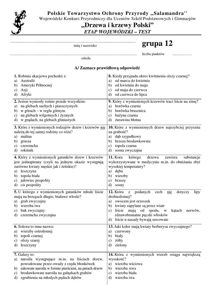 Polskie Towarzystwo Ochrony Przyrody ,,Salamandra'' Wojewódzki Konkurs Przyrodniczy dla Uczniów Szkół Podstawowych i Gimnazjów „Drzewa i krzewy Polski” ETAP WOJEWÓDZKI – TEST ........................................................................................................................................... imię i nazwisko grupa 12 ............................................................................................................................................ szkoła liczba punktów ..................... A/ Zaznacz prawidłową odpowiedź 1. Robinia akacjowa pochodzi z: a) Australii b) Ameryki Północnej c) Azji d) Afryki 8. Kiedy przypada okres kwitnienia olszy czarnej? a) od marca do kwietnia b) od kwietnia do maja c) od maja do czerwca d) od czerwca do lipca 2. Jesion wyniosły rośnie przede wszystkim: a) na glebach suchych i piaszczystych b) w górach – w reglu górnym c) na glebach wilgotnych i żyznych d) w grądach, na glebach gliniastych 9. Który z wymienionych krzewów traci liście na zimę? a) borówka czarna b) borówka brusznica c) bażyna czarna d) żurawina błotna 3. Które z wymienionych rodzajów drzew i krzewów nie należą do tej samej rodziny co róża? a) malina b) grusza c) czeremcha d) rokitnik 10. Które z wymienionych drzew najszybciej przyrasta na grubość? a) dąb szypułkowy b) brzoza brodawkowata c) topola czarna d) sosna zwyczajna 4. Który z wymienionych gatunków drzew i krzewów jest jednopienny (czyli na jednym okazie występują zarówno kwiaty męskie jak i żeńskie)? a) leszczyna b) topola biała c) jałowiec pospolity d) cis pospolity 11. Kora którego drzewa zawiera substancje wykorzystywane w medycynie m.in. do obniżania zbyt wysokiej temperatury? a) dębu b) wierzby c) brzozy d) sosny 5. U którego z wymienionych gatunków młode liście mają na brzegach długie, białawe włoski? a) grab zwyczajny b) wierzba iwa c) buk zwyczajny d) czeremcha zwyczajna 12. Która z podanych cech nie dotyczy lipy drobnolistnej? a) owocem jest orzeszek b) kwiaty zapylane są przez wiatr c) liście mają od spodu, w kątach nerwów, rdzawobrunatne pęczki włosków d) liście u nasady bywają sercowate 6. Sokora to inna nazwa: a) wierzby ostrolistnej b) topoli czarnej c) olszy szarej d) leszczyny 13. Jaki kolor mają kwiaty berberysu zwyczajnego? a) czerwony b) biały c) żółty d) zielony 7. Galasy to: a) narośla występujące m.in. na liściach drzew, powodowane przez owady z rzędu błonkówek b) rakowate narośla w formie pierścieni, na pniach drzew c) brodawkowate narośla na gałązkach grabów d) zgrubienia na młodych pędach dębów 14. Która z wymienionych wierzb osiąga największą wysokość? a) wierzba wiciowa b) wierzba siwa c) wierzba biała d) wierzba iwa B/ Oceń prawdziwość zdań 15. Kwiaty klonu zwyczajnego rozwinięciem się liści. TAK kwitną przed 18. U głogu dwuszyjkowego w owocach występują zwykle dwa nasiona. NIE TAK NIE 16. Brzoza brodawkowata zawdzięcza swoją nazwę 19. Kuliste owocostany platanu składają brodawkowatym wypukłościom pokrywającym korę pni pojedynczych owocków, zwanych orzeszkami. starszych okazów. TAK NIE TAK się z NIE 17. Buk wydaje duże ilości owoców regularnie co drugi 20. Ludowi rzeźbiarze wykorzystują często drewno lipy, rok. gdyż jest bardzo miękkie. TAK NIE TAK NIE C/ Odpowiedz na pytania 21. Jak nazywa się gatunek sosny, pochodzący z 23. Podaj nazwę gatunku drzewa lub krzewu, które jako Ameryki Północnej, posiadający po 5 igieł w pęczku, pierwsze objęte zostało w Polsce ochroną prawną. pospolicie uprawiany u nas zarówno w lasach, jak i w parkach? ........................................................................................ ........................................................................................ 22. Wymień pięć gatunków należących do rodzaju 24. Jaki kolor mają dojrzałe owoce wymienionych jarząb, występujących w Polsce w stanie dzikim. gatunków? ..................................................................................... irga zwyczajna – ........................................................... ..................................................................................... ligustr pospolity – ......................................................... ..................................................................................... ..................................................................................... ..................................................................................... szakłak pospolity – ....................................................... rokitnik zwyczajny – .................................................... D/ Podaj nazwy gatunkowe drzew, których fragmenty przedstawiono na rysunkach 25. ......................................................... 26. ......................................................... 27. .........................................................