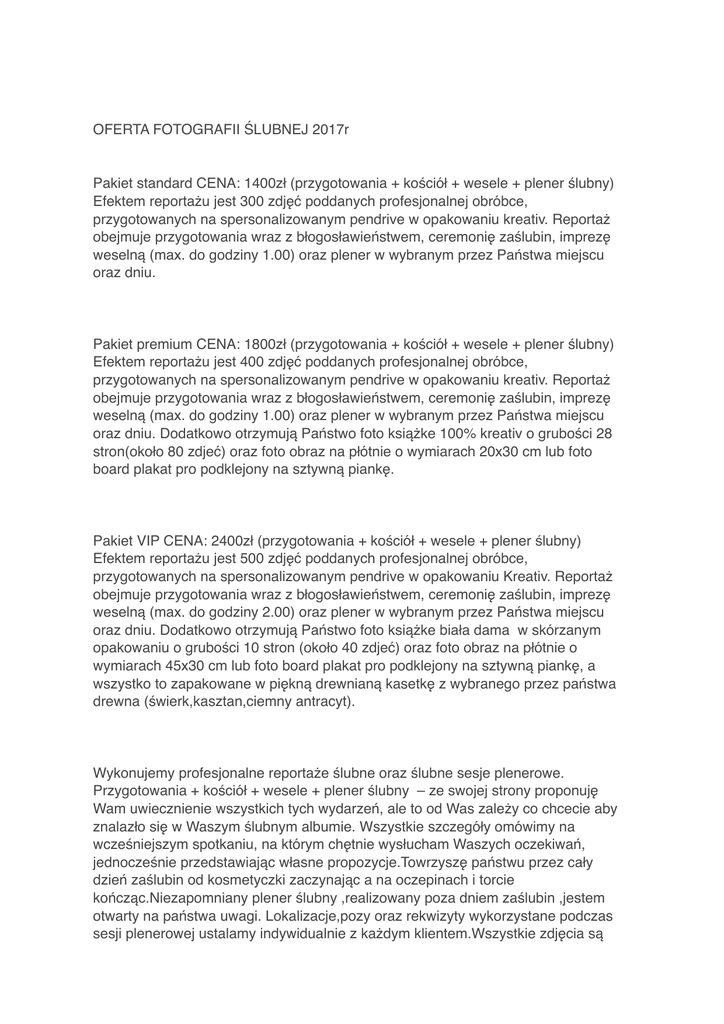 OFERTA FOTOGRAFII ŚLUBNEJ 2017r Pakiet standard CENA: 1400zł (przygotowania + kościół + wesele + plener ślubny) Efektem reportażu jest 300 zdjęć poddanych profesjonalnej obróbce, przygotowanych na spersonalizowanym pendrive w opakowaniu kreativ. Reportaż obejmuje przygotowania wraz z błogosławieństwem, ceremonię zaślubin, imprezę weselną (max. do godziny 1.00) oraz plener w wybranym przez Państwa miejscu oraz dniu. Pakiet premium CENA: 1800zł (przygotowania + kościół + wesele + plener ślubny) Efektem reportażu jest 400 zdjęć poddanych profesjonalnej obróbce, przygotowanych na spersonalizowanym pendrive w opakowaniu kreativ. Reportaż obejmuje przygotowania wraz z błogosławieństwem, ceremonię zaślubin, imprezę weselną (max. do godziny 1.00) oraz plener w wybranym przez Państwa miejscu oraz dniu. Dodatkowo otrzymują Państwo foto książke 100% kreativ o grubości 28 stron(około 80 zdjeć) oraz foto obraz na płótnie o wymiarach 20x30 cm lub foto board plakat pro podklejony na sztywną piankę. Pakiet VIP CENA: 2400zł (przygotowania + kościół + wesele + plener ślubny) Efektem reportażu jest 500 zdjęć poddanych profesjonalnej obróbce, przygotowanych na spersonalizowanym pendrive w opakowaniu Kreativ. Reportaż obejmuje przygotowania wraz z błogosławieństwem, ceremonię zaślubin, imprezę weselną (max. do godziny 2.00) oraz plener w wybranym przez Państwa miejscu oraz dniu. Dodatkowo otrzymują Państwo foto książke biała dama w skórzanym opakowaniu o grubości 10 stron (około 40 zdjeć) oraz foto obraz na płótnie o wymiarach 45x30 cm lub foto board plakat pro podklejony na sztywną piankę, a wszystko to zapakowane w piękną drewnianą kasetkę z wybranego przez państwa drewna (świerk,kasztan,ciemny antracyt). Wykonujemy profesjonalne reportaże ślubne oraz ślubne sesje plenerowe. Przygotowania + kościół + wesele + plener ślubny – ze swojej strony proponuję Wam uwiecznienie wszystkich tych wydarzeń, ale to od Was zależy co chcecie aby znalazło się w Waszym ślubnym albumie. Wszystkie szczegóły omówimy na wcześniejszym spotkaniu, na którym chętnie wysłucham Waszych oczekiwań, jednocześnie przedstawiając własne propozycje.Towrzyszę państwu przez cały dzień zaślubin od kosmetyczki zaczynając a na oczepinach i torcie kończąc.Niezapomniany plener ślubny ,realizowany poza dniem zaślubin ,jestem otwarty na państwa uwagi. Lokalizacje,pozy oraz rekwizyty wykorzystane podczas sesji plenerowej ustalamy indywidualnie z każdym klientem.Wszystkie zdjęcia są podawane cyfrowej obróbce fotograficznej , i wykonane w wysokiej jakości.Na życzenie klienta dodatkowo tworzymy foto książki (cena ustala indywidualnie,w zależności od rodzaju foto książki)Sesje wykonujemy na terenie Malborka i okolic, i nie tylko jesteśmy w stanie dojechać na terenie całego województwa Pomorskiego (a jeśli będzie trzeba w całym kraju i nie tylko)w takim przypadku trzeba doliczyć koszta dojazdu które ustalamy indywidualnie!Zdjęcia ślubne wykonane przeze mnie to gwarancja że z radością będziecie wielokrotnie przeżywać najważniejszy moment w swoim życiu. Wykonujemy również: – foto książki – foto albumy – opakowania na pendrive – opakowania na płyty CD/DVD – płyty DVD/CD z nadrukiem – opakowania na pendrive – penrdive z grawerem – fotogadżety – opakowania na odbitki – etui wsuwane na foto książki oraz albumy – kasetki drewniane na foto albumy oraz zdjęcia Zapraszamy Państwa na darmowe nie zobowiązujące spotkanie na którym przedstawię Państwu szczegółową ofertę oraz odpowiem na wszelkie pytania oraz przedstawię pełne materiały ślubne. Kontakt: Tel. 516-265-758 Mail. [email protected] www.jakubrutkowski.pl