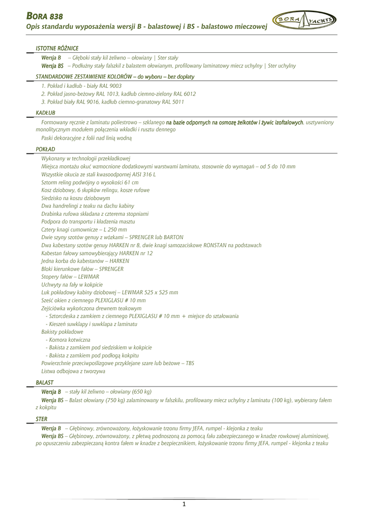 BORA 838 Opis standardu wyposażenia wersji B - balastowej i BS - balastowo mieczowej ISTOTNE RÓŻNICE Wersja B – Głęboki stały kil żeliwno – ołowiany | Ster stały Wersja BS – Podłużny stały falszkil z balastem ołowianym, profilowany laminatowy miecz uchylny | Ster uchylny STANDARDOWE ZESTAWIENIE KOLORÓW – do wyboru – bez dopłaty 1. Pokład i kadłub - biały RAL 9003 2. Pokład jasno-beżowy RAL 1013, kadłub ciemno-zielony RAL 6012 3. Pokład biały RAL 9016, kadłub ciemno-granatowy RAL 5011 KADŁUB Formowany ręcznie z laminatu poliestrowo – szklanego na bazie odpornych na osmozę żelkotów i żywic izoftalowych, oftalowych usztywniony monolitycznym modułem połączenia wkładki i rusztu dennego Paski dekoracyjne z folii nad linią wodną POKŁAD Wykonany w technologii przekładkowej Miejsca montażu okuć wzmocnione dodatkowymi warstwami laminatu, stosownie do wymagań – od 5 do 10 mm Wszystkie okucia ze stali kwasoodpornej AISI 316 L Sztorm reling podwójny o wysokości 61 cm Kosz dziobowy, 6 słupków relingu, kosze rufowe Siedzisko na koszu dziobowym Dwa handrelingi z teaku na dachu kabiny Drabinka rufowa składana z czterema stopniami Podpora do transportu i kładzenia masztu Cztery knagi cumownicze – L 250 mm Dwie szyny szotów genuy z wózkami – SPRENGER lub BARTON Dwa kabestany szotów genuy HARKEN nr 8, dwie knagi samozaciskowe RONSTAN na podstawach Kabestan fałowy samowybierający HARKEN nr 12 Jedna korba do kabestanów – HARKEN Bloki kierunkowe fałów – SPRENGER Stopery fałów – LEWMAR Uchwyty na fały w kokpicie Luk pokładowy kabiny dziobowej – LEWMAR 525 x 525 mm Sześć okien z ciemnego PLEXIGLASU # 10 mm Zejściówka wykończona drewnem teakowym - Sztorcdeska z zamkiem z ciemnego PLEXIGLASU # 10 mm + miejsce do ształowania - Kieszeń suwklapy i suwklapa z laminatu Bakisty pokładowe - Komora kotwiczna - Bakista z zamkiem pod siedziskiem w kokpicie - Bakista z zamkiem pod podłogą kokpitu Powierzchnie przeciwpoślizgowe przyklejane szare lub beżowe – TBS Listwa odbojowa z tworzywa BALAST Wersja B – stały kil żeliwno – ołowiany (650 kg) Wersja BS – Balast ołowiany (750 kg) zalaminowany w falszkilu, profilowany miecz uchylny z laminatu (100 kg), wybierany fałem z kokpitu STER Wersja B – Głębinowy, zrównoważony, łożyskowanie trzonu firmy JEFA, rumpel - klejonka z teaku Wersja BS – Głębinowy, zrównoważony, z płetwą podnoszoną za pomocą fału zabezpieczanego w knadze rowkowej aluminiowej, po opuszczeniu zabezpieczaną kontra fałem w knadze z bezpiecznikiem, łożyskowanie trzonu firmy JEFA, rumpel - klejonka z teaku 1 BORA 838 Opis standardu wyposażenia wersji B - balastowej i BS - balastowo mieczowej TAKIELUNEK Maszt (profil MAST 121 | L - 10 m | jedna para salingów) i bom aluminiowe anodowane Olinowanie stałe 5 mm: sztag, wanty kolumnowe i stenwanty, achtersztag napinany talią Istotne dla żeglugi olinowanie ruchome sprowadzone do kokpitu ŻAGLE Grot pełno listwowy 19 m², pełzacze + wózki przy listwach System szybkiego refowania grota - dwa refy obsługiwane z kokpitu Pokrowiec na grota LAZY JACK z tkaniny odpornej na promienie UV Genua 16 m² Szoty genuy, talia grota SILNIK Stacjonarny YANMAR 2YM15 - 10,3 KW (14 KM) z podwójnym obiegiem chłodzenia, zamontowany w pomieszczeniu wytłumionym trudno zapalną wykładziną dźwiękochłonną wraz z kompletnym osprzętem: - linia wału ze śrubą napędową 3 – płatową stałą 13' x 11 lub 2 – płatową stałą 15’ x 11 - pobór i filtr wody zaburtowej - linia wydechu: tłumik, syfon, wylot z klapką - wentylacja grawitacyjna komory silnika i bakisty z akumulatorami - tablica kontrolna w schowku z klapką z plexi (obrotomierz, licznik motogodzin, sygnalizacja: temperatury cieczy chłodzącej, oleju i ładowania), zamontowana w kokpicie w zasięgu ręki sternika - chromowana manetka zamontowana w kokpicie w zasięgu ręki sternika - instalacja paliwowa: zbiornik o pojemności 42 L, zawór odcinający, filtr paliwa z odstojnikiem wody, wskaźnik poziomu paliwa, wlew z pokładu, odpowietrzenie zbiornika - akumulator rozruchowy HAZE – AGM 55 Ah, wyłącznik główny - diodowy bezstratny separator ładowania akumulatorów INTELLE - oświetlenie komory silnika i bakisty z akumulatorami INSTALACJE: ELEKTRYCZNA (12 V), NAWIGACYJNA Akumulator HAZE – AGM 100 Ah Wyłącznik główny Główna tablica elektryczna INTELLE z rysunkiem lub nazwą jachtu: - 10 automatycznych bezpieczniko / włączników (lub więcej w przypadku montażu wyposażenia dodatkowego) - Gniazdo 12 V Dodatkowa tablica elektryczna INTELLE: - 2 automatyczne bezpieczniko / włączniki (lub więcej w przypadku montażu wyposażenia dodatkowego) Oświetlenie wnętrza – 6 lamp Kompletne oświetlenie nawigacyjne AQUA SIGNAL: lampa kotwiczna biała, lampa dwusektorowa dziobowa, lampa biała rufowa Kompas z podświetlaniem PLASTIMO CONTEST 101 INSTALACJE: WODNA, ZĘZOWA Instalacja wody czystej ciśnieniowa: zbiornik elastyczny 120 L napełniany z pokładu, 2 chromowane krany - w łazience i kambuzie, pompa 12 V ciśnieniowa, akumulator ciśnienia Pompa zęzowa elektryczna włączana automatycznie po zalaniu Pompa zęzowa ręczna z wbudowaną dźwignią obsługiwana z kokpitu WNĘTRZE JACHTU … wykonane jest z wysokiej jakości polskiej sklejki szkutniczej wykończonej mahoniem sapelli (opcjonalnie może być użyte inne drewno, np.: teak, czereśnia, jesion lub dąb). Powłoka lakiernicza, to twardy, wysokiej jakości półmatowy lakier poliuretanowy kładziony natryskowo. MESA Pięć szafek z drzwiczkami pod półpokładami Stół składany Kanapa dla trzech osób na lewej burcie (koja pojedyncza – opcjonalnie po rozłożeniu podwójna) Kanapa dla dwóch osób na prawej burcie Obszerne bakisty pod kanapami Schody ze wstawkami anty poślizgowymi z teaku Podłoga ze sklejki teakowej Pilers ze stali nierdzewnej 2 BORA 838 Opis standardu wyposażenia wersji B - balastowej i B