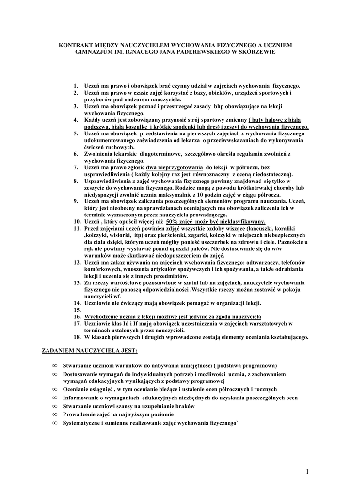 KONTRAKT MIĘDZY NAUCZYCIELEM WYCHOWANIA FIZYCZNEGO A UCZNIEM GIMNAZJUM IM. IGNACEGO JANA PADEREWSKIEGO W SKÓRZEWIE 1. 2. 3. 4. 5. 6. 7. 8. 9. 10. 11. 12. 13. Uczeń ma prawo i obowiązek brać czynny udział w zajęciach wychowania fizycznego. Uczeń ma prawo w czasie zajęć korzystać z bazy, obiektów, urządzeń sportowych i przyborów pod nadzorem nauczyciela. Uczeń ma obowiązek poznać i przestrzegać zasady bhp obowiązujące na lekcji wychowania fizycznego. Każdy uczeń jest zobowiązany przynosić strój sportowy zmienny ( buty halowe z białą podeszwą, białą koszulkę i krótkie spodenki lub dres) i zeszyt do wychowania fizycznego. Uczeń ma obowiązek przedstawienia na pierwszych zajęciach z wychowania fizycznego udokumentowanego zaświadczenia od lekarza o przeciwwskazaniach do wykonywania ćwiczeń ruchowych. Zwolnienia lekarskie długoterminowe, szczegółowo określa regulamin zwolnień z wychowania fizycznego. Uczeń ma prawo zgłosić dwa nieprzygotowania do lekcji w półroczu, bez usprawiedliwienia ( każdy kolejny raz jest równoznaczny z oceną niedostateczną). Usprawiedliwienia z zajęć wychowania fizycznego powinny znajdować się tylko w zeszycie do wychowania fizycznego. Rodzice mogą z powodu krótkotrwałej choroby lub niedyspozycji zwolnić ucznia maksymalnie z 10 godzin zajęć w ciągu półrocza. Uczeń ma obowiązek zaliczania poszczególnych elementów programu nauczania. Uczeń, który jest nieobecny na sprawdzianach oceniających ma obowiązek zaliczenia ich w terminie wyznaczonym przez nauczyciela prowadzącego. Uczeń , który opuścił więcej niż 50% zajęć może być nieklasyfikowany. Przed zajęciami uczeń powinien zdjąć wszystkie ozdoby wiszące (łańcuszki, koraliki ,kolczyki, wisiorki, itp) oraz pierścionki, zegarki, kolczyki w miejscach niebezpiecznych dla ciała dzięki, którym uczeń mógłby ponieść uszczerbek na zdrowiu i ciele. Paznokcie u rąk nie powinny wystawać ponad opuszki palców. Nie dostosowanie się do w/w warunków może skutkować niedopuszczeniem do zajęć. Uczeń ma zakaz używania na zajęciach wychowania fizycznego: odtwarzaczy, telefonów komórkowych, wnoszenia artykułów spożywczych i ich spożywania, a także odrabiania lekcji i uczenia się z innych przedmiotów. Za rzeczy wartościowe pozostawione w szatni lub na zajęciach, nauczyciele wychowania fizycznego nie ponoszą odpowiedzialności .Wszystkie rzeczy można zostawić w pokoju nauczycieli wf. Uczniowie nie ćwiczący mają obowiązek pomagać w organizacji lekcji. 14. 15. 16. Wychodzenie ucznia z lekcji możliwe jest jedynie za zgodą nauczyciela 17. Uczniowie klas Id i If mają obowiązek uczestniczenia w zajęciach warsztatowych w terminach ustalonych przez nauczycieli. 18. W klasach pierwszych i drugich wprowadzone zostają elementy oceniania kształtującego. ZADANIEM NAUCZYCIELA JEST: • • • • • • • Stwarzanie uczniom warunków do nabywania umiejętności ( podstawa programowa) Dostosowanie wymagań do indywidualnych potrzeb i możliwości ucznia, z zachowaniem wymagań edukacyjnych wynikających z podstawy programowej Ocenianie osiągnięć , w tym ocenianie bieżące i ustalenie ocen półrocznych i rocznych Informowanie o wymaganiach edukacyjnych niezbędnych do uzyskania poszczególnych ocen Stwarzanie uczniowi szansy na uzupełnianie braków Prowadzenie zajęć na najwyższym poziomie Systematyczne i sumienne realizowanie zajęć wychowania fizycznego` 1