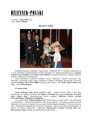 Czwartek, 2 lipca 2009 roku Autor: Piotr Gulbicki ZŁOTY LIŚĆ Popłynęła muzyka, popłynęły wspomnienia. Ambasada RP w Londynie zakołysała się w rytm przebojów dwudziestolecia międzywojennego. W takich klimatach prezes Związku Artystów Scen Polskich za Granicą Irena Delmar otrzymała Honorowy Dyplom Ministra Kultury i Dziedzictwa Narodowego. Dwaj konsulowie, wojskowe mundury. Artyści, dyplomaci, znajomi, przyjaciele. Salę ambasady wypełniają znane twarze polskiego Londynu. Bohaterka dzisiejszego wieczoru, laureatka Złotego Liścia Retro’2009, nie kryje zadowolenia. – To wielka radość widzieć was tutaj – mówi Irena Delmar. W małym kinie Tango milonga, tango mych marzeń i snów - znajome słowa, łezka w oku. Raz nastrojowo, raz bardziej frywolnie. Sex appeal, Umówiłem się z nią na dziewiątą, W małym kinie, Zimny drań... Rozbrzmiewają dawne szlagiery Henryka Warsa, Jerzego Petersburskiego, Władysława Szpilmana. Na scenie króluje Wojciech Dąbrowski. Mocny głos, wyczucie rytmu. Ten matematyk z wykształcenia – chociaż jak podkreśla z artystycznej rodziny - powołanie estradowe poczuł kilkanaście lat temu, po wygraniu muzycznego turnieju Szansa na sukces. Potem poszło już z górki. Regularnie przygotowuje artystyczne programy, śpiewa, prowadzi konferansjerkę. A przede wszystkim zainicjował i organizuje Ogólnopolski Festiwal Piosenki Retro im. Mieczysława Fogga, którego jest dyrektorem artystycznym. - Uwielbiam dawne polskie piosenki i ich niepowtarzalny czar. Jedyny w swoim rodzaju – powie nam później Dąbrowski, który do Londynu przywiózł specjalne wyróżnienie. Bukiety kwiatów Na środku konsul Robert Rusiecki. Obok dyrektor Dąbrowski oraz ta, na którą zwrócone są światła. Honorowy Dyplom przyznany przez Ministra Kultury i Dziedzictwa Narodowego Bogdana Zdrojewskiego trafia w ręce Ireny Delmar. Życzenia, gratulacje, uściski A wraz z nimi bukiety kwiatów, które wręczają między innymi słynna malarka Barbara Kaczmarowska Hamilton, znana polsko-żydowska działaczka Lili Pohlmann oraz pełna werwy, dziewięcioletnia córka konsula Jakuba Zaborowskiego – Zosia. To szczególny dyplom - wyróżnienie za całokształt działalności propagującej twórczość 20-lecia międzywojennego poza granicami Polski. Wyróżnienie, którym w tym roku – oprócz Ireny Delmar - uhonorowano również zakotwiczonego w Australii Gwidona Boruckiego; podczas wojny aktora Reprezentacyjnego Teatru Wojska Polskiego oraz pierwszego wykonawcy Czerwonych maków na Monte Cassino. Po wojnie Borucki mieszkał w Londynie, występował w angielskich i szkockich ośrodkach polonijnych, pracował w BBC, zagrał również w czterdziestu filmach. Potem osiadł w Australii, gdzie organizował rewie i kabarety, założył agencję artystyczną, a także australijską filię Związku Artystów Scen Polskich. Jak można się nudzić? Trwa koncert. Wykonującego z showmeńskim zacięciem kolejne piosenki Wojciecha Dąbrowskiego dzielnie wspomagają laureaci tegorocznego, szóstego już, Festiwalu Piosenki Retro - Tomasz Łozowicki oraz Przemysław Duda. Jak można się nudzić, jak można marudzić, że świat jest smutny, że jest źle, nie rozumiem, nie – śpiewają wspólnie z artystami zgromadzeni na sali goście. Wśród nich projektantka mody Basia Zarzycka, szefowa chóru Ave Verum Ewa Kwaśniewska oraz znana z działalności charytatywnej Krystyna Muraszko. A także sama Irena Delmar. Uśmiechnięta, pełna wigoru. To historia polskiej emigracji. Aktorka, śpiewaczka, organizatorka życia kulturalnego w polskim Londynie. Od 28 lat prezesuje Związkowi Artystów Scen Polskich za Granicą rozwijając i kontynuując tradycje teatrów oraz kabaretów Hemara, Ref-Rena, a także innych emigracyjnych twórców. I przyjdzie północ... Ostatnie dźwięki, ostatnie melodie. Koncert powoli dobiega końca, ale nie kończy się impreza. Czeka wino, można porozmawiać. – Ciekawy wieczór, prawdziwy wspomnień czar – przyznaje admirał Adam Mazurek z kwatery NATO. A attache obrony pułkownik Krzysztof Szymański, dodaje, że zawsze chętnie wraca do piosenek dwudziestolecia. Humor nie opuszcza aktorów - Grzegorza Stachurskiego (współorganizatora imprezy), Jerzego Jarosza oraz dobrego ducha każdej imprezy inżyniera Józefa Pieniążka. A także tych, którzy powoli opuszczają ambasadę. I tylko gdzieś w oddali nikną słowa piosenki: I będziemy szczęśliwi, weseli, aż przyjdzie północ i nas rozdzieli. I umówię się znów na dziewiątą, na dziewiątą tak jak dziś... Fot. Piotr Gulbicki