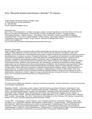 Kurs "Warsztat pisania scenariusza i dramatu" (IV edycja) Instytut Badań Literackich Polskiej Akademii Nauk ul. Nowy Świat 72, 00-330 Warszawa tel.: 530 064 008 e-mail: [email protected] Kierownik kursu: prof. dr hab. Anna Nasiłowska - profesor zwyczajny, pisarka, autorka biografii pary Jean-Paul Sartre i Simone de Beauvoir oraz Marii Pawlikowskiej- Jasnorzewskiej. Prozaik, opublikowała „Domino”, „Księgę początku”, „Czteroletnią filozofkę”, „Historie miłosne”. Jej powieść „Konik, szabelka” została nominowana do Nagrody Literackiej Gdyni. W roku 2013 wydała biografię Yoshiho Umedy, Japończyka, działacza pierwszej Solidarności zatytułowaną „Wolny agent Umeda i druga Japonia”. Sekretarz Polskiego PEN- Klubu. e-mail: [email protected] Zob. też http://ibl.waw.pl/pl/o-instytucie/pracownicy/nasilowska-anna Sekretarz: Anna Ryjak Celem zajęćjest napisanie scenariusza filmu krótkometrażowego lub dramatu scenicznego, który ma szansę realizacji. Jeśli połączenie w jednym warsztacie obu tych sztuk wyda się niektórym niemożliwe, warto, aby pamiętał, że film wywodzi się z wielowiekowej kultury teatru, a budowa scenariusza poddana jest podobnym prawom dramaturgicznym co pisanie na scenę. W naszej kulturze teatr i film wzajemnie korespondują i na siebie wpływają. Zaczniemy od poszukiwania inspiracji do twórczego pisania.Po wstępnej selekcji pomysłów, zajmiemy się ich rozwojem. Znajdziemy interesującego bohatera, wyróżnimy wątki, a następnie popracujemy nad strukturą dramatyczną tekstu. Przyjrzymy się technice budowania scen, potem sekwencji, aby ostatecznie stworzyć solidną konstrukcję dla treści. Zarówno praca scenarzysty, jak i dramaturga, to połączenie rzemiosła ze sztuką, dlatego zastanowimy się nad artystycznymi walorami poszczególnych projektów oraz kontekstem swej wypowiedzi. Każdy będzie miał szansę na wypracowanie indywidualnego języka wizualnego. Zajęcia te będą okazją do poznania samego siebie, swoich twórczych możliwości w zakresie podejmowanych tematów, języka i skonfrontowanie ich z grupą słuchaczy. W międzyczasie będziemy rozmawiać o najważniejszych dziełach z historii teatru, filmu oraz obserwować nowe kierunki w sztuce. Poznamy możliwości adaptacji literatury, przyjrzymy się sytuacji na rynku i możliwościom zaistnienia w branży. Zajęcia te mają za zadanie otworzyć przyszłych scenario i dramatopisarzy na pełną, choć oczywiście kontrolowaną przez nich, wolność twórczą. Wykładowcy: Magdalena Wleklik Scenariusz Tomasz Man Dramat W ramach kursu odbędą się spotkania z wybitnymi znawcami przedmiotu: Jackiem Kopcińskim, Iwoną Pomianowską oraz Maciejem Wieczorkiem. Magdalena Wleklik - scenarzysta, pisarz, reżyser. Autorka licznych scenariuszy filmowych, telewizyjnych oraz słuchowisk. Zadebiutowała w Teatrze Telewizji tekstem dramatu „Żółtodzioby”. Autorka powieści „Szykuj się do odlotu”, opowiadań publikowanych w prasie oraz antologiach. Laureatka konkursów pisarskich. Reżyser filmowy i słuchowisk Teatru Polskiego Radia. Debiutowała jako reżyser filmu fabularnego „Możesz być kim chcesz”, a radio słuchowiskiem "Mosty". Jej filmy miały pokazy na wielu festiwalach, m.in. na MFF w Cannes, RIFF w Rzymie, FPFF w Gdyni, Camerimage. Film „Kino” zdobył Award of Excellence na San Francisco Film Awards. Absolwentka PWSFTviT w Łodzi. Członkini Stowarzyszenia Filmowców Polskich. Tomasz Man - dramatopisarz, reżyser teatralny, autor adaptacji teatralnych i słuchowisk radiowych. Autor wielu dramatów, m.in. „Katarantka. Requiem. Nieszczęście w dwóch aktach”, „C(r)ash Europe”, „Świat jest skandalem”, „Sex Machine”. Sztuki były przetłumaczone i grane w wielu językach. Współzałożyciel Teatru pod Gryfami we Wrocławiu. Pełnił funkcję kierownika literackiego w Teatrze im. Siemaszkowej w Rzeszowie oraz konsultanta programowego w Teatrze im. Adama Mickiewicza w Częstochowie i w Teatrze Nowym Praga w Warszawie.Absolwent polonistyki naUniwersytecie Wrocławskim oraz reżyserii naAT w Warszawie. Debiutował jako reżyser„Balladyny”, wystawionej w Teatrze Dramatycznym w Białymstoku. W kolejnych latach reżyserował spektakle w całej Polsce. Od 2007 pracował jakoadiunktna Wydziale Lalkarskim we WrocławiuPaństwowej Wyższej Szkoły Teatralnej im. Ludwika Solskiego w Krakowie, gdzie w 2009 uzyskał doktorat. Habilitacja w 2013 r. PLANZAJĘĆ Warsztat pisania scenariusza – Magdalena Wleklik Zajęcia 1 Wspólna analiza tematów oraz rodzajów „filmowych” historii. Etapy jej powstawania oraz budowa scenariusza. Poznanie zagadnień storytellingu. Ćwiczenia dotyczące zdobywania dokumentacji do projektu. Zajęcia 2 Wspólne czytanie scenariusza, a następnie analiza filmu zrealizowanego na jego podstawie. Analiza różnic w myśleniu słowem a obrazem. Klasyczna struktura linearna dramatu i opracowanie jej na własne potrzeby. Zajęcia 3 Pisanie scenariusza dla różnych mediów, w tym dla wirtualnej rzeczywistości. Ćwiczenia praktyczne dotyczące zastosowania kontrastu i konfliktu. Poszukiwanie interesującego protagonisty i jego rozwój. Zajęcia 4 Budowanie napięcia poprzez obraz i słowo. Rola rekwizytu, a także szerzej: scenografii, kostiumu, charakteryzacji. Rola symbolu. Podkręcanie konfliktów wewnętrznych i zewnętrznych na przykładach. Zajęcia 5 Dialogi, ich rola oraz sposób wprowadzania. Projekt ścieżki dźwiękowej filmu. Ukrywanie albo ujawnianie informacji w scenariuszu. Tworzenie podtekstu. Zajęcia 6 Analiza tekstów pod kątem przygotowania scenopisu. Współpraca w środowisku filmowym. Sposoby prezentacji projektu i uczestnictwa w pitchingu. Warsztat pisania dramatu – Tomasz Man 1. Teoria: Arystotelesowska koncepcja dramatu - "Poetyka" Arystotelesa. Mit jako podstawa tragedii. Zajęcia praktyczne: Szukanie historia dla własnego tekstu. Umiejętność tworzenia układu zdarzeń.