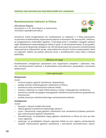 5EGPCTKWU\G\CLõçQRTCEQYCPGRT\G\)TWRõ4QDQE\ð'FW)+5YTC\\MQOGPVCT\GO ZŽnjŵŝĞƐnjĐnjĞŶŝĞůƵĚŶŽƑĐŝǁWŽůƐĐĞ DŝƌŽƐųĂǁĂZŽŐĂůĂ͕ G 'ŝŵŶĂnjũƵŵŶƌϭŝŵ͘:ĂŶĂWĂǁųĂ//ǁ^ŽĐŚĂĐnjĞǁŝĞ͕ ŵŝƌŽƐůĂǁĂ͘ƌŽŐĂůĂΛŶĞŽƐƚƌĂĚĂ͘Ɖů ^ĐĞŶĂƌŝƵƐnj njŽƐƚĂų ƉƌnjLJŐŽƚŽǁĂŶLJ ĚŽ njƌĞĂůŝnjŽǁĂŶŝĂ ŶĂ njĂũħĐŝĂĐŚ nj // ŬůĂƐČ ŐŝŵŶĂnjũƵŵ͕ ǁƉƌĂĐŽǁŶŝƉƌnjĞĚŵŝŽƚŽǁĞũǁLJƉŽƐĂǏŽŶĞũũĞĚLJŶŝĞǁŬŽŵƉƵƚĞƌĚůĂŶĂƵĐnjLJĐŝĞůĂ͘ĂųŽǏŽŶŽ͕ ǏĞƉƌnjLJŐŽƚŽǁĂŶŝĞŵĂƚĞƌŝĂųſǁnjŐŽĚŶŝĞnjŝŶƐƚƌƵŬĐũČƉƌnjĞnjϱnjĞƐƉŽųſǁŶĂƐƚČƉŝųŽƉŽĚĐnjĂƐ njĂũħđĚŽĚĂƚŬŽǁLJĐŚƉŽƉƌnjĞĚnjĂũČĐLJĐŚůĞŬĐũħ;ϭŐŽĚnj͘ǁƐĂůŝŬŽŵƉƵƚĞƌŽǁĞũͿ͘tƉƌnjLJƉĂĚŬƵ͕ ŐĚLJŶĂƵĐnjLJĐŝĞůĚLJƐƉŽŶƵũĞĚŽƐƚħƉĞŵĚŽƐĂůŝŬŽŵƉƵƚĞƌŽǁĞũůƵďƉƌĂĐŽǁŶŝƉƌnjĞĚŵŝŽƚŽǁĞũ ǁLJƉŽƐĂǏŽŶĞũǁŽĚƉŽǁŝĞĚŶŝƐƉƌnjħƚ͕ĞƚĂƉƉŽďŝĞƌĂŶŝĂĚĂŶLJĐŚŵŽǏŶĂƉƌnjĞƉƌŽǁĂĚnjŝđƚĂŬǏĞ ŶĂ njĂũħĐŝĂĐŚ͘ EĂůĞǏLJ Ɛŝħ ũĞĚŶĂŬ ǁſǁĐnjĂƐ ůŝĐnjLJđ nj ƉƌnjĞĚųƵǏĞŶŝĞŵ ĐnjĂƐƵ ůĞŬĐũŝ Ž ŬŽůĞũŶČ ũĞĚŶŽƐƚŬħ͘ 'ųſǁŶLJĐĞůnjĂũħđ <ƐnjƚĂųƚŽǁĂŶŝĞ ƵŵŝĞũħƚŶŽƑĐŝ ŽƉŝƐLJǁĂŶŝĂ ŽƌĂnj ǁLJũĂƑŶŝĂŶŝĂ njǁŝČnjŬſǁ ŝ njĂůĞǏŶŽƑĐŝ ŵŝħĚnjLJƌŽnjŵŝĞƐnjĐnjĞŶŝĞŵůƵĚŶŽƑĐŝĂƑƌŽĚŽǁŝƐŬŝĞŵƉƌnjLJƌŽĚŶŝĐnjLJŵ͕ŐŽƐƉŽĚĂƌŬČŝƉƌŽĐĞƐĂŵŝ ƐƉŽųĞĐnjŶLJŵŝ͘ Cele operacyjne tŝĂĚŽŵŽƑĐŝ hĐnjĞŷ͗ ʹ ƌ ŽnjƵŵŝĞƉŽũħĐŝĂ͗ŐħƐƚŽƑđnjĂůƵĚŶŝĞŶŝĂ͕ĚĞƉŽƉƵůĂĐũĂ͖ ʹ ƉŽĚĂũĞǁĂƌƚŽƑđƑƌĞĚŶŝĞũŐħƐƚŽƑĐŝnjĂůƵĚŶŝĞŶŝĂǁWŽůƐĐĞ͖ ʹ ǁLJŵŝĞŶŝĂĐĞĐŚLJƌŽnjŵŝĞƐnjĐnjĞŶŝĂůƵĚŶŽƑĐŝWŽůƐŬŝ͖ ʹ ŶĂnjLJǁĂŝǁƐŬĂnjƵũĞŶĂŵĂƉŝĞWŽůƐŬŝŽďƐnjĂƌLJŽĚƵǏĞũŝŵĂųĞũŐħƐƚŽƑĐŝnjĂůƵĚŶŝĞŶŝĂ͖ ʹ ǁ LJŵŝĞŶŝĂĐnjLJŶŶŝŬŝƐƉƌnjLJũĂũČĐĞĚƵǏĞũŐħƐƚŽƑĐŝnjĂůƵĚŶŝĞŶŝĂ;ƉƌnjLJƌŽĚŶŝĐnjĞ͕ŐŽƐƉŽĚĂƌĐnjĞ͕ ŚŝƐƚŽƌLJĐnjŶĞͿ͖ ʹ ƉŽĚĂũĞƉƌnjLJĐnjLJŶLJŶŝĞƌſǁŶŽŵŝĞƌŶĞŐŽƌŽnjŵŝĞƐnjĐnjĞŶŝĂůƵĚŶŽƑĐŝ͘ hŵŝĞũħƚŶŽƑĐŝ hĐnjĞŷ͗ ʹ ŬŽƌnjLJƐƚĂnjƌſǏŶLJĐŚǍƌſĚĞųŝŶĨŽƌŵĂĐũŝ͖ ʹ ŽďůŝĐnjĂŐħƐƚŽƑđnjĂůƵĚŶŝĞŶŝĂǁƐŬĂnjĂŶĞŐŽŽďƐnjĂƌƵ͖ ʹ Đ njLJƚĂŝŝŶƚĞƌƉƌĞƚƵũĞŵĂƉħŐħƐƚŽƑĐŝnjĂůƵĚŶŝĞŶŝĂŽƌĂnjnjĞƐƚĂǁŝĞŶŝĂůŝĐnjďŽǁĞƉƌĞnjĞŶƚƵũČĐĞnjƌſǏŶŝĐŽǁĂŶŝĞŐħƐƚŽƑĐŝnjĂůƵĚŶŝĞŶŝĂ͖ ʹ Đ ŚĂƌĂŬƚĞƌLJnjƵũĞ͕ ŶĂ ƉŽĚƐƚĂǁŝĞ ŵĂƉLJ͕ ŐħƐƚŽƑđ njĂůƵĚŶŝĞŶŝĂ ǁ WŽůƐĐĞ ;ǁ ƚLJŵ ǁĞ ǁųĂƐŶLJŵƌĞŐŝŽŶŝĞͿ͖ ʹ ǁ LJŬĂnjƵũĞ͕ ŶĂ ƉƌnjLJŬųĂĚĂĐŚ ƌſǏŶLJĐŚ ƌĞŐŝŽŶſǁ WŽůƐŬŝ ;ǁ ƚLJŵ ƌĞŐŝŽŶƵ njĂŵŝĞƐnjŬĂŶŝĂͿ͕ njǁŝČnjĞŬ njƌſǏŶŝĐŽǁĂŶŝĂ ŐħƐƚŽƑĐŝ njĂůƵĚŶŝĞŶŝĂ nj ǁĂƌƵŶŬĂŵŝ ƉƌnjLJƌŽĚŶŝĐnjLJŵŝ͕ ĞŬŽŶŽ- 56 5EGPCTKWU\G\CLõçQRTCEQYCPGRT\G\)TWRõ4QDQE\ð'FW)+5YTC\\MQOGPVCT\GO ŵŝĐnjŶLJŵŝ;ŐŽƐƉŽĚĂƌĐnjČĚnjŝĂųĂůŶŽƑĐŝČĐnjųŽǁŝĞŬĂͿŝŚŝƐƚŽƌLJĐnjŶLJŵŝ;ǁƚLJŵnjŵŝŐƌĂĐũĂŵŝ ǁĞǁŶħƚƌnjŶLJŵŝͿ͘ hĐnjĞŷĂŬƚLJǁŶŝĞŬŽƌnjLJƐƚĂnj/ŶƚĞƌŶĞƚƵŝŶĂƌnjħĚnjŝ/d͗ ʹ ƉŽďŝĞƌĂŝŶĨŽƌŵĂĐũĞŝĚŽŬƵŵĞŶƚLJnjƌſǏŶLJĐŚǍƌſĚĞų͖ ʹ njĂƉŝƐƵũĞĚĂŶĞǁƚĂďĞůŝĂƌŬƵƐnjĂŬĂůŬƵůĂĐLJũŶĞŐŽ͕ƉŽƌnjČĚŬƵũĞĚĂŶĞ͖ ʹ ǁLJŬŽƌnjLJƐƚƵũĞƵnjLJƐŬĂŶĞĚĂŶĞǁƉƌĞnjĞŶƚĂĐũŝŵƵůƟŵĞĚŝĂůŶĞũ͘ hŵŝĞũħƚŶŽƑĐŝ'/^ hĐnjĞŷ͗ ʹ ǁ LJƐnjƵŬƵũĞŝŶĨŽƌŵĂĐũĞǁĂŶŬƵĂŶLJĐŚ>ŽŬĂůŶLJĐŚ͕ŐĞŽƉŽƌƚĂůƵ͕ŶĂƐƚƌŽŶĂĐŚŝŶƚĞƌŶĞͲ ƚŽǁLJĐŚ͕ ʹ ŽĐĞŶŝĂĂŬƚƵĂůŶŽƑđĚĂŶLJĐŚ͖ ʹ ŽŬƌĞƑůĂƉƌĂǁŝĚųŽǁŽƑĐŝͬƉƌnjLJƉĂĚŬŽǁŽƑđǁƌŽnjŵŝĞƐnjĐnjĞŶŝƵnjũĂǁŝƐŬ͘ Postawy hĐnjĞŷ ƵnjŵLJƐųĂǁŝĂ ƐŽďŝĞ ƉƌŽďůĞŵLJ ŵŝĞƐnjŬĂŷĐſǁ ǁ ƌĞŐŝŽŶĂĐŚ ƐųĂďŽ ŝ ŐħƐƚŽ njĂůƵĚͲ ŶŝŽŶLJĐŚ͘ DĞƚŽĚLJŝƚĞĐŚŶŝŬŝƉƌĂĐLJ භ D ĞƚŽĚĂĞŬƐƉŽŶƵũČĐĂ;ǁĂůŽƌLJnjĂĐLJũŶĂͿʹƉƌĞnjĞŶƚĂĐũĂǁƉƌŽǁĂĚnjĂũČĐĂĚŽƚĞŵĂƚƵůĞŬĐũŝ͘ භ D ĞƚŽĚĂƉŽĚĂũČĐĂʹǁLJŬųĂĚŝŶƐƚƌƵŬƚĂǏŽǁLJ;ƉƌnjLJŐŽƚŽǁĂŶŝĞĚĂŶLJĐŚƉƌnjĞĚůĞŬĐũČͿ͘ භ D ĞƚŽĚĂƐĂŵŽĚnjŝĞůŶĞŐŽĚŽĐŚŽĚnjĞŶŝĂĚŽǁŝĞĚnjLJ;ŽĚŬƌLJǁĂŶŝĞͿʹƉƌĂĐĂnjŵĂƚĞƌŝĂųĂŵŝ ǍƌſĚųŽǁLJŵŝ͗ƉŽnjLJƐŬŝǁĂŶŝĞ͕ƐĞůĞŬĐũĂĚĂŶLJĐŚnj/ŶƚĞƌŶĞƚƵ͕ǁĞƌLJĮŬĂĐũĂĚĂŶLJĐŚ͕ĂŶĂůŝnjĂ͘ භ LJƐŬƵƐũĂ͘ Formy pracy /ŶĚLJǁŝĚƵĂůŶĂ͕ŐƌƵƉŽǁĂ͕njďŝŽƌŽǁĂ͘ _ƌŽĚŬŝĚLJĚĂŬƚLJĐnjŶĞ භ ĂŶĞƐƚĂƚLJƐƚLJĐnjŶĞƉŽďƌĂŶĞnjĞƐƚƌŽŶLJĂŶŬƵĂŶLJĐŚ>ŽŬĂůŶLJĐŚƉƌŽǁĂĚnjŽŶĞŐŽƉƌnjĞnj 'ųſǁŶLJhƌnjČĚ^ƚĂƚLJƐƚLJĐnjŶLJŚƩƉ͗ͬͬǁǁǁ͘ƐƚĂƚ͘ŐŽǀ͘ƉůͬďĚů;njĂƉŝƐĂŶĞǁĨŽƌŵĂĐŝĞĂƌŬƵƐnjĂ ŬĂůŬƵůĂĐLJũŶĞŐŽůƵďǁƉŽƐƚĂĐŝǁLJĚƌƵŬſǁͿϭ͖ භ Ă ƉůŝŬĂĐũĂ'ŽŽŐůĞĂƌƚŚŚƩƉ͗ͬͬĞĂƌƚŚ͘ŐŽŽŐůĞ͘ĐŽŵϮ͖ භ /ŶƚĞƌĂŬƚLJǁŶLJƚůĂƐWŽůƐŬŝ;/'ŝWWEͿŚƩƉ͗ͬͬŵĂƉƐ͘ŝŐŝƉnj͘ƉĂŶ͘ƉůͬĂŝŵƐͬŚŽŵĞͺƉů͘Śƚŵʹ ŵĂƉLJŐħƐƚŽƑĐŝnjĂůƵĚŶŝĞŶŝĂƚĞƌĞŶſǁǁŝĞũƐŬŝĐŚ͕ŽƉƌĂĐŽǁĂŶŝĂƉƌĞnjĞŶƚƵũČĐĞĚLJŶĂŵŝŬħ ůƵĚŶŽ