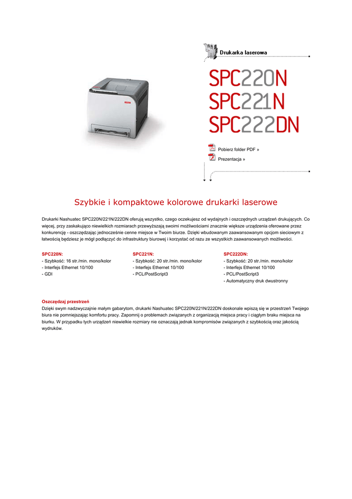 Pobierz folder PDF » Prezentacja » Szybkie i kompaktowe kolorowe drukarki laserowe Drukarki Nashuatec SPC220N/221N/222DN oferują wszystko, czego oczekujesz od wydajnych i oszczędnych urządzeń drukujących. Co więcej, przy zaskakująco niewielkich rozmiarach przewyższają swoimi możliwościami znacznie większe urządzenia oferowane przez konkurencję - oszczędzając jednocześnie cenne miejsce w Twoim biurze. Dzięki wbudowanym zaawansowanym opcjom sieciowym z łatwością będziesz je mógł podłączyć do infrastruktury biurowej i korzystać od razu ze wszystkich zaawansowanych możliwości. SPC220N: SPC221N: SPC222DN: - Szybkość: 16 str./min. mono/kolor - Interfejs Ethernet 10/100 - Szybkość: 20 str./min. mono/kolor - Interfejs Ethernet 10/100 - Szybkość: 20 str./min. mono/kolor - Interfejs Ethernet 10/100 - GDI - PCL/PostScript3 - PCL/PostScript3 - Automatyczny druk dwustronny Oszczędzaj przestrzeń Dzięki swym nadzwyczajnie małym gabarytom, drukarki Nashuatec SPC220N/221N/222DN doskonale wpiszą się w przestrzeń Twojego biura nie pomniejszając komfortu pracy. Zapomnij o problemach związanych z organizacją miejsca pracy i ciągłym braku miejsca na biurku. W przypadku tych urządzeń niewielkie rozmiary nie oznaczają jednak kompromisów związanych z szybkością oraz jakością wydruków. Używaj wielu typów nośników Pomimo swych niewielkich gabarytów nowe drukarki Nashuatec obsługują zaskakująco wiele typów nośników, a dzięki temu praca w biurze staje się bardziej elastyczna. Nie ma już bowiem konieczności korzystania z wielu wyspecjalizowanych urządzeń, wykonując pracę wyłącznie na jednym, znajdującym się w pobliżu miejsca pracy. Urządzenia obsługują materiały transparentne, etykiety, papier pochodzący z powtórnego przetworzenia, a również papiery grube oraz koperty. Co więcej, modele SPC221N oraz SPC222DN wyposażyć można w dodatkową kasetę na papier o pojemności 500 arkuszy, która skutecznie ograniczy konieczność częstego dodawania papieru do urządzenia. Oszczędzaj czas Z nowymi drukarkami Nashuatec możesz zapomnieć o długim oczekiwaniu na kolorowe wydruki. Pierwsza strona - czy kolorowa, czy też monochromatyczna - pojawia się tacy odbiorczej już po 14 sekundach, a szybkość drukowania wynosi 16 (SPC220N) lub 20 stron zarówno w czerni i bieli, jak i pełnym kolorze. Co więcej, drukarka 222DN wyposażona jest w moduł automatycznego drukowania dwustronnego. Urządzenia zużywają niewiele energii w trybie uśpienia i bardzo szybko nagrzewają się przechodząc w tryb pełnej gotowości. Korzystaj z doskonałej jakości Niewielkie gabaryty i wysoka wydajność to nie wszystko, co oferują drukarki Nashuatec. To również gwarancja doskonałej jakości wydruków, prawidłowego nasycenia kolorów i wiernego oddania najdrobniejszych szczegółów. Drukarki dysponują rozdzielczością 2400 x 600dpi co gwarantuje, że Twoje dokumenty będą wyglądały w pełni profesjonalnie. Mechanizm drukujący z pasem pośrednim przenoszenia obrazu gwarantuje doskonałą rejestrację kolorów i stabilność wydruków. Możesz być pewien, że każdy z Twoich wydruków będzie tak samo wysokiej jakości. Łatwa obsługa, doskonała ergonomia Drukarki Nashuatec SPC220N/221N/222DN należą do wyjątkowo łatwych w obsłudze. Wszystkie ważne komunikaty przekazywane są za pomocą podświetlanych piktogramów na panelu drukarki. Wymiana materiałów eksploatacyjnych w postaci zintegrowanych kartridży nie sprawia problemów nawet mniej doświadczonym użytkownikom, a cała obsługa drukarki odbywa się od frontu urządzenia. Dodatkowe oprogramowanie instalowane na komputerach, z których wykonywane są wydruki, monitoruje pracę drukarek i informuje o wszystkich zdarzeniach bez konieczności podchodzenia do samych urządzeń. Trwałość i pewność użytkowania Urządzenia drukujące Nashuatec zbudowane są w oparciu o lata doświadczeń związanych z konstruowaniem wydajnych kopiarek biurowych i urządzeń wielofunkcyjnych. To gwarantuje, że drukarki Nashuatec będą służyły w Twoim biurze prze długi okres czasu zapewniając pewność działania i stałą, najwyższą jakość drukowanych prac. Urządzenia Nashuatec są objęte godnym zaufania programem serwisowym świadczonym przez sieć profesjonalnych punktów. Minimalne rozmiary, maksymalna wydajność Technologia laserowa, 4 bębny ustawione tandemowo, tonery jednoskładnikowe Szybkość druku SPC220N: 16 str./min. mono/kolor SPC221N/222DN: 20 str./min. mono/kolor Czas nagrzewania mniej niż 51 sekund Czas uzyskania pierwszej strony mniej niż 14 sekund Wymiary 400 x 450 x 320mm Zasilanie 220 - 240V, 50/60Hz Zużycie energii maksymalnie: 1,3kW tryb oszczędzania energii: mniej niż 15W Specyfikacja kontrolera Procesor SPC220N: 192MHz SPC221N/222DN: 300MHz Języki druku SPC220N: GDI SPC221N/222DN: PCL5c, PCL6, PostScript3 Rozdzielczość maksymalnie 2400x600dpi Pamięć SPC220N: 64MB SPC221N/222DN: 128MB, maksymalnie 640MB Sterowniki PCL5c/PCL6: Windows 2000/XP/Server 2003/Vista PostScript3: Windows 2000/XP/Server 2003/Vista, Macintosh OS X v.10.2.8 - 10.4 Czcionki PCL/PostScript3: 80 czcionek PostScript3: 136 czcionek Adobe typ 1 Interfejsy Protokoły sieciowe TCP/IP, AppleTalk (SPC221N/SPC222DN), IPX/SPX (SPC221N/SPC222DN) Obsługiwane systemy sieciowe Windows 2000/XP/Server 2003/Vista, Macintosh OS X 10.2.8 - 10.4, Novell NetWare 4.x lub późniejszy (SPC221N/SPC222DN) Interfejsy Ethernet 10/100, USB 2.0, PictBridge (SPC222DN) Nośniki Pojemność podajników papieru Standardowo: 250 arkuszy w kasecie, 1 arkusz w podajniku ręcznym Maksymalnie: SPC220N - 251 arkuszy, SPC221N/222DN - 751 arkuszy Pojemność tacy odbiorczej 150 arkuszy Format papieru A4 - A6 Gramatura papieru Kaseta 1 oraz podajnik ręczny: 60 - 160 g/m2 Dodatkowa kaseta (SPC221N/222DN): 60 - 105 g/m2 Typy obsługiwanych nośników Papier zwykły, papier gruby, papier cienki, papier powtórnie pr