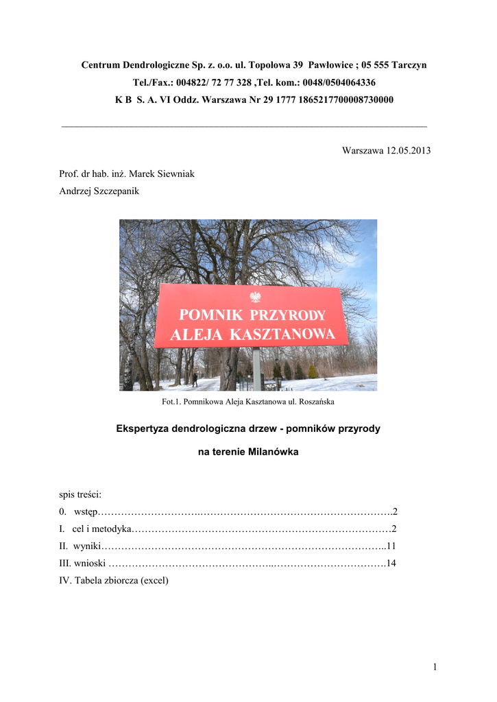 Centrum Dendrologiczne Sp. z. o.o. ul. Topolowa 39 Pawłowice ; 05 555 Tarczyn Tel./Fax.: 004822/ 72 77 328 ,Tel. kom.: 0048/0504064336 K B S. A. VI Oddz. Warszawa Nr 29 1777 1865217700008730000 _________________________________________________________________________ Warszawa 12.05.2013 Prof. dr hab. inż. Marek Siewniak Andrzej Szczepanik Fot.1. Pomnikowa Aleja Kasztanowa ul. Roszańska Ekspertyza dendrologiczna drzew - pomników przyrody na terenie Milanówka spis treści: 0. wstęp………………………….………………………………………………….2 I. cel i metodyka……………………………………………………………………2 II. wyniki…………………………………………………………………………..11 III. wnioski …………………………………………..…………………………….14 IV. Tabela zbiorcza (excel) 1 0. WSTĘP Praca została wykonana na podstawie umowy: nr 272/76/OŚZ/13 zawartej pomiędzy Miastem Milanówek, a Centrum Dendrologicznym Sp. z o.o. w dn. 1.03.2013 roku. Prace terenowe, pomiary i fotografie wykonane zostały w okresie kwiecień-maj 2013. I. CEL I METODYKA Zieleń, w tym lasy, ogrody, aleje i drzewa pomnikowe, dla Milanówka jako miastalasu, czy miasta – ogrodu są szczególną wartością, stanowią o charakterze i atmosferze miasta. Drzewa - pomniki przyrody to specjalna grupa i kategoria drzew stanowiących najwyższą wartość przyrodniczo-kulturową. Są to często drzewa najstarsze, o wyjątkowym znaczeniu historyczno-kulturowym. Wpis do rejestru pomników przyrody dokonywany dawniej przez wojewódzkiego konserwatora przyrody, a później także przez władze gminy następował w dużej mierze w sposób uznaniowy. W Milanówku większość drzew pomnikowych została wpisana do rejestru jeszcze przez WKP. Drzewa pomniki przyrody w Milanówku to w większości przypadków stare, imponujące dęby pochodzenia puszczańskiego, reszta to głównie drzewa alejowe wysadzane po założeniu miasta i wytyczeniu ulic. Drzewa pomnikowe mają tutaj – w mieście-ogrodzie - korzystną oprawę w postaci dorastającego drzewostanu. Ta sytuacja wywołuje pewne, specyficzne problemy i kolizje. Wiele drzew pomnikowych rosnąc na posesjach stwarza kolizje z podstawową funkcją działki, kolizja często skutkuje pogorszeniem warunków, pomnika, deformacjami lub uszkodzeniami. Drugą charakterystyczną grupą są drzewa rosnące wzdłuż ulic i tworzących pomnikowe aleje. Drzewa pomnikowych alei rozwijają się w trudnych warunkach ulicznych, a więc braku przestrzeni i światła, pogorszonych warunkach glebowych. Drzewa pomnikowe są z natury rzeczy w bardzo różnym stanie: dobrym, złym i bardzo złym. Z mocy prawa każde z nich jest objęte szczególną ochroną. Niestety narażone są one na różnorodne uszkodzenia i uciążliwości miejskie. Wielokrotnie popełnianym grzechem przy opiece nad nimi jest często zaniedbanie. Głównymi, a czasami jedynymi pracami wykonywanymi przy tych drzewach, w ostatnich kilkudziesięciu latach dość intensywnie, były zabiegi tzw. chirurgii drzew. Najważniejsze z nich czyli tzw. czyszczenie i impregnowanie ubytków mogły jedynie pogorszyć stan drzew i przyspieszyć proces deprecjacji drewna ich pni i tym samym stan statyczny drzew. Podobna uwaga dotyczy tzw. wzmacniania koron, zwłaszcza w odniesieniu do zastosowania wiązań z przewiercaniem pni i 2 konarów. Większość drzew pomnikowych została zdeformowana poprzez podkrzesywanie pni i podnoszenia środka naporu wiatru. Jednocześnie w warunkach miejskich zwiększone jest potencjalne zagrożenie otoczenia przez odłamujące się gałęzie, konary, łamiące się pnie lub wykroty całych drzew. Naczelnym nakazem zarządzania drzewami pomnikowymi, obok ich samego utrzymania i pielęgnacji, jest ograniczenie do racjonalnego minimum poziomu ryzyka i zagrożenia dla ludzi i ich mienia. Z tego powodu w ostatnich latach dla kilkunastu pomników przyrody wykonane zostały dokładne ekspertyzy dendrologiczne. Celem podstawowym ekspertyzy jest rozpoznanie stanu drzew zarówno pod względem zdrowotnym jak i statycznym jest pierwszym krokiem do zarządzania tym zasobem czyli stworzenie racjonalnych podstaw do gospodarki tym zasobem – kontroli, sformułowaniem programu pielęgnacji z podaniem koniecznych zabiegów w tym też zabezpieczenia ich najbliższego otoczenia przed potencjalnym zagrożeniem. Jednym z pośród najważniejszych celów pracy było rozpoznanie i ocena stanu statycznego drzew dla odpowiedzialnej kontroli nad powierzonym zasobem. Pomiary dendrometryczne w terenie wykonane zostały przy pomocy: klupy 130 cm, taśmy mierniczej, dalmierza/ wysokościomierza laserowego True Pulse B. Odczyn gleby został pomierzony przy pomocy pH Soil Tester firmy Takemura Electric Works Ltd. Cechy inwentaryzowane Ocena każdego drzewa wykonana została indywidualnie według opracowanej na potrzeby zlecenia metody obejmującej 102 cechy ujęte w odpowiadających im kolumnach o numerach: DANE PODSTAWOWE 2.Numeracja pomników przyrody 3.Numeracja drzew (indywidualna dla każdego drzewa w obrębie danego pomnika) 4. adres 5. tabliczka (jest/brak/zniszczona) 6. Nazwa łacińska (określona dla każdego drzewa, zgodnie z obecnymi zasadami taksonomii i nomenklatury) 7. Nazwa polska WYMIARY 8. Wysokość drzewa (mierzona w metrach) 9. Średnica korony drzewa (mierzona w metrach) 3 10. Obwód pnia drzewa (mierzona w centymetrach na wysokości 1,3 m) 11. Pierśnica 1 – średnica pnia N- S (mierzona w centymetrach na wysokości 1 m) 12. Pierśnica 2 – średnica pnia W-E (mierzona w centymetrach na wysokości 1 m) 13. Grubość kory (mierzona w centymetrach na wysokości 1 m) STAN POMNIKA KORONA 14. Sylwetka korony - sprowadzona do podstawowego kształtu geometrycznego w sposób przyjęty w ocenie statyki drzew1, jednocześnie decydująca o walorach estetycznych drzewa. Pięć typów: 1. korona resztkowa, zanikaj