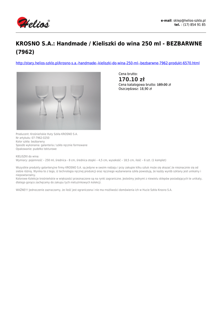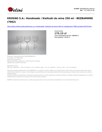 e-mail: [email protected] tel. : (17) 854 91 85 KROSNO S.A.: Handmade / Kieliszki do wina 250 ml - BEZBARWNE (7962) http://stary.helios-szklo.pl/krosno-s.a.-handmade--kieliszki-do-wina-250-ml--bezbarwne-7962-produkt-6570.html Cena brutto: 170.10 zł Cena katalogowa brutto: 189.00 zł Oszczędzasz: 18,90 zł Producent: Krośnieńskie Huty Szkła KROSNO S.A. Nr artykułu: 07-7962-0250 Kolor szkła: bezbarwny Sposób wykonania: galanteria / szkło ręcznie formowane Opakowanie: pudełko tekturowe KIELISZKI do wina: Wymiary: pojemność – 250 ml, średnica - 8 cm, średnica stopki – 4,5 cm, wysokość – 18,5 cm, ilość – 6 szt. (1 komplet) Wszystkie produkty galanteryjne firmy KROSNO S.A. są jedyne w swoim rodzaju i przy zakupie kilku sztuk może się okazać że nieznacznie się od siebie różnią. Wynika to z tego, iż technologia ręcznej produkcji oraz ręcznego wybarwiania szkła powodują, że każdy wyrób szklany jest unikalny i niepowtarzalny. Kolorowe Kolekcje krośnieńskie w większości przeznaczone są na rynki zagraniczne. Jesteśmy jednymi z niewielu sklepów posiadających te unikaty, dlatego gorąco zachęcamy do zakupu tych nietuzinkowych kolekcji. WAŻNE!!! Jednoczenie zaznaczamy, że ilość jest ograniczona i nie ma możliwości domówienia ich w Hucie Szkła Krosno S.A.