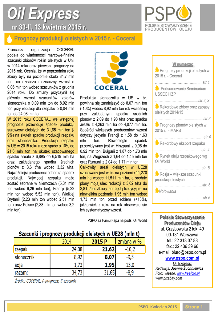 Oil Express nr 33-II, 13 kwietnia 2015 r. Prognozy produkcji oleistych w 2015 r. - Coceral Francuska organizacja COCERAL podała do wiadomości marcowe-finalne szacunki zbiorów roślin oleistych w Unii w 2014 roku oraz pierwsze prognozy na 2015 rok. Ocenia, że w poprzednim roku zbiory były na poziomie około 34,7 mln ton, co oznacza nieznaczny wzrost o 0,06 mln ton wobec szacunków z grudnia 2014 roku. Do zmiany przyczynił się głównie wzrost szacunków zbiorów słonecznika o 0,09 mln ton do 8,92 mln ton przy redukcji dla rzepaku o 0,04 mln ton do 24,08 mln ton. W 2015 roku COCERAL we wstępnej prognozie przewiduje spadek produkcji surowców oleistych do 31,65 mln ton (9%) na skutek spadku produkcji rzepaku oraz słonecznika. Produkcja rzepaku w UE w 2015 roku może spaść o 10% do 21,6 mln ton na skutek szacowanego spadku areału z 6,895 do 6,519 mln ha oraz zakładanego spadku średnich plonów z 3,6 t/ha wobec 3,32 t/ha. Najważniejsi producenci odnotują spadek produkcji. Najwięcej rzepaku może zostać zebrane w Niemczech (5,31 mln ton wobec 6,26 mln ton), Francji (5,22 mln ton wobec 5,52 mln ton), Wielkiej Brytanii (2,23 mln ton wobec 2,51 mln ton) oraz Polsce (2,88 mln ton wobec 3,2 mln ton). Produkcja słonecznika w UE w br. powinna się zmniejszyć do 8,07 mln ton (-10%) wobec 8,92 mln ton rok wcześniej przy zakładanym spadku średnich plonów z 2,09 do 1,98 t/ha oraz spadku areału z 4,263 mln ha do 4,077 mln ha. Spośród większych producentów wzrost dotyczy jedynie Francji z 1,58 do 1,63 mln ton. Równolegle spadek przewidywany jest w: Hiszpanii z 0,96 do 0,92 mln ton, Bułgarii z 1,87 do 1,73 mln ton, na Węgrzech z 1,64 do 1,45 mln ton oraz Rumunii z 2,04 do 1,71 mln ton. Całkowity areał oleistych w UE28 szacowany jest w br. na poziomie 11,270 mln ha wobec 11,511 mln ha, a średnie plony moją ulec redukcji z 3,02 t/ha do 2,81 t/ha. Zbiory soi będą tradycyjnie na niewielkim poziomie 1,95 mln ton wobec 1,73 mln ton przed rokiem (+13%), jakkolwiek z roku na rok obserwuje się ich systematyczny wzrost. PSPO za Famu Fapa na pods. Oil World W numerze: Prognozy produkcji oleistych w 2015 r. - Coceral …………..……………….........str.1 Podsumowanie Seminarium USSEC i IZP ………..………….…...........str.2, 3 Rekordowe zbiory oraz zapasy oleistych 2014/15 ………..…………….................str.3 Prognozy plonów oleistych w 2015 r. - MARS …………… ……..………….….str.4 Rekordowy eksport rzepaku ……..…………….……….......str. 4 Rynek oleju rzepakowego wg Oil World …………………...……………str. 5 Rosja – większe szacunki produkcji oleistych …………………………………str. 5 Notowania ………..……...………………...str.6 Polskie Stowarzyszenie Producentów Oleju ul. Grzybowska 2 lok. 49 00-131 Warszawa tel.: 22 313 07 88 fax.: 22 436 39 66 e-mail: [email protected] www.pspo.com.pl Oil Express: Redakcja: Joanna Żuchniewicz Foto: własne, www.freefoto.pl, www.pixabay.com PSPO Kwiecień 2015 Strona 1 Oil Express nr 33-II, 13 kwietnia 2015 P Podsumowanie Seminarium USSEC i IZP W dniu 31 marca 2015 roku w Warszawie odbyło się seminarium poświęcone sektorowi trzody i pasz wysokobiałkowych w UE – w ujęciu konkurencyjności, rynków, cen, jakości oraz polityki handlowej. Spotkanie skierowane było głównie do handlowców zbożowo-paszowych, kierowników zaopatrzenia surowcowego, żywieniowców, technologów firm paszowych i produkcji zwierzęcej. Organizatorami spotkania była Amerykańska Rada Eksportu Soi (USSEC), wspierana przez Izbę Zbożowo-Paszową. Seminarium otworzył i poprowadził Dyrektor Techniczny USSEC Jerzy Kosieradzki. Na spotkaniu obecny był, a także przywitał gości Radca ds. Rolnych Ambasady USA w Polsce - Russell J. Nicely. Organizatorzy zaprosili do wygłoszenia swoich referatów czterech prelegentów. Jako pierwszy wystąpił Marek Przeździak, Członek Zarządu Polskiej Federacji Gospodarki Żywnościowej, który omówił temat „Biotechnologia w sektorze rolno – spożywczym: Fakty przeciwko mitom oraz sytuacja w UE i Polsce”. Przedstawił on jak wygląda sytuacja uprawy roślin genetycznie modyfikowanych na świecie oraz porównał ją do sytuacji w Polsce, ze szczególnym zwróceniem uwagi na obowiązujące w tym temacie przepisy prawa oraz stanowisko naszego rządu. W swoim wystąpieniu podkreślił, że Polska importuje 1.850 tys. ton soi, z czego tylko 40 tys. ton nie jest genetycznie modyfikowana. Obalił też mit jakoby istniał na świecie kraj całkowicie wolny od GMO, gdyż jak stwierdził chociażby większość ubrań dostępnych w sklepie produkowana jest z bawełny genetycznie modyfikowanej. Podkreślił konieczność zmiany podejścia na szczeblu europejskim, odzwierciedlonej odpowiednimi przepisami prawa, po to aby nasi rolnicy mogli podejmować świadome decyzje o tym jakie produkty chcą uprawiać. Następnie swój referat wygłosiła pani Lola Herrera, reprezentująca odział USSEC w Hiszpanii. Wystąpienie dotyczyło kontraktów terminowych i rynku transakcji gotówkowych na wysokobiałkowe surowce paszowe. Przedstawiła zebranym założenie, że cena śruty sojowej dyktuje ceny pozostałych surowców białkowych. Dokładnie opisała czynniki, które są składowymi ceny ostatecznej tego surowca. Podkreśliła znaczenie obserwacji i analizy danych publikowanych przez Amerykanów w postaci różnych raportów. Przedstawiła również zaobserwowane trendy popytu i podaży na rynku surowców białkowych; jako najistotniejszy podała obserwowany od lat wzrost światowej produkcji surowców roślinnych. Podkreśliła znaczenie ciągłej analizy wykresów przedstawiających transakcje długoterminowe i odpowiednie reagowanie na ich zachowanie przez graczy rynkowych. Prelegentka dokonała również porównania cen produktów wysokobiałkowych w Polsce i Hiszpanii i wyjaśniła skąd biorą się rozbieżności w ich cenach. J