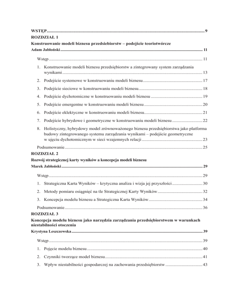 WSTĘP.............................................................................................................................................. 9 ROZDZIAŁ 1 Konstruowanie modeli biznesu przedsiebiorstw – podejście teoriotwórcze Adam Jabłoński............................................................................................................................................. 11 Wstęp.......................................................................................................................................... 11 1. Konstruowanie modeli biznesu przedsiębiorstw a zintegrowany system zarządzania wynikami.............................................................................................................................. 13 2. Podejście systemowe w konstruowaniu modeli biznesu...................................................... 17 3. Podejście sieciowe w konstruowaniu modeli biznesu.......................................................... 18 4. Podejście dychotomiczne w konstruowaniu modeli biznesu............................................... 19 5. Podejście emergentne w konstruowaniu modeli biznesu..................................................... 20 6. Podejście eklektyczne w konstruowaniu modeli biznesu..................................................... 21 7. Podejście hybrydowe i geometryczne w konstruowaniu modeli biznesu............................ 22 8. Holistyczny, hybrydowy model zrównoważonego biznesu przedsiębiorstwa jako platforma budowy zintegrowanego systemu zarządzania wynikami – podejście geometryczne w ujęciu dychotomicznym w sieci wzajemnych relacji....................................................... 23 Podsumowanie............................................................................................................................ 25 ROZDZIAŁ 2 Rozwój strategicznej karty wyników a koncepcja modeli biznesu Marek Jabłoński............................................................................................................................................ 29 Wstęp.......................................................................................................................................... 29 1. Strategiczna Karta Wyników – krytyczna analiza i wizja jej przyszłości............................ 30 2. Metody pomiaru osiągnięć na tle Strategicznej Karty Wyników......................................... 32 3. Koncepcja modelu biznesu a Strategiczna Karta Wyników................................................. 34 Podsumowanie............................................................................................................................ 36 ROZDZIAŁ 3 Koncepcja modelu biznesu jako narzędzia zarządzania przedsiębiorstwem w warunkach niestabilności otoczenia Krystyna Leszczewska.................................................................................................................................. 39 Wstęp.......................................................................................................................................... 39 1. Pojęcie modelu biznesu........................................................................................................ 40 2. Czynniki tworzące model biznesu........................................................................................ 41 3. Wpływ niestabilności gospodarczej na zachowania przedsiębiorstw.................................. 43 4. Zmiana modelu biznesowego jako sposób reagowania przedsiębiorstwa na niestabilność otoczenia............................................................................................................................... 44 Podsumowanie............................................................................................................................ 46 ROZDZIAŁ 4 Od serwisów aukcyjnych do profesjonalnych platform handlu internetowego – zmiana modelu e-biznesowego i kreowanie wartości na przykładzie Allegro.pl Nina Stępnicka............................................................................................................................................... 51 Wstęp.......................................................................................................................................... 51 1. Aukcje jako jeden z formatów sprzedaży – ujęcie historyczne tradycyjne i współczesne wirtualne............................................................................................................................... 51 2. Serwisy aukcji internetowych jako profesjonalne platformy handlu internetowego – analiza zmiany modelu e-biznesowego................................................................................ 53 3. Kreowanie wartości w serwisach e-commerce na przykładzie Allegro.pl........................... 56 Podsumowanie............................................................................................................................ 58 ROZDZIAŁ 5 Innowacyjne etniczne modele biznesu we współczesnej Unii Europejskiej Maciej Witkowski.......................................................................................................................................... 61 Wstęp.......................................................................................................................................... 61 1. Praktyki integrowania Romów............................................................................................. 62 2. Etniczny model biznesu a perspektywa polityki europejskiej.............................................. 64 Podsumowanie............................................................................................................................ 68 ROZDZIAŁ 6 The consumer as the creative artist – the role of user creativity in the process of the acceptance of design Urszula Świerczyńska-Kaczor..................................................