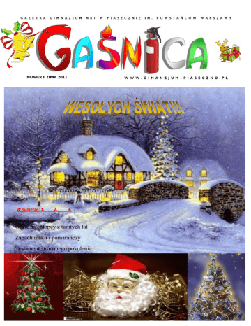 nie NUMER II ZIMA 2011 W numerze: 1. 2. 3. Gdzie są chłopcy z tamtych lat Zapach maku i pomarańczy Testament straconego pokolenia Wstępniak Spis treści: 2 - Wstępniak Za parę dni usiądziecie do wigilijnego stołu. Za wami pozostaną wszystkie szkolne kłopoty; niezliczone klasówki, czy nie za dobrze zdane egzaminy. Przed wami święta z całym ich urokiem i tajemnicą. Jedyne chyba święta, takie do kooca pełne nadziei i otuchy. Szkolnym Okiem: Gdzie są chłopcy z tamtych lat 3-5 Ludzie, którzy zmieniają świat 6-7 Fotoreportaż- Dzień Tolerancji 8-9 Zapach maku i pomarańczy 10 Bolączki przedświątecznej gorączki 11-12 Królową być 13-15 W moim kraju lat dziecięcych 16 Życzymy wam, abyście w tych dniach doświadczyli prawdziwej radości, jakie niesie Boże Narodzenie. Redakcja Komiks: O choince 17 Redakcja: Dział Historyczny: Testament straconego pokolenia 18-21 Redaktor naczelny: Hejna Mateusz 3g To co nas kręci: Z-ca: Urok na uroki 22-23 Historia: Karolina Michalik 2a Alchimowicz Jędrzej 2a Kubski Jakub 2a Filip Jarosz 3g DTP: Dodatek Językowy Filip Jarosz 3g Dodatek Językowy: Okładka: Mateusz Hejna3g Zdjęcia: Michalik Karolina 2a Filip Jarosz 3g The little match girl 24-25 15 January 2012 26 Weihnahten in Deutschland 27 News Flesh 28 Współautorzy Elżbieta Dudek 3g Kasia Budnitska 3g Ewelina Zdanowska3g Julia Zakrzewska 3i BasiaMoczydłowska 2h Piotr Zadura 2h Joanna Glinaka 1d - -1 Hanna Barańska 3d Weronika Lech 3d Jakub Sobala 3d Dzieo Patrona jest tradycją chyba każdej szkoły. Dzieo naszej szkoły jest już zwyczajem sześcioletnim, odkąd to przybrała ona nazwę Powstaoców Warszawy. Z czym kojarzy nam się owe święto? Potencjalnie, zapytany uczeo odpowiedziałby „Galowe stroje, smutny nastrój, godziny spędzane w szkole podczas słuchania ciągle takich samych przemówieo.” 16 listopada było inaczej. Dzieo ten zaskoczył nas pozytywnie pod wieloma względami. „W naszej szkole obchody Dnia Patrona były inne, ciekawe. Naprawdę się nie nudziłem.” – opowiada jeden z uczniów. Nasze spotkanie rozpoczęliśmy „lekcją historii”. Oglądanie filmu pt. „Pamiętnik z Powstania Warszawskiego”, którego głównym bohaterem był Miron Białoszewski, było dobrą propozycją, by przedstawid w nieco innej niż dotychczas konwencji dzieje Powstania. Tego dnia odbyło się również uroczyste otwarcie szkolnej izby pamięci. W obecności kombatantów, ówczesnej młodzieży walczącej w Powstaniu Warszawskim, nasz nauczyciel historii pan Dariusz Nowak, zaprezentował reprezentantom klas i zebranym nauczycielom nowo otwartą izbę. 1 Punktem kulminacyjnym naszego programu było spotkanie wszystkich klas na sali gimnastycznej. Wspaniale przygotowane przedstawienie pt. „Gdzie są chłopcy z tamtych lat” przez uczniów klas IIj, IIIj, Id pod kierownictwem P. Agaty Daniel, P. Marii Górzyoskiej oraz P. Elżbiety Bruszewskiej wzbudziło w nas bardzo pozytywne emocje. „Spodobał mi się przede wszystkim oryginalny scenariusz przedstawienia” – mówi jedna z uczennic. Koncentrowało się ono, nie jak dotychczas, na wspomnieniach walki, bohaterstwa, heroizmu powstaoców Warszawy, lecz na stworzeniu atmosfery owych dni, kiedy ci młodzi ludzie wchodzili w życie. Przywołaniu ich wizerunków w prostocie młodzieoczych marzeo i pragnieo. Pokazaniu, jak w to ich zwyczajne, pełne nadziei i oczekiwao życie brutalnie wkracza historia. Wskrzeszeniu tych obrazów towarzyszyła poezja i piosenka. Wielkie zainteresowanie wzbudził reportaż filmowy pt. „Powstaocze miłości”. W niektórych momentach rozbawił nas do łez, a w niektórych wzruszył, lecz pozwolił nam naprawdę zrozumied naszych rówieśników z tamtych latach. Oprócz tego, że historia wyznaczyła im szczególna misję, byli podobni do nas, marzyli, kochali i czuli potrzebę miłości. Tacy zwyczajni, niezwyczajni chłopcy i dziewczęta z tamtych lat. Bardziej bliscy, mniej posagowi. Uroczystym momentem było odczytanie wiersza napisanego specjalnie na tą okazję przez pana J. Duszę – kronikarza Piaseczna, a także przemowa jednego z kombatantów pana Eugeniusza Tyrajskiego. 2 Głos zabrała również P. Łucja Białobłocka, która złożyła podziękowania za to, iż nasza szkoła kontynuuje tradycję i nie zapomina o tych, dla których niepodległośd, była najwyższą wartością. Koocząc spotkanie wicedyrektor naszej szkoły, pani Alicja Stępieo, w swoim wzruszającym przemówieniu jeszcze raz przywołując pamięd o tych, którzy walczyli i którzy zginęli, oddała hołd Powstaocom Warszawy. W szczególności do naszych serc przemówiły słowa „Chcę zapewnid obecnych tu Powstaoców Warszawy, że z ogromną dumą, szacunkiem i wdzięcznością przeniesiemy w naszych sercach przez kolejne lata i pokolenia pamięd o tych, którzy 1 sierpnia 1944r. stanęli do nierównej walki o jutra wolnego nadzieją.”- powiedziała p. dyrektor. Miejmy nadzieję, że słowa te w naszym życiu nie pozostaną tylko figurą retoryczną. 3 Woluntariat jest jedną z form społecznego działania, w którym to jedni ludzie poświęcają czas innym, robiąc to bezinteresownie i nie oczekując gratyfikacji. Z woluntariatem jest u nas tak samo słabo, jak z każdym społecznym działaniem. Profesor Czapiński, znany socjolog- ocenia to zjawisko jako uboczny efekt naszego patologicznego indywidualizmu, nacechowanego podejrzliwością, korupcją, nepotyzmem, brakiem nieformalnych więzi, zamykaniem się we własnych małych światach. „ W Polsce grupy, z którymi identyfikujemy się są mniejsze(…) rodzina, dzieci, żona albo mąż, szwagier, dwóch czy trzech sprawdzonych przyjaciół. I koniec. Reszta to obcy, którym nie wolno ufać i którzy nie mają prawa oczekiwać od nas lojalności. Przekleństwem krajów o niskim kapitale społecznym jest błędne koło nieufności. Polak, który nie ufa nikomu poza rodziną, ma po temu powody. Bo ci, którym nie ufa, też mu nie uf