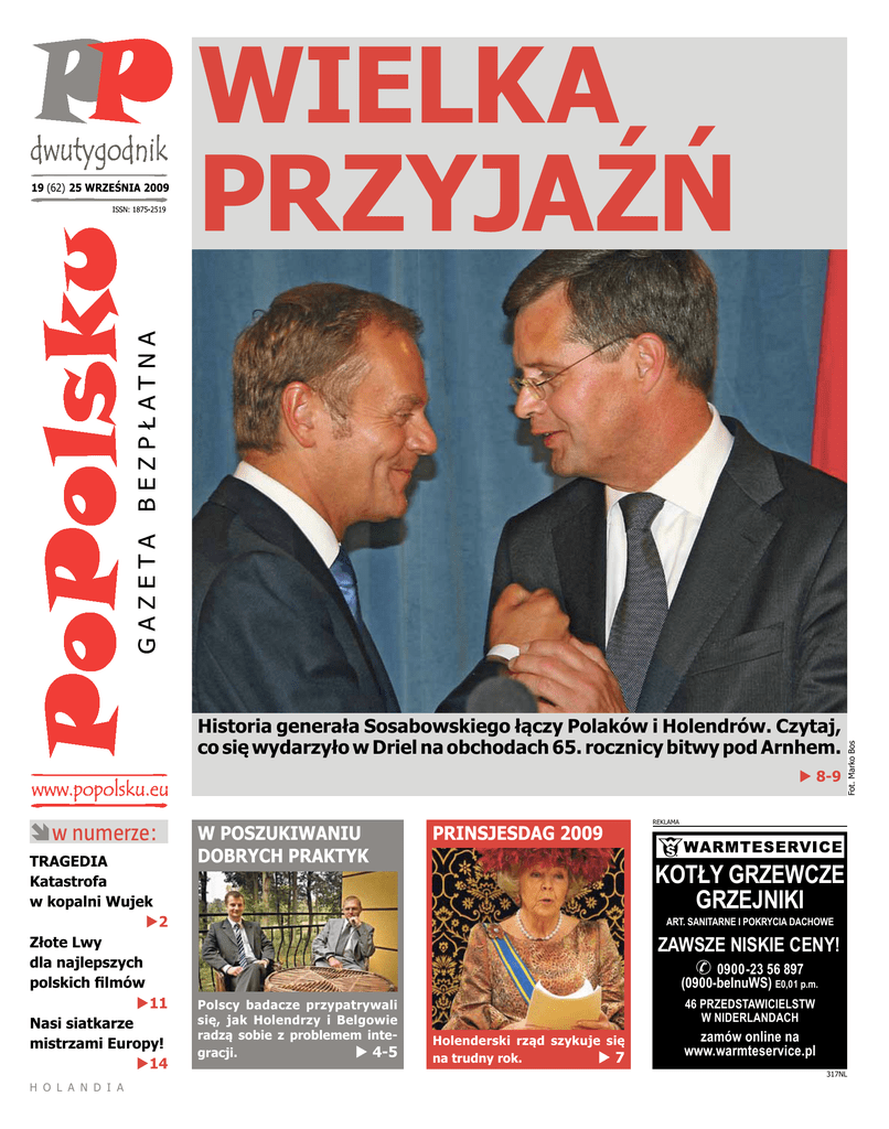 Historia generała Sosabowskiego łączy Polaków i Holendrów. Czytaj, co się wydarzyło w Driel na obchodach 65. rocznicy bitwy pod Arnhem. 8-9 w numerze: TRAGEDIA Katastrofa w kopalni Wujek 2 Złote Lwy dla najlepszych polskich filmów 11 Nasi siatkarze mistrzami Europy! 14 h o l a n d i a W poszukiwaniu dobrych praktyk Prinsjesdag 2009 Fot. Marko Bos 19 (62)25 września 2009 Wielka przyjaźń reklama KOTŁY GRZEWCZE GRZEJNIKI ART. SANITARNE I POKRYCIA DACHOWE ZAWSZE NISKIE CENY! 0900-23 56 897 (0900-belnuWS) E0,01 p.m. Polscy badacze przypatrywali się, jak Holendrzy i Belgowie radzą sobie z problemem integracji. 4-5 46 PRZEDSTAWICIELSTW W NIDERLANDACH Holenderski rząd szykuje się na trudny rok. 7 zamów online na www.warmteservice.pl 317nl 8 PoPolsku TEMAT 25 września 2009 Premierzy Polski i Holandii na obchodach 65. rocznicy bitwy pod Arnhem Podziękowania od Polonii Wielkie słowa podziękowania dla ambasadora Janusza Stańczyka za spotkanie z premierem Tuskiem, a przede wszystkim za mocne zaangażowanie się w rozwój stosunków polsko-niderlandzkich na poziomie obywateli. Nasz ambasador uprawia to, co Holendrzy nazywają „publiczną dyplomacją”, w której równie ważne jest to, co myślą i czują obywatele. Nasze gratulacje! W sobotę 19 września w Driel premier Polski Donald Tusk i premier Holandii Jan Peter Balkenende wzięli udział w obchodach 65. rocznicy bitwy pod Arnhem. Był to dzień przyjaźni obywateli Polski i Holandii. Skąd bierze się ta przyjaźń i dlaczego było to ważne wydarzenie – pisze Małgorzata BosKarczewska, redaktor naczelna portalu Polonia.NL Od 65 lat, w każdą trzecią sobotę września w Driel odbywają się uroczystości upamiętniające udział w operacji Market-Garden (17-26 IX 1944) żołnierzy 1. Samodzielnej Brygady Spadochronowej i ich dowódcy, generała Stanisława Sosabowskiego. Obchody w Driel – „Polen-herdenking” – są wspaniałym przykładem wieloletniej, prawdziwej przyjaźni Holendrów i Polaków. Wspólnota losu – Mieszkańców Driel i polskich weteranów łączy wspólnota losu – mówi Arno Baltussen, prezes Fundacji Driel – Polska. Driel nie zostało w 1944 r. wyzwolone, polską brygadę Brytyjczycy obarczyli winą za fiasko bitwy. Po wojnie żołnierze brygady nie mogli wrócić do siebie, nie mieli domu. Przyjeżdżali oni corocznie na obchody do Driel. Tu otrzymali to, czego Polska im dać nie mogła: ciepło i zrozumienie oraz pamięć. Matką brygady była mieszkanka Driel, Cora Baltussen. – Gdyby Cora nie przekazała tej historii, Polacy spod Arnhem Wielki dzień przyjaźni obu narodów Premier Holandii składa hołd żołnierzom 1 SBS. zostaliby zapomniani – mówi Geertjan Lassche, autor filmu „Zapomniani polscy bohaterowie spod Arnhem”. – To także bolało ludzi z Driel. Widzieli, że ich wyzwolicielom dzieje się wielka historyczna krzywda – mówi Baltussen. Dlaczego ich nie pamiętano? Historia brygady przez całe dziesiątki lat nie pasowała do żadnego mitu narodowego. „Komunistyczne władze Polski odebrały mu polskie obywatelstwo. (...) Sosabowski i jego żołnierze nie pasowali też do naszego, holenderskiego mitu, latami zdominowanego przez legendę bohaterskich Amerykanów i Brytyjczyków” – pisze Geert Mak we wstępie do polskiego wydania bestsellera „W Europie”. Wielkie emocje W tym roku Driel czekały wielkie emocje, swoją obec- Premier Jan Peter Balkenende: – Polacy podarowali nam to, co najcenniejsze – wolność. Premier Donald Tusk: – Legenda gen. Sosabowskiego jest ważna dla Polski i Holandii. Ambasador Janusz Stańczyk: – Przyjaźń obywateli łączy oba narody. ność zapowiedzieli premierzy Polski i Holandii, aby wspólnie z mieszkańcami uczcić pamięć generała Sosabowskiego i jego żołnierzy. Wielkie emocje najpierw przeżył polski ambasador. Na 24 godziny przed uroczystościa mi, w piątek po południu, premier Tusk przerwał swój pobyt w Holandii, aby na kilka godzin wrócić do kraju celem odwiedzenia miejsca katastrofy w kopalni na Śląsku. W nocy premier wrócił do Holandii, wiedział, że jest to ważna uroczystość nie tylko dla stosunków polskoniderlandzkich, ale także dla obywateli – weteranów i wielu Holendrów. Wysokie oczekiwania Na przyjazd premiera Tuska do Driel czekali także weterani z brygady gen. Sosabowskiego. – Obecność premiera Tuska na obchodach jest wyrazem uznania władz Polski dla Holandii i obywateli z Driel, którzy od lat kultywują pamięć naszej brygady i 1 SBS w bitwie pod Arnhem (17-26 IX 1944) W piątym dniu desantu w ramach operacji „Market Garden”, 21 września 1944 wa, podporządkowana brytyjskiej 1. Dywizji Powietrznej, wkroczyła do akcji. 1 SBS było utrzymanie przyczółka w Driel i udzielenie wsparcia broniącym s Przy wielkich stratach, 300 żołnierzom 1 SBS udało się przeprawić, wzmacn września marszałek Montgomery wycofuje wojska brytyjskie z Oosterbeek, kończy się klęską aliantów. Po fiasku operacji dowódca 1 SBS generał Sosabo o nieudolność i brak współpracy. W grudniu 1944 r. gen. Sosabowski zosta Bitwie pod Arnhem wzięło udział 1689 polskich żołnierzy, zginęło 97, rannych opiekują się grobami naszych towarzyszy broni. To Holandia w 2006 r. przywróciła chwałę generałowi i brygadzie – mówił w radiu holenderskim polski weteran (zob. „Rehabilitacja w Holandii”). – To również wspaniały dzień dla nas, żołnierzy – po raz pierwszy premier Polski będzie z nami na obchodach w Driel. – Dla mieszkańców Driel wizyta premiera Tuska jest ukoronowaniem ich wytrwałości – od 1946 roku corocznie goszczą oni w swoich domach żołnierzy 1 SBS – mówi Arno Baltussen, prezes Fundacji Driel – Polska, która od 1945 r. organizuje obchody w Driel. – Rozczarowanie mieszkańców było spore, kiedy w październiku 2004 r. prezydent RP Aleksander Kwaśniewski w czasie swojej wizyty w Holandii z okazji 60-lecia wyzwolenia Bredy nie odw