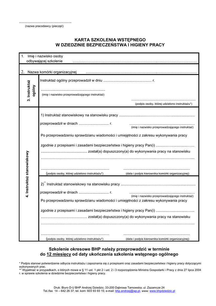 .................................................... (nazwa pracodawcy (pieczęć) KARTA SZKOLENIA WSTĘPNEGO W DZIEDZINIE BEZPIECZEŃSTWA I HIGIENY PRACY 1. Imię i nazwisko osoby odbywającej szkolenie …………………………………………………..……………………… 3. Instruktaż ogólny 2. Nazwa komórki organizacyjnej …………………………………………..……………………… Instruktaż ogólny przeprowadził w dniu ................................................ r. ................................................................ (imię i nazwisko przeprowadzającego instruktaż) ................................................................ (podpis osoby, której udzielono instruktażu*) 1) Instruktaż stanowiskowy na stanowisku pracy ..........................……………….…....................... przeprowadził w dniach .............................. r. …………...............................................… (imię i nazwisko przeprowadzającego instruktaż) Po przeprowadzeniu sprawdzianu wiadomości i umiejętności z zakresu wykonywania pracy 4. Instruktaż stanowiskowy zgodnie z przepisami i zasadami bezpieczeństwa i higieny pracy Pan(i) ............…................…... .............................................. został(a) dopuszczony(a) do wykonywania pracy na stanowisku …………………………………………………………………………………..…………………………... .................................................................... (podpis osoby, której udzielono instruktażu*) .................................................................. (data i podpis kierownika komórki organizacyjnej) ** 2) Instruktaż stanowiskowy na stanowisku pracy ..........................……………….…...................... przeprowadził w dniach .............................. r. …………...............................................… (imię i nazwisko przeprowadzającego instruktaż) Po przeprowadzeniu sprawdzianu wiadomości i umiejętności z zakresu wykonywania pracy zgodnie z przepisami i zasadami bezpieczeństwa i higieny pracy Pan(i) ............…................…... .............................................. został(a) dopuszczony(a) do wykonywania pracy na stanowisku …………………………………………………………………………………..…………………………... .................................................................... (podpis osoby, której udzielono instruktażu*) .................................................................. (data i podpis kierownika komórki organizacyjnej) Szkolenie okresowe BHP naleŜy przeprowadzić w terminie do 12 miesięcy od daty ukończenia szkolenia wstępnego ogólnego * Podpis stanowi potwierdzenie odbycia instruktażu i zapoznania się z przepisami oraz zasadami bezpieczeństwa i higieny pracy dotyczącymi wykonywanych prac. ** Wypełniać w przypadkach, o których mowa w § 11 ust. 1 pkt 2 i ust. 2 i 3 rozporządzenia Ministra Gospodarki i Pracy z dnia 27 lipca 2004 r. w sprawie szkolenia w dziedzinie bezpieczeństwa i higieny pracy. Druk: Biuro D-U BHP Andrzej Dziedzic; 33-200 Dąbrowa Tarnowska; ul. Zazamcze 24 Tel./fax 14 – 642 26 37; tel. kom: 603 93 93 15; e-mail: [email protected], www: www.bhpdziedzic.pl InstruktaŜ ogólny – cel i program Celem szkolenia jest zaznajomienie pracownika w szczególności z: a) podstawowymi przepisami bezpieczeństwa i higieny pracy zawartymi w Kodeksie pracy, w układach zbiorowych pracy lub w regulaminach pracy, b) przepisami oraz zasadami bezpieczeństwa i higieny pracy obowiązującymi w danym zakładzie pracy, c) zasadami udzielania pierwszej pomocy w razie wypadku. *) Lp. Temat szkolenia 1 2 **) Liczba godzin 3 1 Istota bezpieczeństwa i higieny pracy 2 Zakres obowiązków i uprawnień pracodawcy, pracowników oraz poszczególnych komórek organizacyjnych zakładu pracy i organizacji społecznych w zakresie bezpieczeństwa i higieny pracy 3 Odpowiedzialność za naruszenie przepisów lub zasad bezpieczeństwa i higieny pracy 4 Zasady poruszania się na terenie zakładu pracy 5 ZagroŜenia wypadkowe i zagroŜenia dla zdrowia występujące w zakładzie i podstawowe środki zapobiegawcze 6 Podstawowe zasady bezpieczeństwa i higieny pracy związane z obsługą urządzeń technicznych oraz transportem wewnątrzzakładowym 7 Zasady przydziału odzieŜy roboczej i obuwia roboczego oraz środków ochrony indywidualnej, w tym w odniesieniu do stanowiska pracy instruowanego 8 Porządek i czystość w miejscu pracy — ich wpływ na zdrowie i bezpieczeństwo pracownika 0,6 0,5 0,4 0,5 9 Profilaktyczna opieka lekarska — zasady jej sprawowania w odniesieniu do stanowiska instruowanego 10 Podstawowe zasady ochrony przeciwpoŜarowej oraz postępowania w razie poŜaru 11 Postępowanie w razie wypadku, w tym organizacja i zasady udzielania pierwszej pomocy 1 Razem: **) minimum 3 W godzinach lekcyjnych trwających 45 minut. InstruktaŜ stanowiskowy – cel i program Celem szkolenia jest uzyskanie przez pracownika: a) informacji o czynnikach środowiska pracy występujących na danym stanowisku pracy i w jego bezpośrednim otoczeniu oraz o ryzyku zawodowym związanym z wykonywaną pracą, b) wiedzy i umiejętności dotyczących sposobów ochrony przed zagroŜeniami wypadkowymi i zagroŜeniami dla zdrowia w warunkach normalnej pracy i w warunkach awaryjnych, c) wiedzy i praktycznych umiejętności z zakresu bezpiecznego wykonywania powierzonej pracy. Liczba godzin*) instruktaŜu osób wymienionych w § 11 ust. 1 rozporządzenia (nie dotyczy pracowników wymienionych w kolumnie 4) instruktaŜu pracowników administracyjnobiurowych naraŜonych na działanie czynników uciąŜliwych Lp. Temat szkolenia 1 Przygotowanie pracownika do wykonywania określonej pracy, w tym w szczególności: a) omówienie warunków pracy z uwzględnieniem: — elementów pom