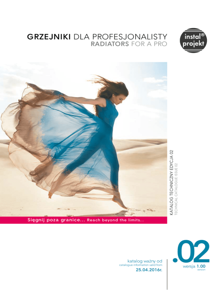 GRZEJNIKI DLA PROFESJONALISTY TECHNICAL CATALOGUE ISSUE 02 KATALOG TECHNICZNY EDYCJA 02 RADIATORS FOR A PRO Sięgnij poza granice... Reach beyond the limits... katalog ważny od catalogue information valid from 25.04.2016r. .02 wersja 1.00 version Posiadamy ponad 130 patentów i wzorów przemysłowych. Otrzymaliśmy ponad 60 nagród i wyróżnień. Mamy ponad 4,5 mln zadowolonych użytkowników. Traktujemy każdy problem jak wyzwanie. Czerpiemy inspiracje z życia. Kultywujemy wartości firmy rodzinnej. Działamy w oparciu o system ISO. DLACZEGO MY JAKOŚĆ TRADYCJA WZORNICTWO DOSTĘPNOŚĆ JESTEŚMY ZESPOŁEM KIM JESTEŚMY LIDEREM INNOWATOREM TWORZYMY CO ROBIMY DOSTARCZAMY Działamy z pasją. Wykorzystujemy wyłącznie surowce i półprodukty najwyższej jakości. Czerpiemy energię z pasji i tradycji. Inspiruje nas człowiek, natura, sztuka, technika, po prostu życie. Jesteśmy otwarci na sugestie i komentarze. Dzień po dniu uczymy się nowych rzeczy, nieustannie rozwijając nasze kompetencje. Tworzymy piękne i funkcjonalne produkty z myślą o Tobie. PRODUKUJEMY DORADCĄ We own over 130 patents and utility models. We have received over 60 prizes and awards. We have over 4.5 million satisfied users. We see challenge in each problem. We draw on life for inspiration. We cherish the values of a family-owned company. We operate in compliance with the ISO system. WHY US? QUALITY TRADITION DESIGN AVAILABILITY WE MAKE A TEAM WHO WE ARE A LEADER AN INNOVATOR WE CREATE WHAT WE DO WE DELIVER We are passion-driven. We use only top-quality raw materials and half-products. We take energy from passion and tradition. We are inspired by an individual, nature, art and technology … life simply. We are open for suggestions and opinions. Day by day we learn new things and constantly develop. We create beautiful and functional products for you. WE PRODUCE AN ADVISOR WITAJ! Na kolejnych stronach zamieściliśmy szeroką ofertę grzejników, suszarek elektrycznych, grzałek elektrycznych i akcesoriów. Na pewno łatwo znajdziesz tu produkt dopasowany do Twoich potrzeb. Zapraszamy! WELCOME The following pages will introduce you to our world of radiators, towel rails, electric elements and, above all, the world of technical specifications, technical drawings and advice. Look inside and you will find the product perfectly matching your needs. LIGHT najtańsze grzejniki c.o. cheapest central heating radiators BASIC ekonomiczne grzejniki c.o. budget central heating radiators TRENDY korzystne grzejniki c.o. value-for-money central heating radiators ELEGANTE DESIGN znakomite grzejniki c.o. DLACZEGO MY I 02 exquisite central heating radiators WHY US? O NAS ABOUT US NOWOŚCI W OFERCIE I 08 NEW ON OFFER PROFESJONALNY KOMPLET I 10 MODULUS elastyczne grzejniki c.o. flexible central heating radiators THE PROFESSIONAL SET PORADNIK ADVICE JAK KORZYSTAĆ Z KATALOGU? I 12 HOW TO USE THE CATALOGUE? OBJAŚNIENIA ZMIENIAMY SIĘ DLA CIEBIE Zmieniają się formy, potrzeby, kolory. My również się zmieniamy. Każdego dnia szukamy nowych, lepszych rozwiązań. Tworzymy nowe pomysły, kreujemy trendy. Sięgamy poza granice ograniczeń. WE CHANGE FOR YOU Forms, needs and colours are changing and so are we. Every day we look for new and better solutions. We introduce new ideas and set trends. We reach beyond limitations. GUIDE UWOLNIJ SWOJE EMOCJE I 142 FREE YOUR EMOTIONS KOLORY ELECTRO praktyczne suszarki elektryczne practical electric towel rails COLOURS DOBÓR, MONTAŻ I EKSPLOATACJA I 144 SELECTION, MOUNTING AND USE PORADNIK ADVICE GRZEJNIKI I 144 HEAT UP! funkcjonalne grzałki elektryczne functional electric heating elements HEATING RADIATORS GRZAŁKI ELEKTRYCZNE I 160 ELECTRIC HEATING ELEMENTS SUSZARKI ELEKTRYCZNE I 169 ELECTRIC TOWEL RAILS BOUTIQUE niezbędne akcesoria necessary accessories & fittings 26 I STANDARD 44 I RETTO 28 I OMEGA R 46 I MODO 66 I PULS 30 I CLEVO 48 I STICK 68 I JAZZ 32 I OMEGA X 50 I STICK LEVEL 70 I SISI 52 I SLIM ELECTRO 119 IOMEGA R ELECTRO 120 IRETTO ELECTRO 54 I NAMELESS 121 ISTICK ELECTRO 36 I ASTRO 56 I CODE 22 I BOLERO 18 38 I STANDARD 3 D 40 I SAHARA 24 62 I DRADA 42 80 I INVENTIO 64 58 I SHARK 60 I ZEBRA 74 I INDIVI NEW 76 I MAGIC 78 I MAGIC H 98 I AFRO NEW 102 I ROTI 104 I COVER 72 I INDIVI 86 I TUBUS 118 ISTANDARD 34 I FRAME 20 I AMBRA R 122 ISPINA ELECTRO 124 IMEDIO ELECTRO 126 IVIKING ELECTRO 128 IPRIMAVERA ELECTRO ZOBACZ JAKIE TO PROSTE Aby ułatwić nawigację podzieliliśmy ofertę na czytelne grupy produktów. Jesteśmy przekonani, iż w każdej z nich znajdziesz ciekawe i funkcjonalne produkty. SEE HOW EASY IT IS 130 I TOTU 84 116 2 132 138 I WIESZAKI I RELINGI 140 I INNE 134 132 I EGB 134 I ARMATURA 114 I SECRET 133 I HOT To make finding a product easier for you, we have divided the offer into clear product groups. You will find interesting and functional products in each one of them. NOWOŚCI W OFERCIE nowość / new NEW ON OFFER INFORMACJA! Czy wiesz, że zawory i głowice termostatyczne do grzejnika mogą być kolorowe? Dostępna armatura w kolorach. INFORMATION! Did you know that the valve and the thermostatic head to your radiator can come in different colours? The different-colour fittings are available. nowość / new LIGHT AMBRA R [AMBR] I 20 najtańsze grzejniki c.o. BOLERO [BOL] I 22 cheapest central heating radiators 8 nowość / new BASIC ekonomiczne grzejniki c.o. STANDARD [GŁ] I 26 OMEGA R [OMER] I 28 STANDARD 3D [STD] I 38 budget central heating radiators nowość / new nowość / new TRENDY korzystne grzejniki c.o. DRADA [DRA] I 62 TALK TO US znakomite grzejniki c.o. SISI [SIS] I 70 exquisite central heating radiators value-for-money central heating radiators WARTO ROZMAWIAĆ ELEGANTE DESIGN Masz pytanie? Chcesz wiedzieć więcej? Po prostu zadzwoń: 54 235 59 05. Have you got any questions? Give us a call at +48 54 235 59 05 ext. 43 or 51 szczegółowej oferty, porad, ciekawostek, informacji? Więcej? Szukasz Zapraszamy do nas :) zajrzyj na www.instalprojekt.c
