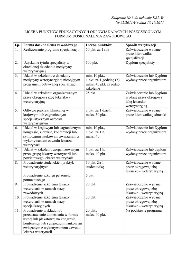 Załącznik Nr 3 do uchwały KRL-W Nr 62/2011/V z dnia 18.10.2011 LICZBA PUNKTÓW EDUKACYJNYCH ODPOWIADAJACYCH POSZCZEGÓLNYM FORMOM DOSKONALENIA ZAWODOWEGO l.p. Forma doskonalenia zawodowego 1. Realizowanie programu specjalizacji 2. 3. Uzyskanie tytułu specjalisty w określonej dziedzinie medycyny weterynaryjnej Udział w szkoleniu z dziedziny medycyny weterynaryjnej nieobjętym programem odbywanej specjalizacji 4. Udział w szkoleniu organizowanym przez okręgową izbę lekarsko weterynaryjną 5. Odbycie praktyki klinicznej w krajowym lub zagranicznym specjalistycznym ośrodku weterynaryjnym Udział w krajowym lub zagranicznym kongresie, zjeździe, konferencji lub sympozjum naukowym związanym z wykonywaniem zawodu lekarza weterynarii Udział w szkoleniu zorganizowanym przez grupę lekarzy weterynarii lub powiatowego lekarza weterynarii Prowadzenie studenckich praktyk weterynaryjnych. 6. 7. 8. Prowadzenie szkoleń personelu pomocniczego 9. Prowadzenie szkolenia lekarzy weterynarii w ramach staży zawodowych 10. Prowadzenie szkolenia lekarzy weterynarii w ramach staży specjalizacyjnych 11. Prowadzenie wykładu lub przedstawienie doniesienia w formie ustnej lub plakatowej na kongresie, konferencji lub sympozjum naukowym związanym z wykonywaniem zawodu lekarza weterynarii Liczba punktów 50 pkt. za 1 rok 100 pkt. min. 10 pkt., 1 pkt. za 1 godzinę (h), maks. 40 pkt. za jedno szkolenie 25 pkt. 3 pkt. za 1 dzień, maks. 50 pkt. Sposób weryfikacji Zaświadczenie wydane przez kierownika specjalizacji Dyplom specjalisty Zaświadczenie lub Dyplom wydany przez organizatora Zaświadczenie lub Dyplom wydane przez okręgową izbę lekarsko weterynaryjną Zaświadczenie wydane przez kierownika jednostki min. 10 pkt., 1 pkt. za 1 h, maks. 40 Zaświadczenie lub Dyplom wydany przez organizatora 1 pkt. za 1 h, maks. 40 pkt. Zaświadczenie lub dyplom wydany przez organizatora 10 pkt. Za 1 studenta/tkę Zaświadczenie wydane przez okręgową izbę lekarsko - weterynaryjną 5 pkt. 20 pkt. 30 pkt. 20 pkt., maks. 40 pkt. Zaświadczenie wydane przez okręgową izbę lekarsko - weterynaryjną Zaświadczenie wydane przez okręgową izbę lekarsko - weterynaryjną Na podstawie programu 12. Uzyskanie stopnia naukowego doktora, 200 pkt. doktora habilitowanego lub tytułu profesora w dziedzinie nauk weterynaryjnych 50 pkt. 13. Uzyskanie uprawnień konsultanta w określonej dziedzinie medycyny weterynaryjnej uznanych przez KRLW 14. Publikacja książki lub artykułu z zakresu medycyny weterynaryjnej w fachowym, recenzowanym czasopiśmie lub opracowanie edukacyjnego programu multimedialnego 15. Publikacja książki, artykułu lub opracowanie programu multimedialnego o charakterze popularno-naukowym z zakresu medycyny weterynaryjnej 16. Przetłumaczenie i opublikowanie artykułu, książki, rozdziału w książce lub edukacyjnego programu multimedialnego – z zakresu medycyny weterynaryjnej 17. Opublikowanie artykułu w fachowym czasopiśmie indeksowanym przez Filadelfijski Instytut Informacji Naukowej, Medline lub Index Copernicus 18. roczna prenumerata w ramach jednej praktyki czasopisma weterynaryjnego z listy Krajowej Izby Lekarsko – Weterynaryjnej 19. zakup książki o tematyce fachowej lub programu multimedialnego 20. Przynależność do stowarzyszenia lekarzy weterynarii lub innego stowarzyszenia naukowego z zakresu nauk przyrodniczych 21. Uzyskanie tytułu specjalisty na poziomie europejskim lub amerykańskim 22. Szkolenie pracowników Inspekcji na poziomie powiatowym, wojewódzkim lub centralnym 23. Udział w programie edukacyjnym opartym o zadania testowe akredytowanym przez Komisję KRLW 100 pkt. - książka, artykuł - 20 pkt., program multimedialny – 20 pkt. Dyplom Zaświadczenie odpowiedniego stowarzyszenia lekarzy weterynarii lub na wniosek innej organizacji Notka bibliograficzna 75 pkt. - książka, artykuł – 5 pkt., program multimedialny – 10 pkt. Notka bibliograficzna 15 – 75 pkt. Notka bibliograficzna 40 pkt. Notka bibliograficzna 5 pkt. za tytuł, maks. 10 pkt. za rok Potwierdzenie przez wydawcę, kierownika ZLZ lub dowód wpłaty 5 pkt. za tytuł dowód nabycia 5 pkt. za rok Zaświadczenie 100 pkt. Zaświadczenie lub Dyplom Min. 10 pkt., 1 pkt za 1 h Zaświadczenie lub Dyplom wydany przez organizatora 5 – 20 pkt. Zaświadczenie lub Dyplom