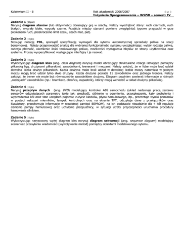 Kolokwium II - B Rok akademicki 2006/2007 -1 z 1Inżynieria Oprogramowania – WSZiB – semestr IV Zadanie 1 (10pkt) Narysuj diagram stanów (lub aktywności) obrazujący grę w szachy. Należy wyodrębnić stany: ruch czarnych, ruch białych, wygrały białe, wygrały czarne. Przejścia między stanami powinny uwzględniać typowe przypadki w grze (wykonano ruch, przekroczono limit czasu, szach mat, pat). Zadanie 2 (10pkt) Stosując notację PDL, sporządź specyfikację wymagań dla sytemu automatycznej sprzedaży paliwa na stacji benzynowej. Należy przeprowadzić analizę dla wybranej funkcjonalności systemu uwzględniając: wybór rodzaju paliwa, rodzaju płatność, określenie ilości tankowanego paliwa, możliwości wystąpienia błędów ze strony użytkownika oraz systemu. Proszę wyspecyfikować występujące interfejsy i je nazwać. Zadanie 3 (10pkt) Wykorzystując diagram klas (ang. class diagram) narysuj model obrazujący strukturalne relacje istniejące pomiędzy piłkarską ligą, drużynami piłkarskimi, zawodnikami, trenerami i meczami. Należy założyć, że w lidze może brać udział dowolna liczba drużyn piłkarskich. Każda drużyna może brać udział w dowolnej liczbie meczy natomiast w jednym meczu mogą brać udział tylko dwie drużyny. Każda drużyna posiada 11 zawodników oraz jednego trenera. Należy założyć, że trener nie może być równocześnie zawodnikiem drużyny. Diagram powinien zawierać informacje o różnych „rodzajach” zawodników (np.: bramkarz, obrońca, napastnik), którzy mogą wchodzić w skład drużyny piłkarskiej. Zadanie 4 (10pkt) Narysuj przepływ danych (ang. DFD) modelujący kontroler ABS samochodu (układ nadzoruje pracą zestawu sensorów odczytujących parametry takie jak: prędkość, ciśnienie w ogumieniu, przyspieszenie, kąty pochylenia i wyprzedzenia kół oraz stan urządzeń pojazdu: zużycie klocków, płynu hamulcowego, itp., prezentuje wyniki pomiarów w postaci wskazań mierników, lampek kontrolnych oraz na ekranie TFT, odczytuje dane z przełączników oraz klawiatury, przechowuje informacje w nieulotnej pamięci EEPROM), na ich podstawie niezależnie dla 4 kół reguluje ciśnienie pompy hamulcowej oraz uchylenie przepustnicy, w sytuacji utraty przyczepności uruchamia procedury hamowania silnikiem. Zadanie 5 (10pkt) Wykorzystując narysowany wyżej diagram klas narysuj diagram sekwencji (ang. sequence diagram) modelujący scenariusz przesyłania wiadomości (wywoływanie metod) pomiędzy obiektami modelowanego sytemu.