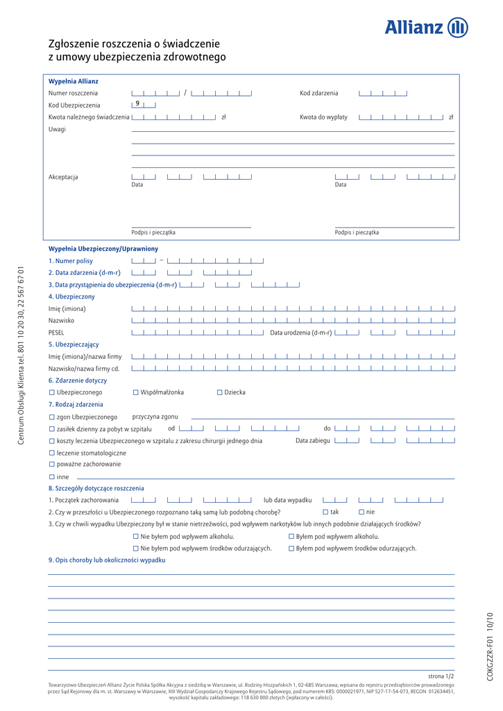 Zgłoszenie roszczenia o świadczenie z umowy ubezpieczenia zdrowotnego Wypełnia Allianz / Numer roszczenia Kod Ubezpieczenia Kod zdarzenia 9 zł Kwota należnego świadczenia zł Kwota do wypłaty Uwagi Akceptacja Data Data Podpis i pieczątka Podpis i pieczątka Wypełnia Ubezpieczony/Uprawniony – 2. Data zdarzenia (d-m-r) 3. Data przystąpienia do ubezpieczenia (d-m-r) 4. Ubezpieczony Imię (imiona) Nazwisko PESEL Data urodzenia (d-m-r) 5. Ubezpieczający Imię (imiona)/nazwa firmy Nazwisko/nazwa firmy cd. 6. Zdarzenie dotyczy Ubezpieczonego Współmałżonka Dziecka 7. Rodzaj zdarzenia zgon Ubezpieczonego przyczyna zgonu zasiłek dzienny za pobyt w szpitalu od do Data zabiegu koszty leczenia Ubezpieczonego w szpitalu z zakresu chirurgii jednego dnia leczenie stomatologiczne poważne zachorowanie inne 8. Szczegóły dotyczące roszczenia 1. Początek zachorowania lub data wypadku 2. Czy w przeszłości u Ubezpieczonego rozpoznano taką samą lub podobną chorobę? tak nie 3. Czy w chwili wypadku Ubezpieczony był w stanie nietrzeźwości, pod wpływem narkotyków lub innych podobnie działających środków? Nie byłem pod wpływem alkoholu. Byłem pod wpływem alkoholu. Nie byłem pod wpływem środków odurzających. Byłem pod wpływem środków odurzających. 9. Opis choroby lub okoliczności wypadku strona 1/2 Towarzystwo Ubezpieczeń Allianz Życie Polska Spółka Akcyjna z siedzibą w Warszawie, ul. Rodziny Hiszpańskich 1, 02-685 Warszawa, wpisana do rejestru przedsiębiorców prowadzonego przez Sąd Rejonowy dla m. st. Warszawy w Warszawie, XIII Wydział Gospodarczy Krajowego Rejestru Sądowego, pod numerem KRS: 0000021971, NIP 527-17-54-073, REGON 012634451, wysokość kapitału zakładowego: 118 630 000 złotych (wpłacony w całości). COKGZZR-F01 10/10 Centrum Obsługi Klienta tel. 801 10 20 30, 22 567 67 01 1. Numer polisy 10. Czy o zaistniałym zdarzeniu powiadomiono: Policję/Prokuraturę? tak nie (prosimy o wskazanie nazwy i adresu jednostki Policji/Prokuratury) Nazwa jednostki Ulica Nr domu Nr lokalu – Kod pocztowy Miejscowość Poczta Kraj Sygnatura sprawy Pogotowie ratunkowe? tak nie (prosimy o wskazanie nazwy i adresu jednostki pogotowia) Nazwa jednostki Ulica Nr domu Kod pocztowy Nr lokalu – Miejscowość Poczta Kraj 11. Dane osoby uprawnionej do odbioru świadczenia Imię (imiona) Nazwisko PESEL Adres korespondencyjny Ulica Centrum Obsługi Klienta tel. 801 10 20 30, 22 567 67 01 Nr domu Kod pocztowy Nr lokalu – Miejscowość Poczta Kraj Tel. stacjonarny Tel. kom. E-mail Faks 12. Forma wypłaty świadczenia przelew na rachunek bankowy Bank/Oddział Właściciel rachunku Nr rachunku Allianz rekomenduje powyższą formę wypłaty ze względu na szybki termin jej realizacji oraz bezpieczeństwo dostarczenia środków. Może dokonać wypłaty również w formie przekazu pocztowego: przekaz pocztowy na adres Ulica Nr domu Kod pocztowy Nr lokalu – Miejscowość Poczta Kraj 13. Oświadczenie Ubezpieczonego/ Uprawnionego Niniejszym potwierdzam, że wszelkie podane powyżej informacje są kompletne i zgodne z prawdą oraz wyrażam zgodę na ich przetwarzanie. W razie zatajenia lub podania nieprawdziwych informacji TU Allianz Życie Polska S.A. nie ponosi odpowiedzialności na warunkach przewidzianych przez przepisy kodeksu cywilnego. Data Podpis osoby uprawnionej do odbioru świadczenia 14. Postanowienia końcowe TU Allianz Życie Polska S.A. informuje, że: 1. Dane osobowe podane w niniejszym zgłoszeniu: a) są zbierane na zasadzie dobrowolności, b) będą służyć rozpatrywaniu roszczenia i podjęciu decyzji o wypłacie świadczenia, c) są objęte tajemnicą zawodową i nie będą udostępniane, z wyjątkiem wypadków obowiązkowego udzielania informacji, określonych w ustawie o działalności ubezpieczeniowej. 2. Zgodnie z ustawą o ochronie danych osobowych Ubezpieczony/Uprawniony ma prawo wglądu do swoich danych oraz prawo ich poprawiania. strona 2/2