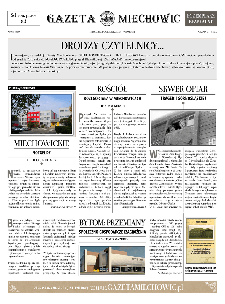 Schron: prace s. 2 GAZETA Nr 003, MMXV MIECHOWIC BYTOM, MIECHOWICE, wrzesień - październik EGZEMPLARZ BEZPŁATNY NAKŁAD: 5 TYS. EGZ. DRODZY CZYTELNICY… I nformujemy, że redakcja Gazety Miechowic oraz SKLEP KOMPUTEROWY z HALI TARGOWEJ wraz z serwisem telefonów GSM zostaną przeniesione od grudnia 2015 roku do NOWEGO PAWILONU przy ul. Bławatkowej. ZAPRASZAMY na nowe miejsce! Jednocześnie informujemy, że do grona redakcyjnego Gazety, zajmującego się działem „Historia Miechowic”, dołączył Jan Hodor - interesująca postać, pasjonat, znawca tematyki oraz historii Miechowic. W poprzednim numerze GM pod interesującym artykułem o herbach Miechowic, zabrakło nazwiska autora tekstu, a jest nim dr Adam Kubacz. Redakcja KOŚCIÓŁ SKWER OFIAR BOŻEGO CIAŁA W MIECHOWICACH TRAGEDII GÓRNOŚLĄSKIEJ PIĘKNIEJĄCE MIECHOWICE DR ADAM KUBACZ P MIECHOWICKIE NOTGELDY J. HODOR, A. KUBACZ N otgeldy to tymczasowa waluta wprowadzona na terenie Niemiec z początkiem I wojny światowej. Niemiecki termin na określenie tego typu pieniądza nie ma polskiego odpowiednika. Taka waluta nie posiadała wartości prawnego środka płatniczego. Dlatego płacić nią było można tylko na terenie gminy, dominium lub zakładu pracy, B ytom jest jednym z najstarszych miast Górnego Śląska, położonym 15 kilometrów od Katowic. Ważnym atutem lokalizacyjnym miasta jest zarówno centralne położenie w województwie śląskim jak i przebiegające przez Bytom główne szlaki komunikacyjne o charakterze regionalnym, krajowym i międzynarodowym. Jeszcze niedawno był on znaczącym ośrodkiem przemysłowym, gdzie w działających kopalniach i zakładach prze- który był jej emitentem. Huty i kopalnie najczęściej wybijały jedynie monety. Zdarzało się, że niektóre nominały pieniężne wydawały wspólnie: dominium i gmina. Niektóre z nich nigdy nie weszły do obiegu. Nie wszystkie też były akceptowane, gdyż nie miały prawnej gwarancji ze strony Państwa. kontynuacja, strona 9 mysłowych znajdowało pracę wielu ludzi. Obecnie jednak należy do miast, w których skupiło się najwięcej problemów gospodarczych i społecznych związanych między innymi z procesami restrukturyzacji przemysłowej oraz degradacji infrastruktury. oczątek XX wieku to okres gwałtownego rozwoju Miechowic. W poszukiwaniu pracy pojawiło się wielu przyjezdnych. Byli to zarówno imigranci z terenów pruskiego Śląska, jak i emigranci z zagranicy. Starali się znaleźć zatrudnienie w powstającej kopalni „Preussen”. Na ich potrzeby wybudowano osiedle. Należało także zatroszczyć się o sprawy duchowe nowo przybyłych. Dotychczasowa parafia św. Krzyża nie mogła zaspokoić potrzeb wszystkich wiernych. W początkach XX wieku była ona bardzo rozległa. Należały do niej: Karb, Bobrek i bytomska część Rokitnicy. Wzrost ludności spowodował, że proboszcz J. Kuboth dążył do powstania nowych kościołów. Pierwszy z nich powstał w Bobrku (1902-1905). Wprawdzie część parafian odpadła od parafii św. Krzyża, jednak szybki przyrost miesz- kańców Miechowic powodował konieczność postawienia nowej świątyni. Projekt jej powstania wysunięto w roku 1910. Ksiądz J. Kuboth starał się o wybudowanie neobarokowego kościoła. Najprawdopodobniej zwrócił się z prośbą o zaprojektowanie neostylowej świątyni do Johannesa Franziskusa Klompa, znanego architekta. Stworzył on wiele projektów świątyń katolickich na terenie Niemiec, w tym także i na Górnym Śląsku. Z lat 1910-12 spod ręki Klompa wyszło kilkadziesiąt szkiców rysunkowych przedstawiających przyszłą miechowicką świątynię. Autor zapewne nigdy nie był w Miechowicach i projektowany obiekt zaplanował w oparciu o wskazówki ks. Kubotha. Rysunki te powstały w Dortmundzie i Katowicach. kontynuacja, strona 6 BYTOM: PRZEMIANY SPOŁECZNO-GOSPODARCZE I ZAGROŻENIA DR WITOLD MAZUREK W życiu społeczno-gospodarczym Bytomia dominującą rolę odgrywał przemysł ciężki, a w latach siedemdziesiątych i osiemdziesiątych Bytom przeżywał okres największej prosperity. W tym okresie ZAPRASZAMY NA STRONĘ INTERNETOWĄ: W Miechowicach powstanie Skwer Ofiar Tragedii Górnośląskiej. Będzie się znajdował u zbiegu ulic Jana Frenzla i Jana Dzierżonia w starej części Miechowic. Na sesji Rady Miejskiej z 28 września bytomscy radni podjęli uchwałę w tej sprawie o nadaniu skwerowi imienia „Ofiar Tragedii Górnośląskiej”. W ten sposób władze Miasta Bytomia chcą upamiętnić tysiące niewinnych osób, które zostały wywiezione do ZSRR w celu niewolniczej pracy po zajęciu terenów Górnego Śląska. W 2015 roku mija zarówno 70. liczba ludności miasta znacznie przekraczała 200 tysięcy – według GUS w 1987 roku osiągnęła swój szczyt, czyli liczbę prawie 240 tysięcy. Mieszkańcy pracowali w zlokalizowanych tu 11 kopalniach i 2 hutach żelaza. W ostatnim okresie, w wyniku procesu restrukturyzacji górnictwa węgla kamiennego i hutnictwa, zamknięte zostały działające na terenie miasta kopalnie i huty – najwięksi lokalni pracodawcy. Dziś pozostała jedynie kopalnia Bobrek Centrum. kontynuacja, strona 8 www.GAZETAMIECHOWIC.pl GAZETA MIECHOWIC rocznica wyzwolenia Górnego Śląska przez Sowietów, jak również 70. rocznica deportacji Górnoślązaków do Związku Radzieckiego. Wydarzenia te miały wymiar tragiczny. Z pierwszym łączą się zbrodnie popełnione na mieszkańcach dzielnicy Miechowice, w tym na księdzu Janie Frenzlu, oraz na Ślązakach i Polakach pracujących w tutejszych kopalniach, branych omyłkowo za Niemców przez wkraczające wojska sowieckie, zaś z drugim dramat tysięcy śląskich rodzin spowodowany wywózką mężczyzn i kobiet w głąb ZSRR. KSIĄŻKA DO NABYCIA W SKLEPIE KOMPUTEROWYM NA HALI TARGOWEJ Str. 1 Nr 003, MMXV BYTOM, MIECHOWICE, wrzesień - październik ELEKTROWNIA MODERNIZACJA SCHRON: PRACE MIECHOWICE DO MODERNIZACJI PĘTLI AUTOBUSOWEJ PRZY FELIŃSKIEGO NA TERENIE GIMNAZJUM