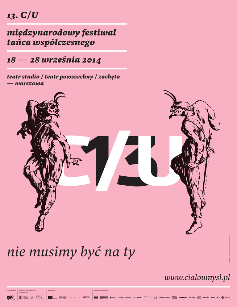 13. C/U międzynarodowy festiwal tańca współczesnego 18 — 28 września 2014 nie musimy być na ty projekt: beton. | postacie z cyklu akwafort Les Caprices Jacquesa Callot (1622) teatr studio / teatr powszechny / zachęta — warszawa www.cialoumysl.pl organizator festiwal finansowany ze środków partnerzy patronat medialny 13. C/U międzynarodowy festiwal tańca współczesnego 18 — 28 września 2014 teatr studio / teatr powszechny / zachęta — warszawa 18.09 19.09 Olivier Dubois | Francja Souls Alessandro Sciarroni | Włochy UNTITLED_I will be there when you die 20.09 FOLK? A ja się (nie) zgadzam! | Polska / Islandia 21.09 22.09 23.09 24.09 25.09 Heine Avdal, Yukiko Shinozaki | Norwegia / Japonia / Belgia Nothing’s for something Les Choses de Rien | Francja Mouvinsitu Felix Mathias Ott | Niemcy The Iliad Karol Tymiński | Polska Pussy Martin Schick, Damir Todorovic | Szwajcaria Holiday on stage 28.09TALDANS | Polska / Turcja 600 steps 27 + 28.09 Ana Borralho, João Galante | Portugalia Atlas Warszawa ceny biletów: spektakl Souls — 40-50 zł pozostałe spektakle — 20-30 zł organizator festiwal finansowany ze środków partnerzy wstęp wolny na wydarzenia w ramach projektu FOLK? A ja się (nie) zgadzam!, 600 steps oraz na wszystkie wydarzenia towarzyszące patronat medialny www.cialoumysl.pl