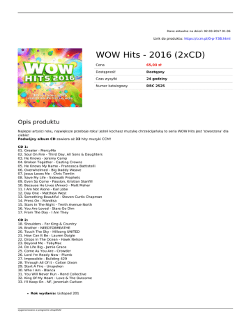 Dane aktualne na dzień: 02-03-2017 01:36 Link do produktu: https://ccm.pl/0-p-738.html WOW Hits - 2016 (2xCD) Cena 65,00 zł Dostępność Dostępny Czas wysyłki 24 godziny Numer katalogowy DRC 2525 Opis produktu Najlepsi artyści roku, największe przeboje roku! Jeżeli kochasz muzykę chrześcijańską to seria WOW Hits jest 'stworzona' dla ciebie! Podwójny album CD zawiera aż 33 hity muzyki CCM! CD 01. 02. 03. 04. 05. 06. 07. 08. 09. 10. 11. 12. 13. 14. 15. 16. 17. 1: Greater - MercyMe Soul On Fire - Third Day, All Sons & Daughters He Knows - Jeremy Camp Broken Together - Casting Crowns He Knows My Name - Francesca Battistelli Overwhelmed - Big Daddy Weave Jesus Loves Me - Chris Tomlin Save My Life - Sidewalk Prophets Even So Come - Passion, Kristian Stanfill Because He Lives (Amen) - Matt Maher I Am Not Alone - Kari Jobe Day One - Matthew West Something Beautiful - Steven Curtis Chapman Press On - Mandisa Stars In The Night - Tenth Avenue North You Are Loved - Stars Go Dim From The Day - I Am They CD 18. 19. 20. 21. 22. 23. 24. 25. 26. 27. 28. 29. 30. 31. 32. 33. 2: Shoulders - For King & Country Brother - NEEDTOBREATHE Touch The Sky - Hillsong UNITED How Can It Be - Lauren Daigle Drops In The Ocean - Hawk Nelson Beyond Me - TobyMac Do Life Big - Jamie Grace Come As You Are - Crowder Lord I'm Ready Now - Plumb Impossible - Building 429 Through All Of It - Colton Dixon Start A Fire - Unspoken Who I Am - Blanca You Will Never Run - Rend Collective King Of My Heart - Love & The Outcome I'll Keep On - NF, Jeremiah Carlson Rok wydania: Listopad 201 wygenerowano w programie shopGold Nośnik: 2xCD Styl muzyczny: Pop/Rock Linki 0 0 0 0 0 0 wygenerowano w programie shopGold Powered by TCPDF (www.tcpdf.org)