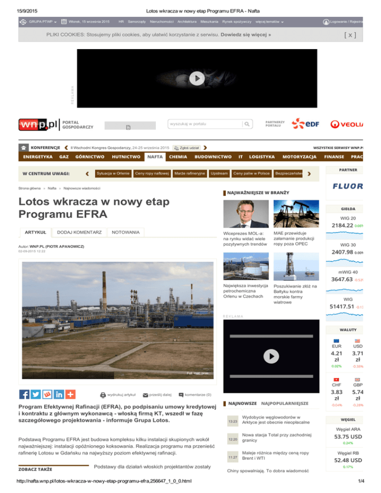 15/9/2015 Lotos wkracza w nowy etap Programu EFRA Nafta GRUPA PTWP Wtorek, 15 września 2015 HR Samorządy Nieruchomości Architektura Mieszkania Rynek spożywczy więcej tematów Logowanie / Rejestracja [ x ] PLIKI COOKIES: Stosujemy pliki cookies, aby ułatwić korzystanie z serwisu. Dowiedz się więcej » KONFERENCJE ENERGETYKA II Wschodni Kongres Gospodarczy, 2425 września 2015 GAZ GÓRNICTWO W CENTRUM UWAGI: PARTNERZY PORTALU wyszukaj w portalu HUTNICTWO Sytuacja w Orlenie NAFTA Zgłoś udział CHEMIA Ceny ropy naftowej WSZYSTKIE SERWISY WNP.PL BUDOWNICTWO Marże rafineryjne Upstream Strona główna » Nafta » Najnowsze wiadomości IT LOGISTYKA Ceny paliw w Polsce MOTORYZACJA FINANSE Bezpieczeństwo energetyczne PRACA PARTNER NAJWAŻNIEJSZE W BRANŻY Lotos wkracza w nowy etap Programu EFRA GIEŁDA WIG 20 2184.22 0.05% ARTYKUŁ DODAJ KOMENTARZ NOTOWANIA MAE przewiduje załamanie produkcji ropy poza OPEC Wiceprezes MOLa: na rynku widać wiele pozytywnych trendów Autor: WNP.PL (PIOTR APANOWICZ) 02092015 12:22 WIG 30 2407.98 0.00% mWIG 40 3647.63 -0.53% Największa inwestycja petrochemiczna Orlenu w Czechach Poszukiwanie złóż na Bałtyku kontra morskie farmy wiatrowe WIG 51417.51 -0.13% WALUTY EUR USD 4.21 zł 3.71 zł 0.02% -0.38% Fot. mat. pras. wydrukuj artykuł prześlij dalej komentarze (0) Program Efektywnej Rafinacji (EFRA), po podpisaniu umowy kredytowej i kontraktu z głównym wykonawcą włoską firmą KT, wszedł w fazę szczegółowego projektowania informuje Grupa Lotos. NAJNOWSZE NAJPOPULARNIEJSZE CHF GBP 3.83 zł 5.74 zł -0.04% -0.28% 13:23 Wydobycie węglowodorów w Arktyce jest obecnie nieopłacalne WĘGIEL 12:20 Nowa stacja Total przy zachodniej granicy 53.75 USD Węgiel ARA Podstawą Programu EFRA jest budowa kompleksu kilku instalacji skupionych wokół najważniejszej: instalacji opóźnionego koksowania. Realizacja programu ma przenieść rafinerię Lotosu w Gdańsku na najwyższy poziom efektywnej rafinacji. ZOBACZ TAKŻE Podstawy dla działań włoskich projektantów zostały http://nafta.wnp.pl/lotoswkraczawnowyetapprogramuefra,256647_1_0_0.html 11:27 Maleje różnica między ceną ropy Brent i WTI Chiny spowalniają. To dobra wiadomość 0.24% Węgiel RB 52.48 USD 0.17% 1/4 wypracowane w końcu lipca br. na tygodniowym spotkaniu otwierającym z firmą KT (Kinetics Technology). W spotkaniach wzięli udział głównie pracownicy pionów inwestycji Grupy Lotos i Lotos Asfalt oraz pionu techniki. E95 06:34 W jakie rozwiązania IT inwestuje Grupa Lotos? Poszukiwanie złóż na Bałtyku kontra morskie farmy wiatrowe Lotos ma zabezpieczenia kredytu na projekt EFRA Podstawowym celem spotkań było przekazanie kolegom z KT założeń projektowych i doprecyzowanie wymagań technicznych Lotosu, w oparciu o nasze specyfikacje, aby umożliwić naszemu kontrahentowi płynny start realizacji umowy. Istotną sprawą jest takie prowadzenie prac inwestycyjnych, które potrwają ponad dwa lata, aby nie kolidowało to w najmniejszym stopniu z normalną pracą rafinerii komentuje Wojciech Sieniawski, szef Biura Realizacji Inwestycji w Grupie Lotos. Głównym celem Programu EFRA jest lepsze zagospodarowanie ciężkiej pozostałości, czyli tej frakcji ropy naftowej, z której obecnie powstaje ciężki olej opałowy lub asfalt. Po jego realizacji rafineria nie będzie już produkować ciężkiego oleju opałowego, a z tony pozostałości powstanie ok. 700 kg paliw oraz 300 kg koksu. Istotnym czynnikiem decydującym o wyborze technologii wykorzystywanej w projekcie EFRA była najniższa wielkość emisji dwutlenku węgla do atmosfery, a w konsekwencji niższe koszty emisji wyjaśnia Marek Sokołowski, wiceprezes oraz dyrektor ds. strategii i rozwoju Grupy Lotos. EFRA zapewni wysoki wzrost marży rafineryjnej o około 2 dolary na baryłce przerobionej ropy. Wyeliminowane będą z oferty te produkty, na których spółka miała ujemną marżę i na które popyt systematycznie spada. Instalacja opóźnionego koksowania, z ang. delayed coking unit (DCU), to główna instalacja programu EFRA, która przerabiać będzie w ciągu godziny 160 ton pozostałości próżniowej i asfaltu SDA (z instalacji ROSE, wybudowanej w ramach Programu 10+). Produkty to ponad 80 ton ciężkich i średnich węglowodorów, z których na instalacjach hydrokrakingu MHC oraz HDS powstanie głównie olej napędowy i tzw. hydrowaks (półprodukt instalacji hydrokrakingu MHC), 30 ton benzyny i LPG oraz ok. 50 ton koksu. Wiceprezes MOLa: na rynku widać wiele pozytywnych trendów 4.69 -8% Ponad 35 mln ton ropy przetłoczone "Przyjaźnią" 5.02 -4% E98 Pon Wiceprezes MOLa: na rynku widać wiele pozytywnych trendów PALIWA 11:11 15:50 ON 4.31 -6% SUBSKRYBUJ WNP.PL LPG 1.88 -2% ROPA NEWSLETTER Podaj adres email ZAPISZ Najważniejsze informacje portalu wnp.pl prosto do Twojej skrzynki pocztowej Ropa Brent 48.14 USD -1.53% Ropa WTI WYSZUKIWARKI OFERTY PRACY Wybierz katalog 51 823 ofert w bazie Zawód: stanowisko Branża: Wszystkie kategorie Region: Oferty ze wszystkich regionów Wszystkie oferty 24h 7 dni WYSZUKAJ 44.63 USD -2.81% Ropa Ural 46.34 USD -0.28% INDEKS CEN STALI PUDS Stal HEB200 min 2198 PLN -0.41% Stal HEB200 maks 2300 PLN 0.88% Stal St3S min. POLECANE OFERTY Aparatowy procesów chemicznych Headhunters sp. z o.o. ZerspanungsAllrounder (m/w) ZerspanungsAllrounder (m/w) Ciężka pozostałość będzie przerabiana naprzemiennie w dwóch wielkich reaktorach (coke drum), o wysokości kilkudziesięciu metrów i pojemności ponad 1000 m sześc. Wewnątrz reaktorów, w temperaturze ok. 500°C, odbywać się będą procesy koksowania oraz krakowania, czyli rozrywania długich łańcuchów węglowodorów na krótsze, charakterystyczne dla struktury chemicznej paliw. 1878 PLN -0.79% Stal St3S maks. 2030 PLN 0.05% Stal pręt fi12 min. 1755 PLN 0.46% Stal pręt fi12 maks. 1907 PLN 0.16% Obok DCU powstaną instalacje logistyczne związane z wywozem koksu, węzeł oczyszczania LPG, instalacja odsiarczania benzyny pr