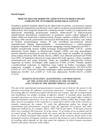 Dawid Ścigała PRZETWARZANIE BODŹCÓW AFEKTYWNYCH PRZEZ OFIARY I SPRAWCÓW WYPADKÓW KOMUNIKACYJNYCH Zasadniczy problem artykułu odnosił się do odpowiedzi na pytania: czy przeżycie sytuacji zagrażających integralności psychicznej i życiu wpływa na proces przypominania bodźców afektywnych, które mogą być skojarzone z minioną traumą? A także czy temperament oraz aleksytymia modyfikują przetwarzanie bodźców afektywnych? O właściwościach zakodowanych doświadczeń wnioskowano na podstawie czasów reakcji badanych na bodźce afektywne skojarzone z minioną traumą. Przyjęto, zgodnie z LeDoux (2002), że im silniejszy afekt (strach, przerażenie) towarzyszył doświadczeniu, tym krótszy czas reakcji na bodziec przypominający traumę. W celu weryfikacji poczynionych założeń zaprojektowano badanie eksperymentalno – kwestionariuszowe z wykorzystaniem programu Superlab 4.0. Ponadto wykorzystano następujące metody diagnostyczne SSS-V badanie poszukiwania doznań według koncepcji Zuckermana(1990); TAS-26 - pomiar aleksytymii Taylor, Bagby, za Maruszewski, Ścigała, (1998); oraz testy sprawdzające poziom zaburzeń pourazowych zależnie od okresu jaki minął od wypadku: do pomiaru ostrej reakcji stresowej ASD, Bryant, Harvey, (2003); oraz zaburzeń pourazowych PTSD, Foa (1995). W badaniach właściwych wzięły udział 104 osoby sprawcy i ofiary wypadków samochodowych oraz grupa kontrolna. Osoby po wypadkach zdecydowanie szybciej reagowały na bodźce wywołujące afekt negatywny U=668; p<0,001. Ponadto zgodnie z oczekiwaniami wykazano, że najkrótsze czasy reakcji na bodźce wywołujące afekt negatywny wystąpiły w grupie ofiar wypadków komunikacyjnych F(2,101)=6,934; p<0,01) η2= 0,12. Poza tym wykazano moderujący wpływ poszukiwania doznań w grupie badawczej F(2,98)= 4,4; p<0,05 η2= 0,28 oraz aleksytymii F(2,98)=10,672; p<0,001 η2=0,18. SEEKING SENSATION, ALEXITHYMIA AND PROCESSING OF THE AFFECTIVE STIMULI BY THE VICTIMS AND CAUSES OF THE MOTOR VEHICLE ACCIDENT The aim of the experimental and questionnaire research was to look for the answer to the question concerning the influence of previous experience - traumatic in character - on processing affective stimuli associated with the previous trauma. And also if temperament and alexithymia can modify recalling of affective stimuli? It conclude about specificity encoded experiences on base of time reaction of examined on the stimuli affect related to departed traumatic experiences. It set up, according to LeDoux (2002) that stronger affect (fear, horror) accompany to the experience is connected to shorter time of the reaction on stimulus reminiscent the trauma. To verify this affirmations author has design the experimental and questionnaire research using the Superlab 4.0 program and other diagnostic methods as, for example, SSS-V, ASD, TAS-26 and others. At the main research there were examined 104 of person, 34 of the causes, 32 of victims of car accidents and 38 of control group. The participants both, the causes and the victims reacted considerably faster on stimuli associated with trauma. The results of the research clearly point to the permanent existence of negative emotions caused by the trauma as well as the phenomenon of recalling which depends on the state under the influence of which trauma associated stimuli cause faster reactions of the subject. Transport Samochodowy 1-2012 1. Wypadki drogowe jako przyczyna zaburzeń emocjonalnych i pourazowych W krajach europejskich wypadki drogowe są szóstą przyczyną inwalidztwa i trzynastą spośród najczęstszych przyczyną śmierci. Badania wykazują ponadto, że niemal u jednej piątej ofiar wypadków można zdiagnozować ostrą reakcję stresową, zaś jedna czwarta wykazuje problemy psychiczne w okresie roku od zdarzenia (Bryant, i współ., 2003, Mayou, i współpr. 2001)[6]; [24]. Według danych brytyjskich i amerykańskich, właśnie wypadki komunikacyjne są najczęstszą przyczyną wielu zaburzeń emocjonalnych, w tym zaburzeń po stresie traumatycznym (posttraumatic stress disorder PTSD)1. Światowa Organizacja Zdrowia (WHO) przewiduje, że do 2020 roku wypadki drogowe staną się najczęstszą przyczyną przedwczesnej śmierci. Wystarczy przywołać statystyki Komendy Głównej Policji za rok 2007: liczna wypadków 49536; ofiary śmiertelne 5583, osoby ranne 63 224; kolizji drogowych było 386934. Raport Komisji Europejskiej z 2006 roku na temat stanu bezpieczeństwa na drogach europejskich nie zostawia złudzeń. W Polsce w wypadkach drogowych ginie prawie tyle samo osób co w liczących 80 mln mieszkańców Niemczech. Z danych Komendy Głównej Policji wynika, że za przyczyny wypadków najczęściej uznawane są: niedostosowanie prędkości do panujących warunków na drodze, a ściślej rzecz biorąc zbyt duża prędkość połączona z agresywną jazdą, wymuszanie pierwszeństwa przejazdu, nieprawidłowe wyprzedzanie, w dalszej kolejności także jazda pod wpływem alkoholu. Do przyczyn niejako uzupełniających zaliczono: rozmowy przez telefon komórkowy, jazda do „upadłego”, czyli bez przerw oraz ignorowanie elementarnych zasad bezpieczeństwa, tzn. brak zapiętych pasów, brak sygnalizowania zmiany pasa ruchu oraz wysoka samoocena prowadzących pojazdy. Niebezpieczeństwo związane z uczestniczeniem w wypadkach komunikacyjnych wiąże się z jednej strony z poważnymi zaburzeniami stanu zdrowia fizycznego i psychicznego ofiar i ich rodzin, a z drugiej z tym, iż zarówno sprawcy jak i ofiary dalej są aktywnymi kierowcami. Traumatyczne doświadczenie to nie tylko realne określone czasowo zaburzenia lękowe, depresyjne czy nastroju. Dla takiego kierowcy pamięć traumatycznych doświadczeń to również nie intencjonalne zachowania w sytuacjach nowych, mogące uruchomić lawinę reakcji i zachowań, przypominających minioną traumę. Wystarczy, że pojawi się bodziec, który zostanie skojarzony z sytuacją wypadku (Bryant