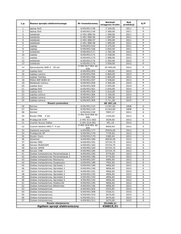 L.p. Nazwa sprzętu elektronicznego Nr inwentarzowy Wartość księgowa brutto Rok produkcji S/P 1 laptop Dell 4/49/491/148 3 340,00 2011 P 2 laptop Dell 4/49/491/149 3 360,00 2011 P 3 notebook 2-491-006-05 1 490,00 2011 P 4 notebook 2-491-006-06 1 097,89 2011 P 5 notebook 2-491-006-07 1 495,00 2011 P 6 notebook 2-491-006-08 1 950,00 2011 P 7 Laptop 4/49/491/163 2 275,00 2011 P 8 Laptop 4/49/491/166 2 835,00 2011 P 9 notebook 4/49/491/171 2 782,58 2012 P 10 Laptop 4/49/491/172 2 538,00 2012 P 11 Laptop 4/49/491/173 2 688,00 2012 P 12 notebook 4/49/491/175 2 293,00 2012 P 13 notebook 3 928,00 2012 P 14 Sprawdzarka SKB-3 20 000,00 2012 P 15 Laptop Acer 4/49/491/176 2-491-017-001 do 020 4/49/491/293 1 300,81 2012 P 16 Laptop Lenovo 4/49/491/295 5 865,00 2013 P 17 Laptop Toshiba 4/49/491/296 2 805,00 2013 P 18 Pidion BIP-6000 AJ 4/49/491/297 3 548,82 2013 P 19 Notebook Lenovo 4/49/491/299 3 505,00 2014 P 20 Laptop Acer 4/49/491/300 2 655,00 2014 P 21 Laptop Dell 4/49/491/301 2 644,00 2014 P 22 Laptop Acer 4/49/491/304 2 610,00 2014 P 23 Laptop Lenovo 4/49/491/306 3 100,00 2015 P 24 Laptop Lenovo 4/49/491/307 2 390,00 2015 P 25 Laptop Lenovo 4/49/491/309 2 711,00 2015 P 20 szt Razem przenośny 85 207,10 26 Serwer 4/49/491/123 11187,00 2008 S 27 Serwer 4/49/491/124 31163,00 2008 S 28 Serwer 7897,17 2011 S 29 Router PSB 1420,00 2012 S 30 Przełącznik KVM 4/49/491/150 2-491-010-006 do 009 2-491-011-003 3039,00 2012 S 31 Czytnik Kluczy Dallas 391,18 2012 S 32 Czytnik biletów KRG-7 4 szt 8000,00 2012 S 33 Zasilanie awaryjne 2-491-016-001 2-491-018-001 do 004 4/49/491/177 25935,00 2012 S 34 Przełącznik HP 4/49/491/178 7749,00 2012 S 35 Router Cisco 4/49/491/179 5380,00 2012 S 36 Streamer 4/49/491/180 28526,00 2012 S 37 Serwer DB2 4/49/491/181 33724,75 2012 S 38 Serwer MUNICOM 4/49/491/182 33724,75 2012 S 39 Serwer WWW 4/49/491/183 33724,75 2012 S 40 Serwer CNR 4/49/491/184 33724,75 2012 S 41 Zestaw komputerowy Personalizacja 1 4/49/491/185 9770,00 2012 S 42 Zestaw komputerowy Personalizacja 2 4/49/491/186 9770,00 2012 S 43 Zestaw komputerowy Rewizorzy 4/49/491/187 4856,00 2012 S 44 Zestaw komputerowy Dyspozytor 4/49/491/188 7902,00 2012 S 45 Zestaw komputerowy Sprzedaż 1 4/49/491/189 4856,00 2012 S 46 Zestaw komputerowy Sprzedaż 2 4/49/491/190 4856,00 2012 S 47 Zestaw komputerowy Sprzedaż 3 4/49/491/191 4856,00 2012 S 48 Zestaw komputerowy Sprzedaż 4 4/49/491/192 4856,00 2012 S 49 Zestaw komputerowy Sprzedaż 5 4/49/491/193 4856,00 2012 S 50 Zestaw komputerowy Sprzedaż 6 4/49/491/194 4856,00 2012 S 51 Zestaw komputerowy Analiza ES 4/49/491/195 4856,00 2012 S 52 Zestaw komputerowy Biletomaty 4/49/491/196 4856,00 2012 S 53 Zestaw komputerowy 4/49/491/302 2545,85 2014 S 54 Zestaw komputerowy 4/49/491/308 4320,01 2015 S 55 Zestaw komputerowy 4/49/491/310 2670,00 2015 S 56 Zestaw komputerowy 4/49/491/311 2670,00 2015 S 57 Zestaw komputerowy Razem stacjonarny 4/49/491/312 2670,00 2015 S 4 szt Ogółem sprzęt elektroniczny 351608,21 436815,31
