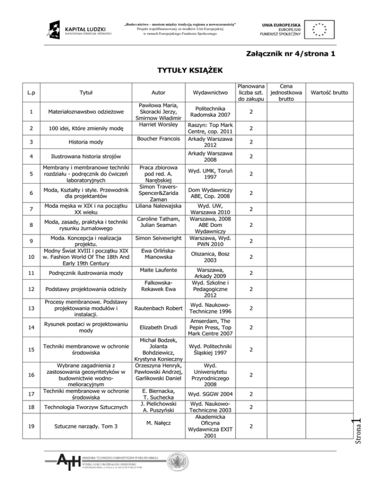 „Budownictwo – mostem między tradycją regionu a nowoczesnością” Projekt współfinansowany ze środków Unii Europejskiej w ramach Europejskiego Funduszu Społecznego Załącznik nr 4/strona 1 TYTUŁY KSIĄŻEK 1 Materiałoznawstwo odzieżowe 2 100 idei, Które zmieniły modę 3 Historia mody 4 Ilustrowana historia strojów 5 Membrany i membranowe techniki rozdziału - podręcznik do ćwiczeń laboratoryjnych 6 Moda, Kształty i style. Przewodnik dla projektantów 7 Moda męska w XIX i na początku XX wieku 8 Moda, zasady, praktyka i techniki rysunku żurnalowego 9 10 Moda. Koncepcja i realizacja projektu. Modny Świat XVIII i początku XIX w. Fashion World Of The 18th And Early 19th Century Autor Pawłowa Maria, Skoracki Jerzy, Smirnow Władimir Harriet Worsley Boucher Francois Praca zbiorowa pod red. A. Narębskiej Simon TraversSpencer&Zarida Zaman Liliana Nalewajska Caroline Tatham, Julian Seaman Simon Seivewright Ewa OrlińskaMianowska Maite Laufente Wydawnictwo Planowana liczba szt. do zakupu Politechnika Radomska 2007 2 Raszyn: Top Mark Centre, cop. 2011 Arkady Warszawa 2012 2 2 Wyd. UMK, Toruń 1997 2 Dom Wydawniczy ABE, Cop. 2008 2 Olszanica, Bosz 2003 Warszawa, Arkady 2009 Wyd. Szkolne i Pedagogiczne 2012 2 2 2 2 11 Podręcznik ilustrowania mody 12 Podstawy projektowania odzieży 13 Procesy membranowe. Podstawy projektowania modułów i instalacji. Rautenbach Robert Wyd. NaukowoTechniczne 1996 2 14 Rysunek postaci w projektowaniu mody Elizabeth Drudi Amserdam, The Pepin Press, Top Mark Centre 2007 2 15 Techniki membranowe w ochronie środowiska Wyd. Politechniki Śląskiej 1997 2 Wyd. Uniwersytetu Przyrodniczego 2008 2 Wyd. SGGW 2004 2 16 17 Wybrane zagadnienia z zastosowania geosyntetyków w budownictwie wodnomelioracyjnym Techniki membranowe w ochronie środowiska 18 Technologia Tworzyw Sztucznych 19 Sztuczne narządy. Tom 3 FalkowskaRekawek Ewa Michał Bodzek, Jolanta Bohdziewicz, Krystyna Konieczny Orzeszyna Henryk, Pawłowski Andrzej, Garlikowski Daniel E. Biernacka, T. Suchecka J. Pielichowski A. Puszyński M. Nałęcz Wyd. NaukowoTechniczne 2003 Akademicka Oficyna Wydawnicza EXIT 2001 Wartość brutto 2 Arkady Warszawa 2008 Wyd. UW, Warszawa 2010 Warszawa, 2008 ABE Dom Wydawniczy Warszawa, Wyd. PWN 2010 Cena jednostkowa brutto 2 2 2 2 1 Tytuł Strona L.p „Budownictwo – mostem między tradycją regionu a nowoczesnością” Projekt współfinansowany ze środków Unii Europejskiej w ramach Europejskiego Funduszu Społecznego Załącznik nr 4/strona 2 20 Biomateriały. Tom 4 21 Sieci Neuronowe. Tom 6 22 Systemy komputerowe i teleinformatyczne w służbie zdrowia. Tom 7 23 Obrazowanie biomedyczne. Tom 8. 24 Fizyka medyczna. Tom 9 27 Nanomateriały inżynierskie – konstrukcyjne i funkcjonalne. 28 Nanotechnologie. 29 Mechanika Budowli. Teoria i przykłady M. Nałęcz M. Nałęcz M. Nałęcz W. Królikowski, W. Biedunkiewicz Red. Naukowa J. Kijeński Red. naukowa: K. Kurzydłowski, M. Lewandowska Red. naukowa: R.W. Kelsall, I.W. Hamley, M. Geoghegan Paluch Marian 2 2 2 2 2 PWN 2012 2 PWN 2011 2 PWN 2011 2 PWN 2012 2 Wyd. AGH 2 Razem wartość brutto: ..................................................... (Data) ……………………………………………………….. (Podpis i pieczęć osoby upoważnionej do składania oświadczeń w imieniu Wykonawcy) 2 26 Polimerowe kompozyty konstrukcyjne. Odzysk i recykling materiałów polimerowych M. Nałęcz Akademicka Oficyna Wydawnicza EXIT 2003 Akademicka Oficyna Wydawnicza EXIT 2000 Akademicka Oficyna Wydawnicza EXIT 2002 Akademicka Oficyna Wydawnicza EXIT 2003 Akademicka Oficyna Wydawnicza EXIT 2002 Strona 25 M. Nałęcz
